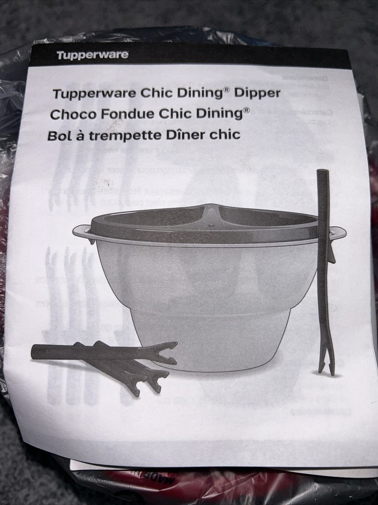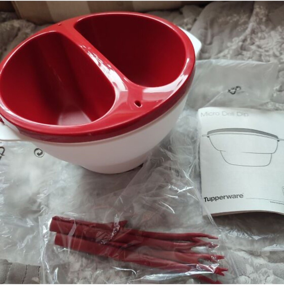 Elevate your dining experience with this chic Tupperware dipper bowl set, complete with red forks and a seal for fondue cheese. The set includes 6 pieces, with 4 compartments and 2 tiers to separate and organize your favorite dips and snacks. The round shape and pop art style add a fun and modern touch to your kitchen and dining table. Crafted from durable plastic, this original Tupperware fondue bowl set is perfect for any occasion, whether you're hosting a party or enjoying a cozy night in. Measuring 7.01 inches in length, 7.64 inches in height, and 6.61 inches in width, this large bowl features 4 slots to hold your favorite dips and sauces. Don't miss out on this stylish and functional addition to your kitchen storage and organization collection.