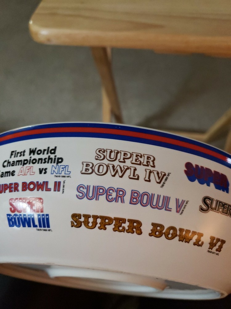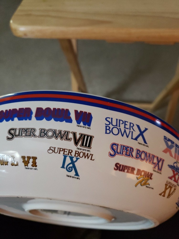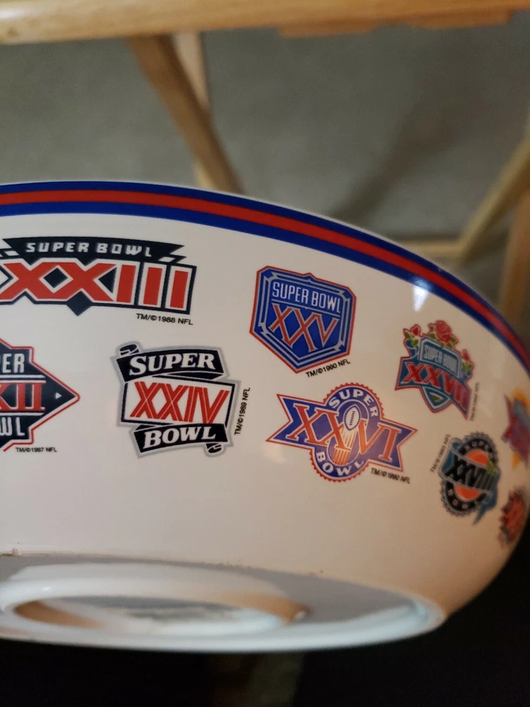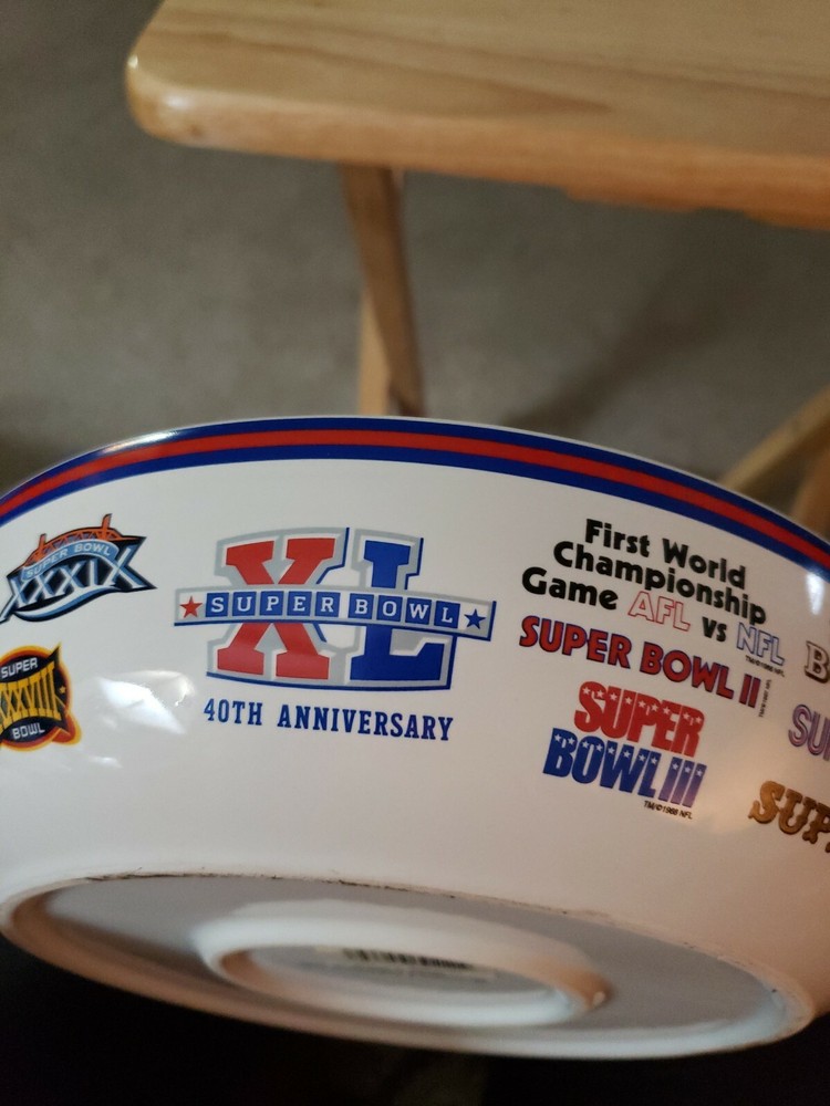 NFL~40 Superbowl Logos~10"Chip Bowl & 4.5" Dip Bowl Set~40th Anniversary~3 a Day(B48). Condition is Used. No Chips,Cracks or Repairs. See Photos for Details. Shipped USPS Priority Mail.