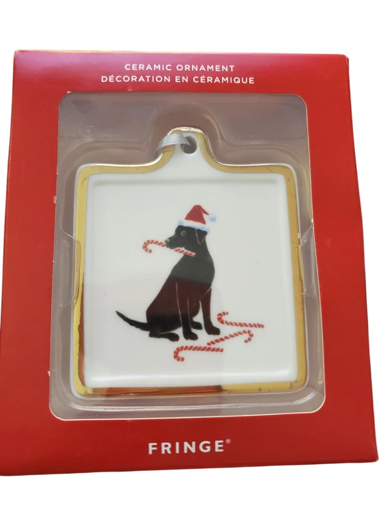 Brand new in box. Fringe Studio Black Labrador Square Ceramic ornament in White with Gold trim. Box may have very small cosmetic defects such as a scratch or crushed areas, but product is unaffected. Smoke-free environment.
