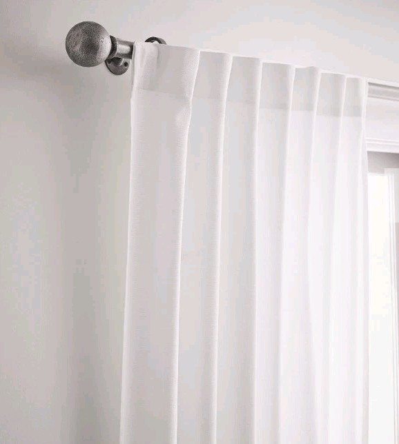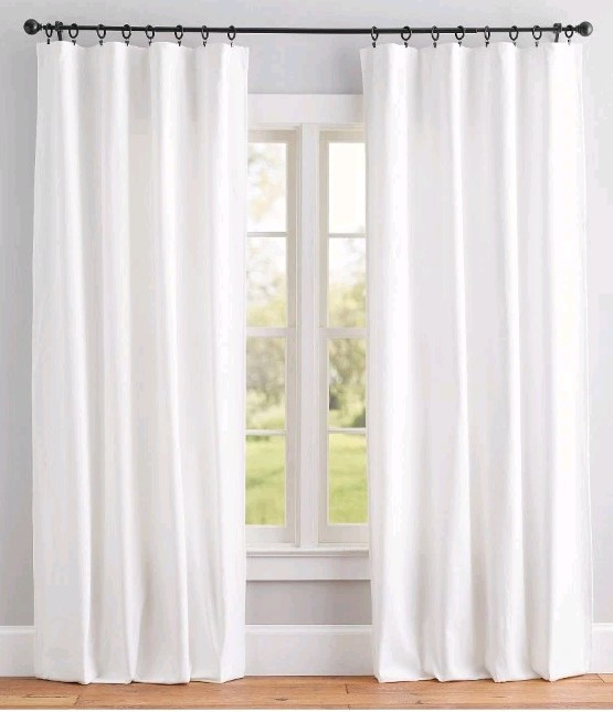This is a set of two Pottery Barn Broadway curtains in a modern style. They are light filtering and have a rod pocket heading for easy installation. The curtains are white in color, made of 100% cotton, and measure 127 x 213 cm (50 x 84 in). They are suitable for any room, feature a cordless design, and are machine washable for easy care.