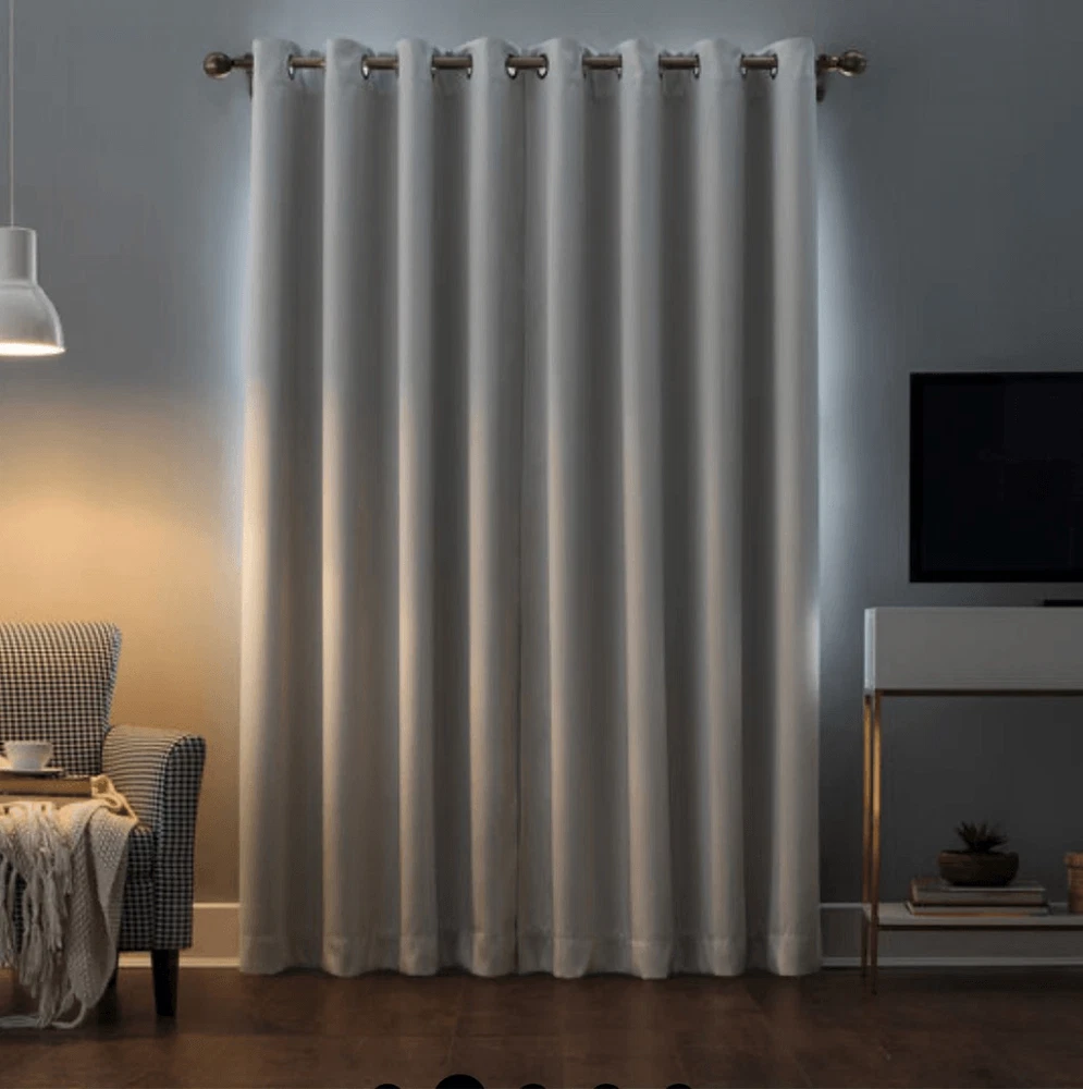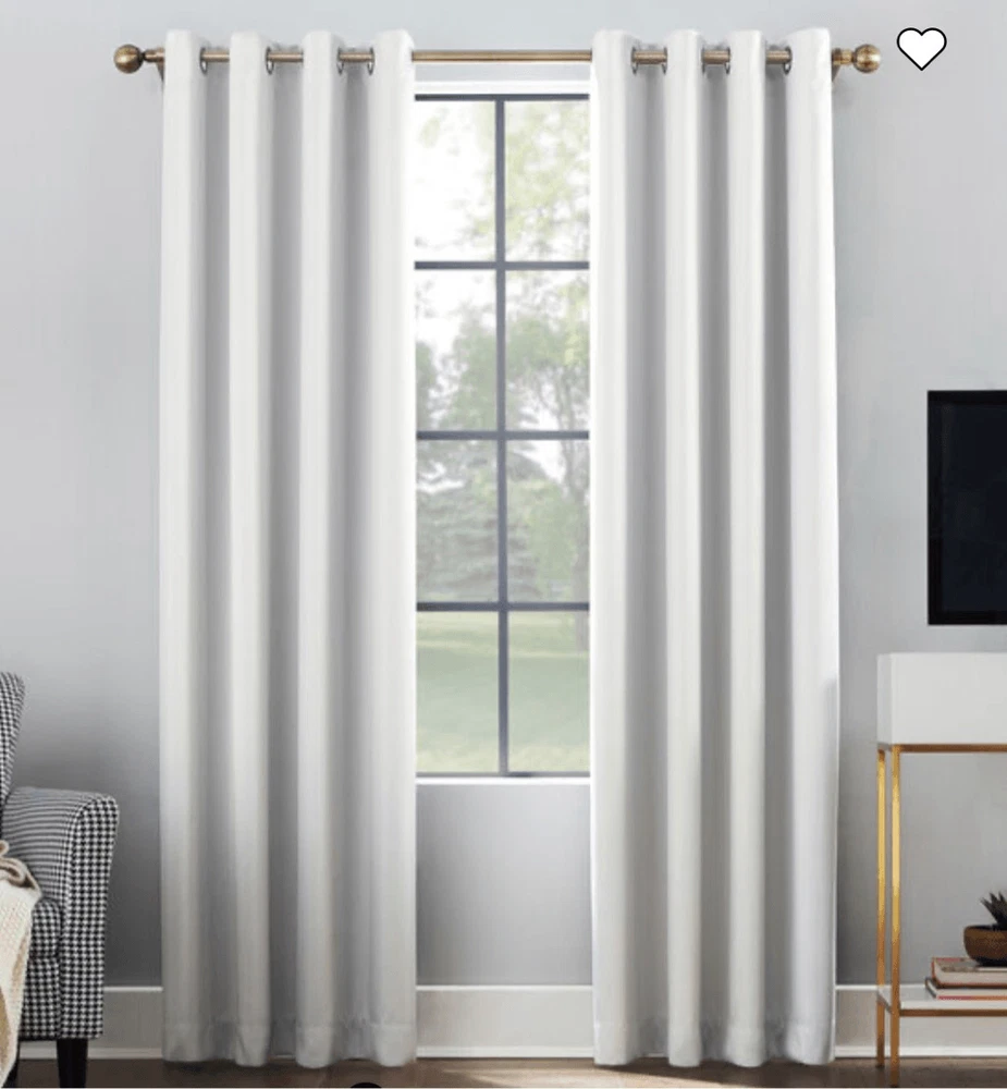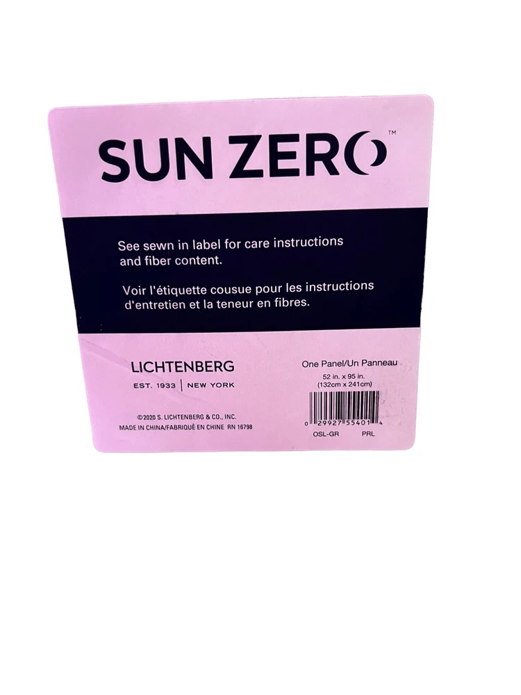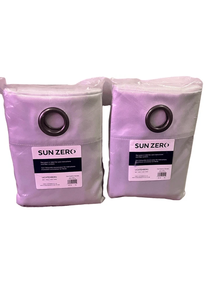 NIB Set of 2 Sun Zero Lichtenberg Pearl Blackout Grommet Curtain Panels. Grommet hanging style. Color of each panel is pearl, a cross between a white and light silver. With blackout technology to block out 100% of light, reduce sound, and is energy efficient. Approx measurements: 95” L X 52” W.