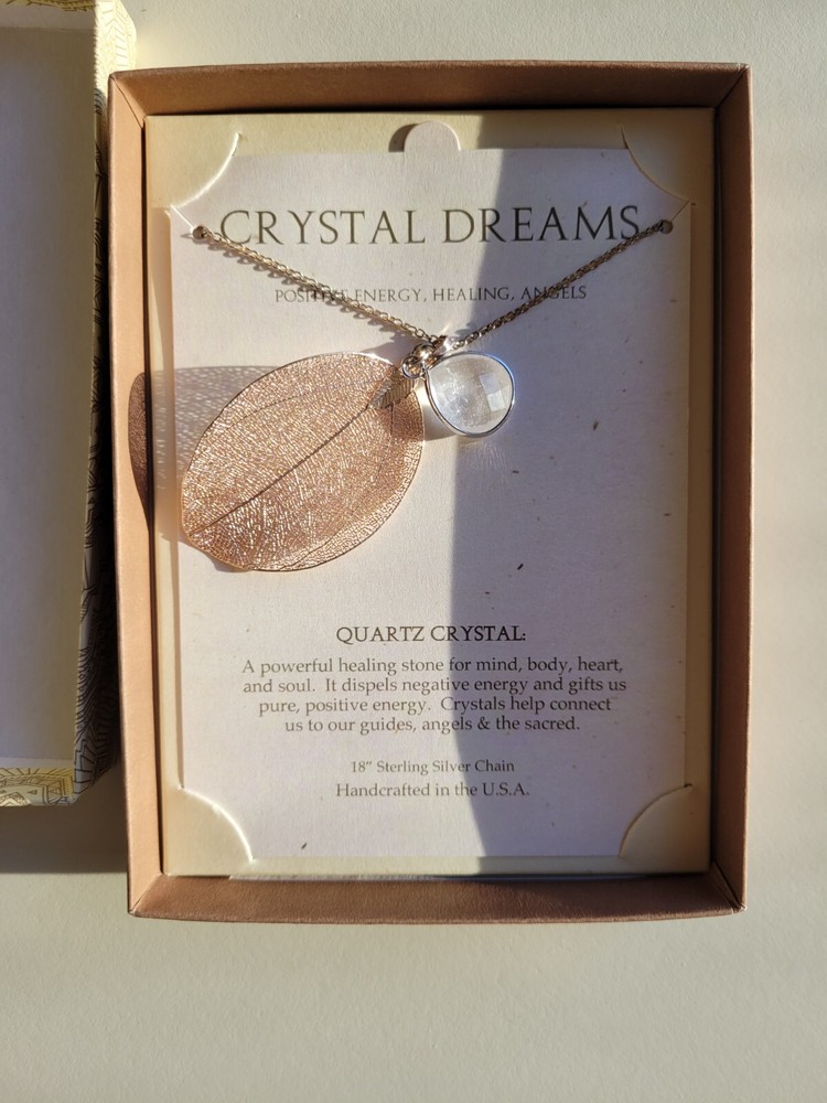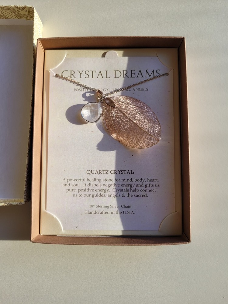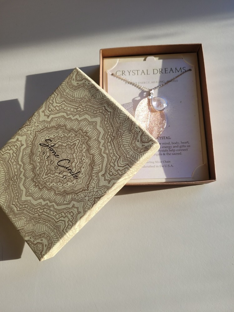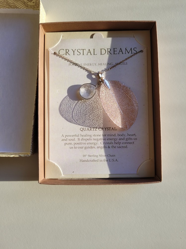 Elevate your jewelry collection with the Stone Circle Studio Crystal Dreams Necklace. Featuring a graceful leaf-shaped pendant, this sterling silver piece is meticulously crafted to showcase a natural quartz crystal, which sits elegantly within a setting that celebrates the earth's beauty. The 18-inch chain ensures a comfortable fit, resting at the collarbone and adding a subtle, yet impactful touch to any ensemble. The necklace is a blend of contemporary style with a touch of metaphysical healing energy, making it a unique accessory for those who appreciate the essence of natural stones. Designed and manufactured in the United States, this piece is a testament to quality and style, suitable for daily wear or special occasions.
