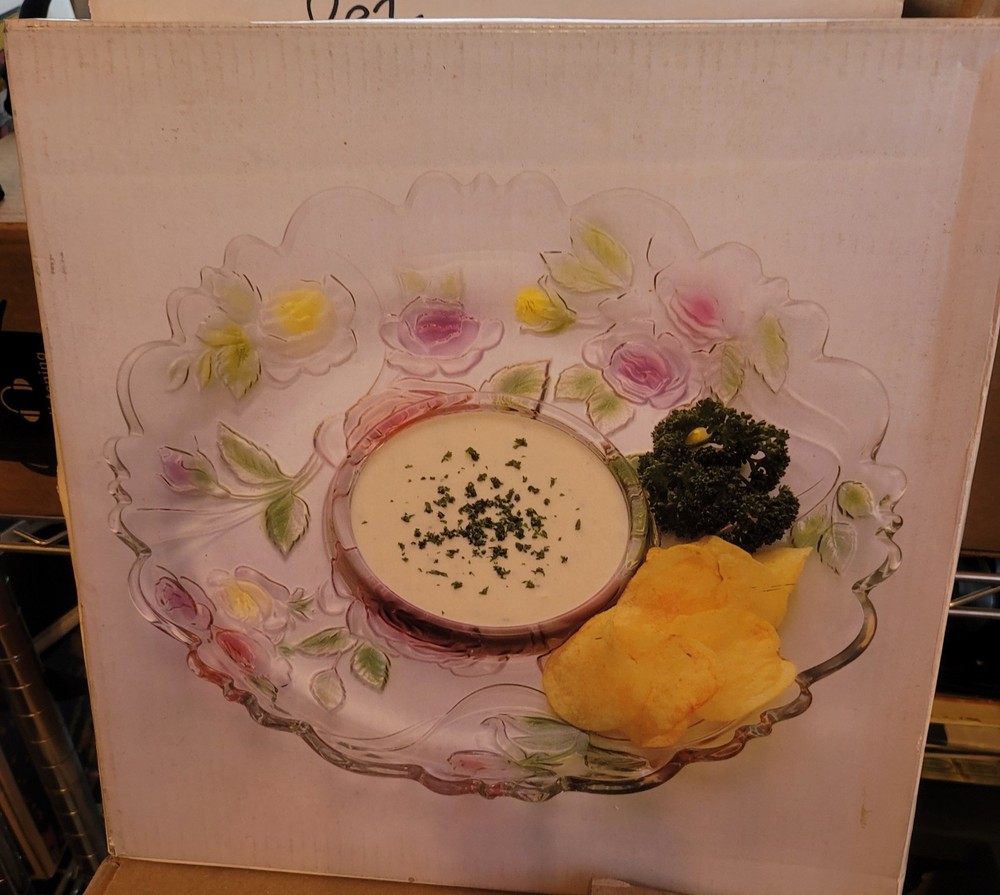 This gorgeous vintage chip platter is a must-have for any table setting! The delicate flower pattern and raised edges add elegance while keeping dips and snacks in place. The sturdy glass is both practical and stylish—perfect for parties or everyday use. I love how it effortlessly blends retro charm with modern functionality. A true timeless piece!
