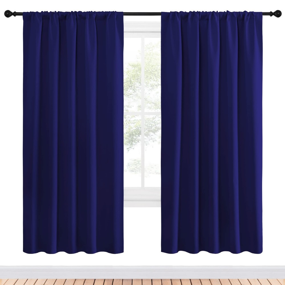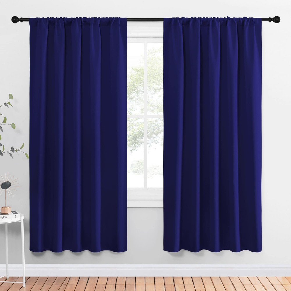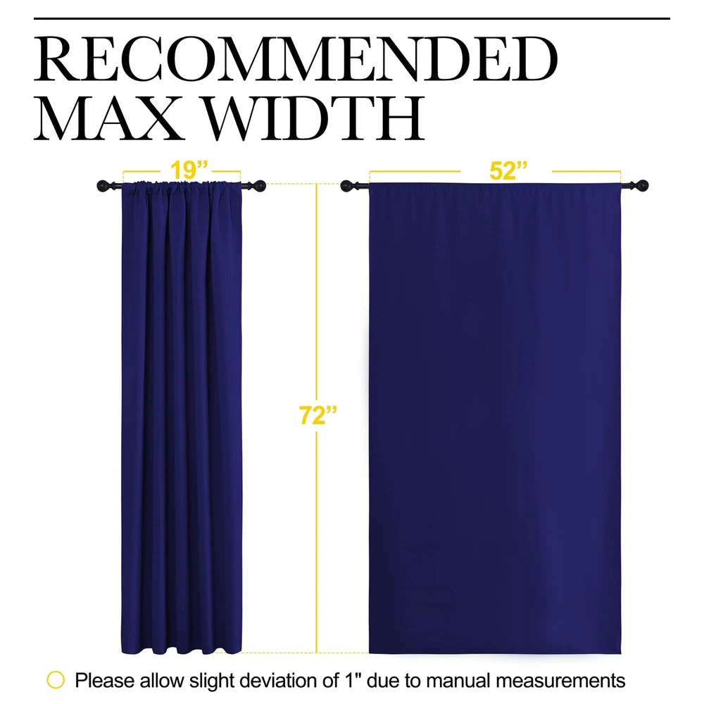 Product Page NICETOWN Bedroom Curtains Blackout Draperies - Thermal Insulated Solid Kitchen Description: Features: ELEGANT DESIGN: 2 panels per package. Each Blackout Curtain Panel measures 52 inches wide x 72 inches long. The NICETOWN drapery is constructed with rod pocket, fitting the curtain rod of your choice up to 2 inches in diameter, making the curtains easy to install and slide. LENGTH ADJUSTABLE: Don't worry if this blackout curtains are a few shorter than your windows. You can hang this curtain panels with rings and hooks. That could be adjustable for height max 3 inches. Hooks space distance around 4-6 inches. AMAZING MATERIAL: This unique, soft and heavy-duty blackout fabric is woven with three-layer construction. The middle layer of black yarns creates a curtain panel that is excellent for blocking out 85%-99% of light (Dark color works better on blocking light) while providing privacy. GOOD CHOICE: Perfect drapery option for anyone seeking to block daylight, take a nap, or keep sun glare off your TV. Besides, you can choose blackout valance and sheer curtains in the NICETOWN store to match. Such curtain sets provide a more permanent harmonious window dressing. EASY MAINTENANCE: Machine or hand washable. Mild detergent no bleaching. Low-temperature ironing. Measure your pole and window size before you choosing curtains.