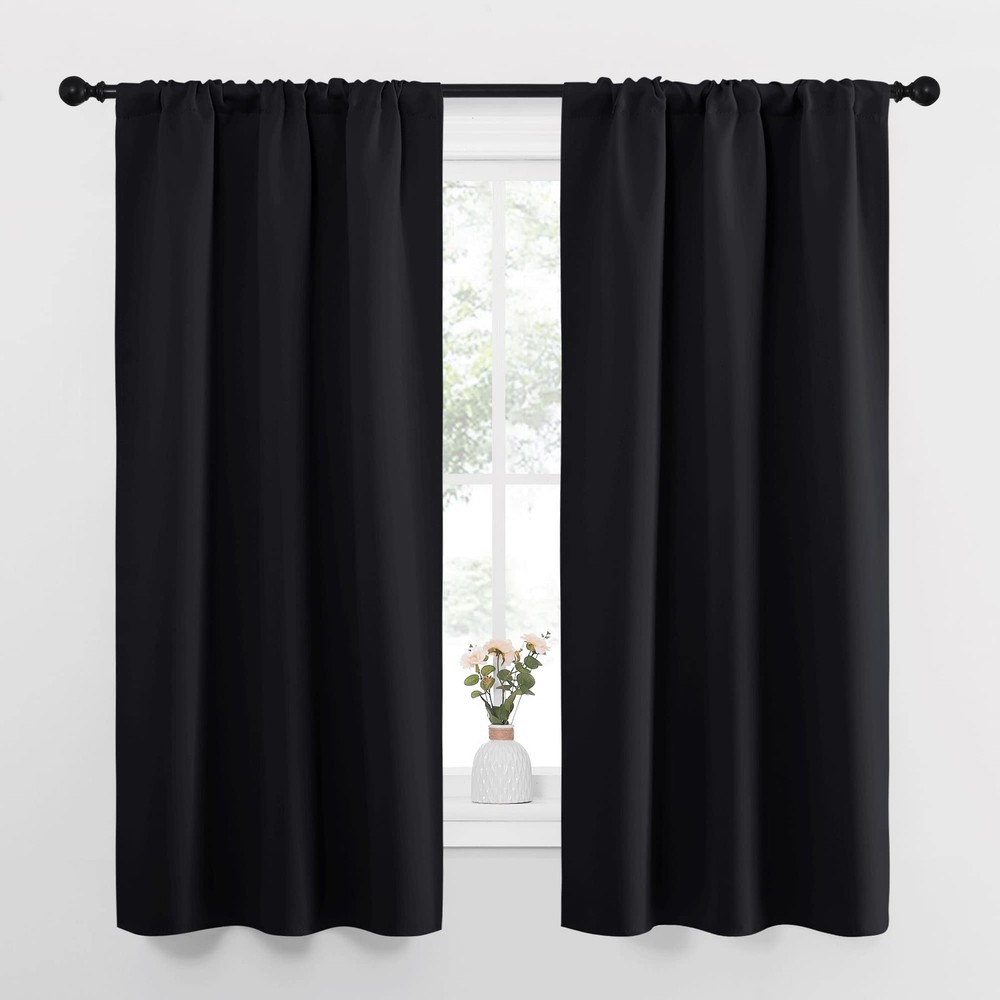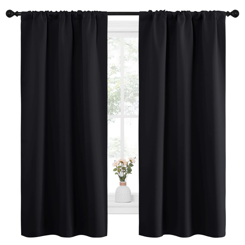 ELEGANT DESIGN: 2 panels per package. Each Blackout Curtain Panel measures 34 inches wide x 63 inches long. The drapery is constructed with rod pocket, fitting the curtain rod of your choice up to 2 inches in diameter, making the curtains easy to install and slide. LENGTH ADJUSTABLE: Don't worry if this blackout curtains are a few shorter than your windows. You can hang this curtain panels with rings and hooks. That could be adjustable for height max 3 inches. Hooks space distance around 4-6 inches. AMAZING MATERIAL: This unique, soft and heavy-duty blackout fabric is woven with three-layer construction. The middle layer of black yarns creates a curtain panel that is excellent for blocking out 85%-99% of light (Dark color works better on blocking light) while providing privacy. GOOD CHOICE: Perfect drapery option for anyone seeking to block daylight, take a nap, or keep sun glare off your TV. Besides, you can choose blackout valance and sheer curtains in the store to match. Such curtain sets provide a more permanent harmonious window dressing. EASY MAINTENANCE: Machine or hand washable. Mild detergent no bleaching. Low-temperature ironing. Measure your pole and window size before you choosing curtains.