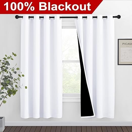 NICETOWN White Blackout Curtains 72 inches Long, Full Light Blocking Drapes with Black Liner for Nursery, Thermal Insulated Draperies for Hall, Villa (2 Pieces, 46" Wide Each Panel, Pure White) 72 inches long Brand NICETOWN Color Pure White Material Polyester, Polyester Blend Product Dimensions 72"L x 46"W Opacity Blackout Inches About this item Polyester READY MADE: 2 panels per package. Each Classic Lined Curtain measures 46" wide x 72" long (Total width is 92"). The unique design of silver grommet (1.6-inch inner diameter) creates casual elegance for your house, which makes the curtains easy to install and slide. 100% BLACKOUT: The real blackout curtains on the market. Sew in black liner backing makes the drapes thick enough to completely keep out the 100% SUNLIGHT and UV RAY. The greatest benefit is to offer you a real dark environment, bringing you a good night's sleep during the day. NOISE REDUCING: Heavyweight Blackout Lined Curtain Panels can be a good sense of drape, making the window completely closed, to achieve SOUNDPROOF. The effect of absorbing sound is 2 times higher than the ordinary 1-layer of curtains so that at any time you are not disturbed by noise.