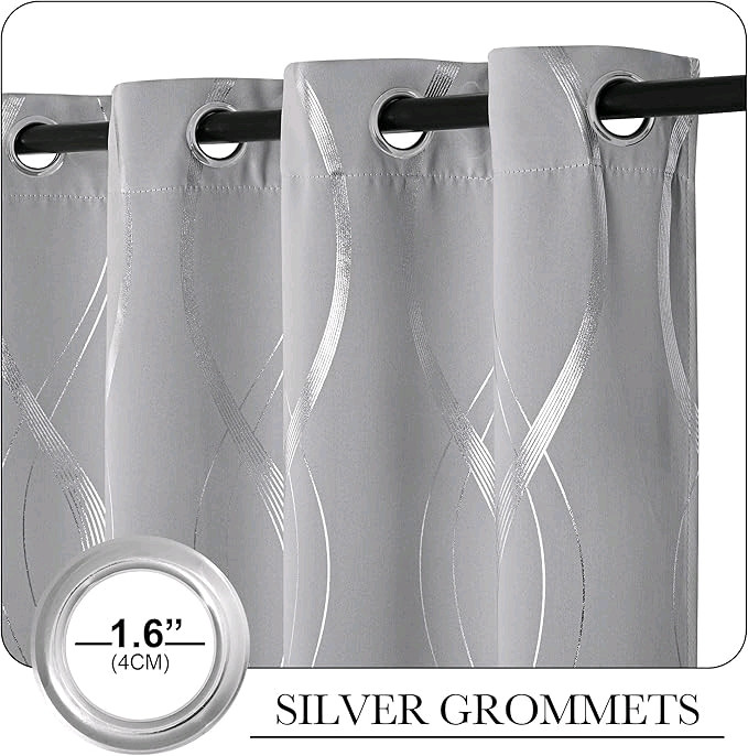 NICETOWN Kitchen Blackout Curtain Panels, Window Treatment Thermal Insulated Solid Grommet Blackout Wave Line Foil Print Design Curtains for Kitchen, Cafe, Loft (Silver Grey, Set of 2, 34 by 63 Inch)
