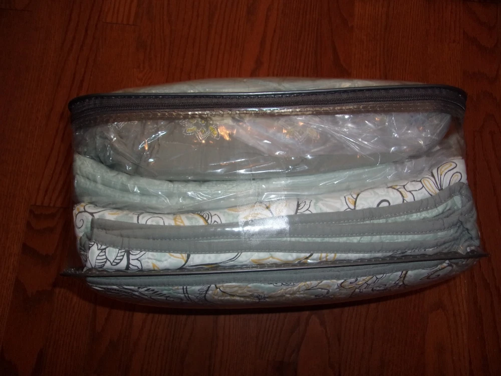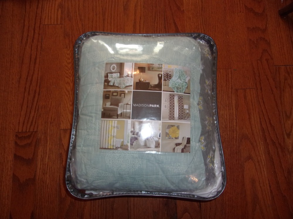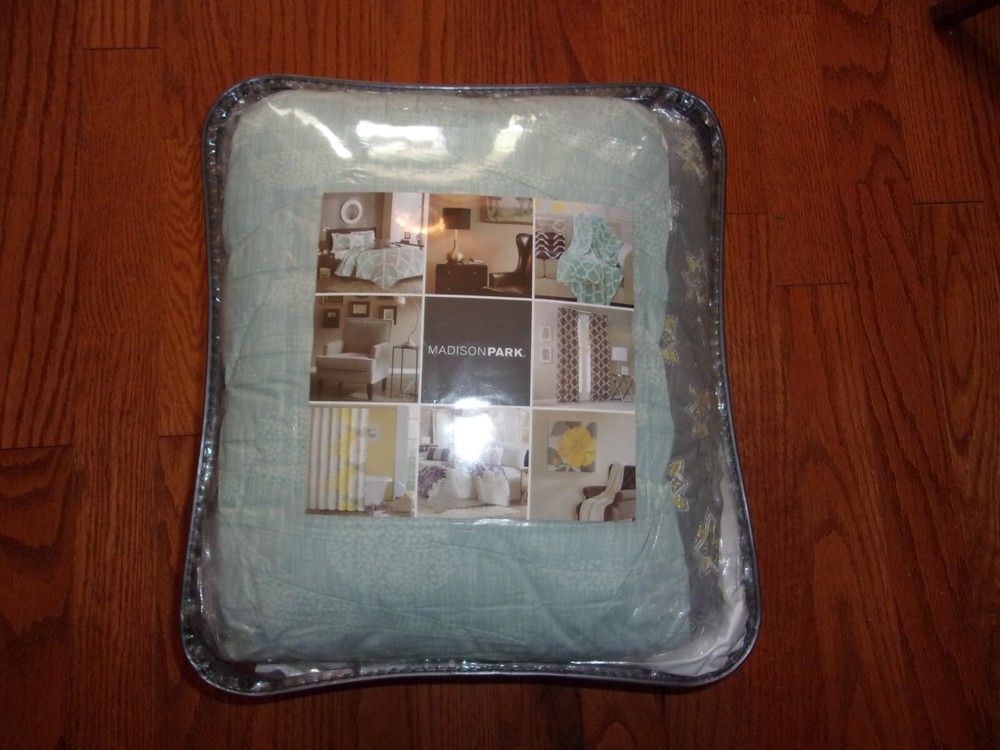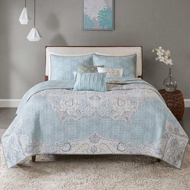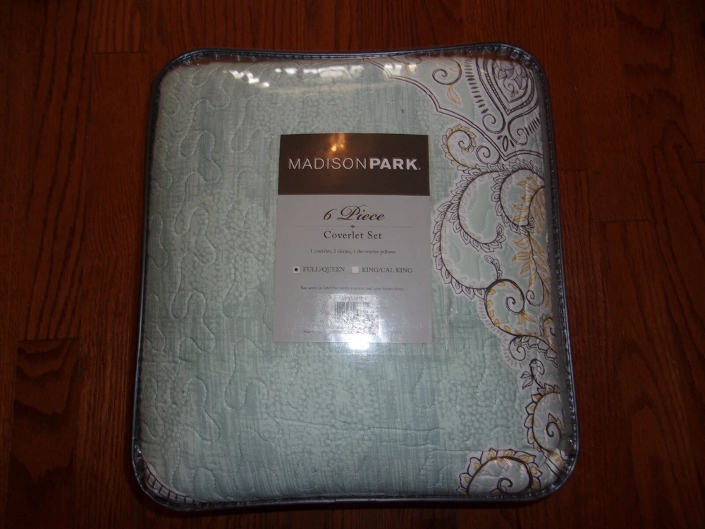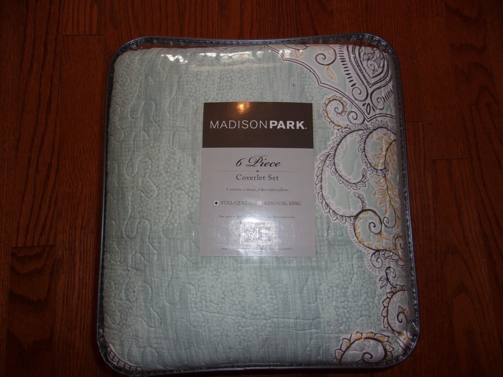 The Madison Park Lucinda 6 Piece Reversible Cotton Sateen Coverlet Set easily refreshes your bedroom décor. Completely reversible, this quilted coverlet features an over-scale printed medallion with delicate motifs in seafoam, white, and grey hues and a blue patterned reverse that creates a graceful look. Cotton rich filling within the coverlet boasts exceptional softness and warmth to keep you comfortable. The matching shams mirror the reverse of the coverlet for a beautiful coordinated ensemble, while three embroidered decorative pillows, in corresponding colors, add dimension and charm. With its globally inspired style, this cotton sateen coverlet set displays an elegant sheen and is machine washable for easy care. Collection : Lucinda Brand : Madison Park Division : Adult/Fashion Bedding Primary Color : Seafoam Primary Life Style : Global Inspired| UPC : 086569953315 Country Of Origin : China Material : cotton sateen, printed, cotton polyester crossweave reverse, 7oz/sq2 90% cotton, 10% other fiber filling, cotton crossweave shell decorative pillows Size Dimensions : Full/Queen 1 Coverlet: 90"W x 90"L 2 Standard Shams: 20"W x 26"L+ 0.5"D (2) 3 Decorative Pillows: 18"W x 18"L/12"W x 18"L/16"W x 16"L