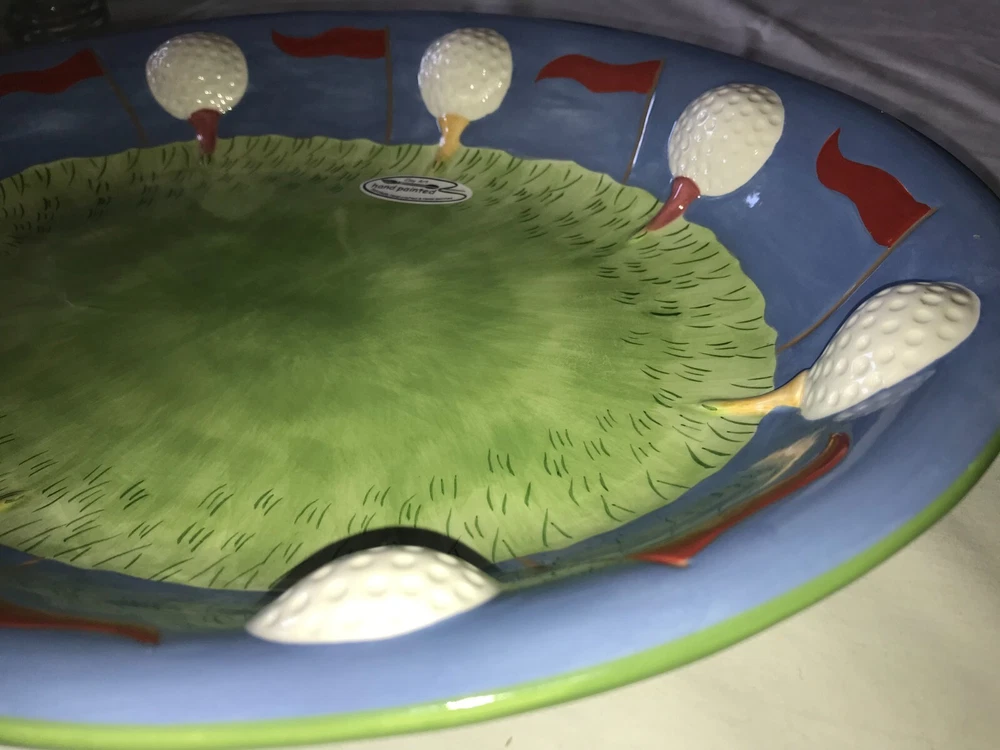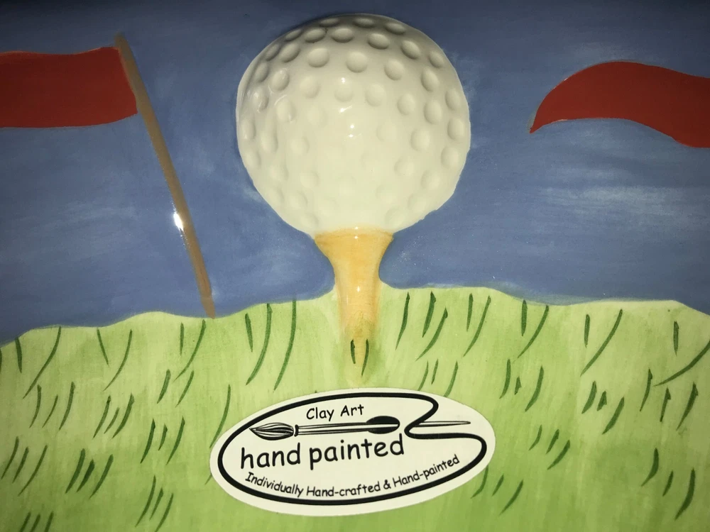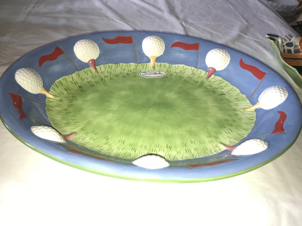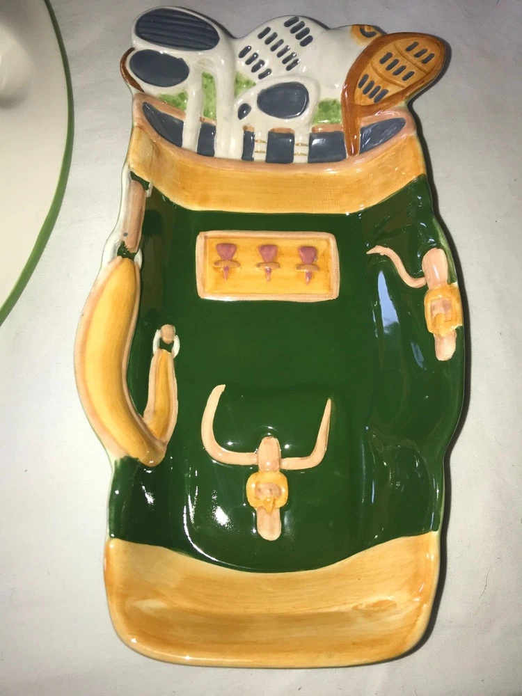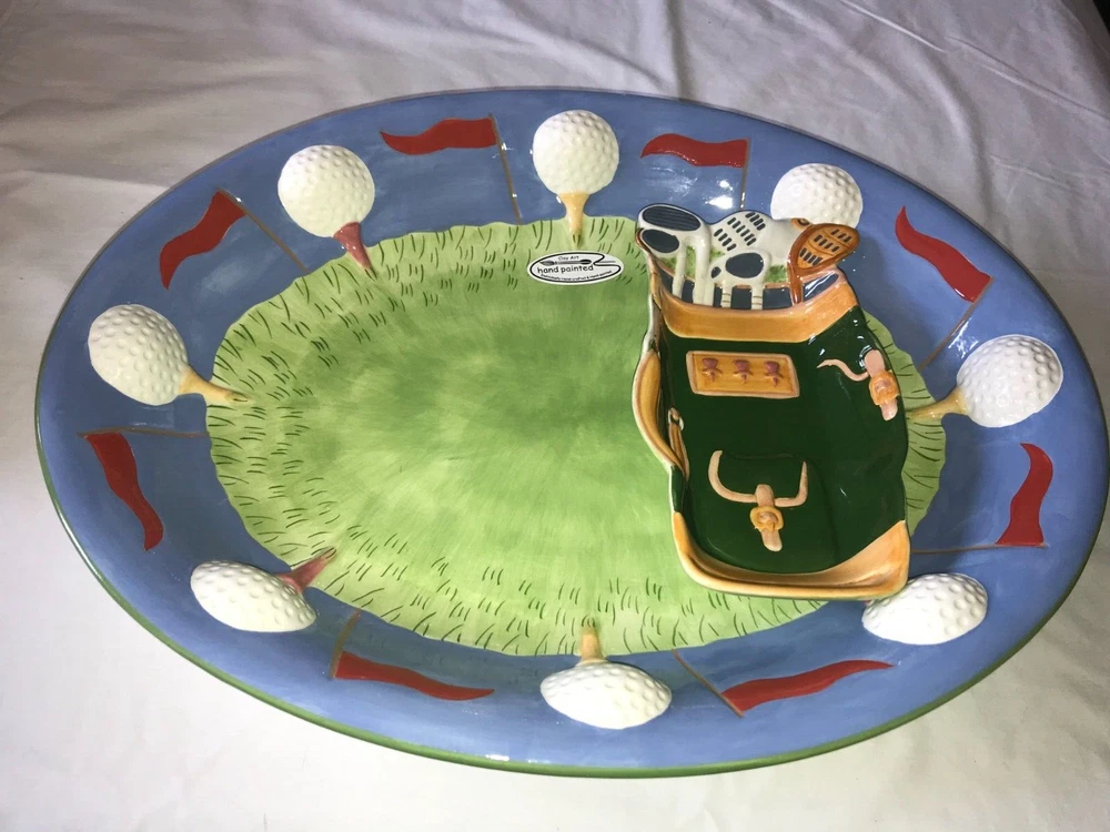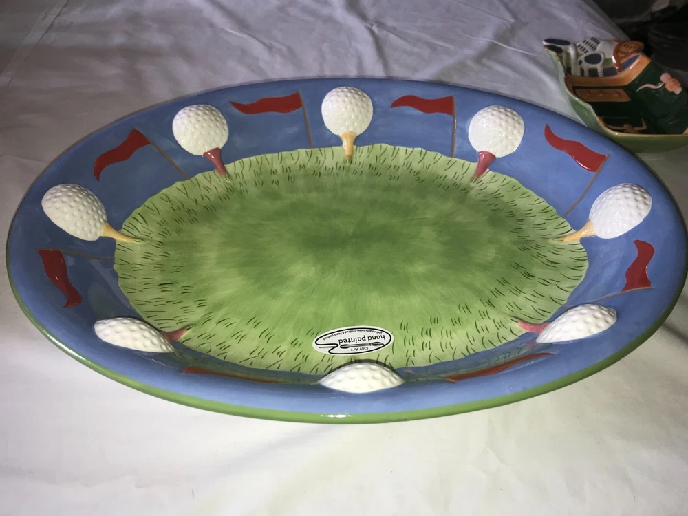 NOS 2pc CLAY ART 2001 Hand Painted GOLF Ball BAG Tee CHIP & DIP Serving PLATTER Set weighs nearly 5 pounds - No chips, cracks, damage, or wear - CLEAN - Comes from a smoke free home Oval Platter is 17½"x14"x2¼" Tall Golf Bag Bowl is 8¼"x4¾"x1½" Tall Ships via USPS Ground Advantage