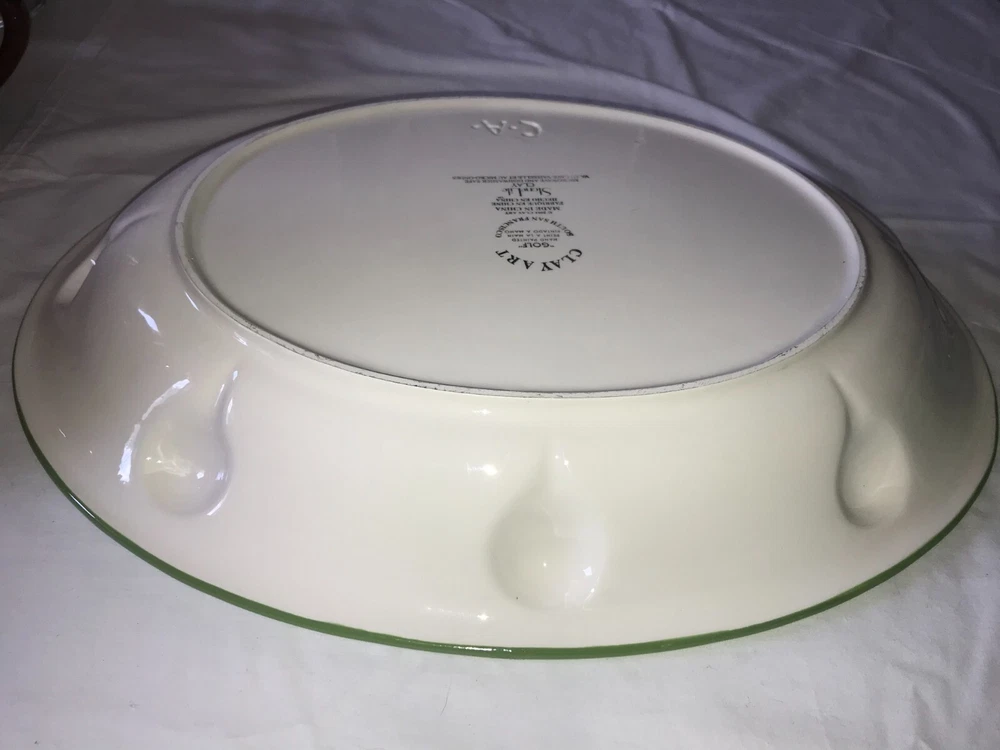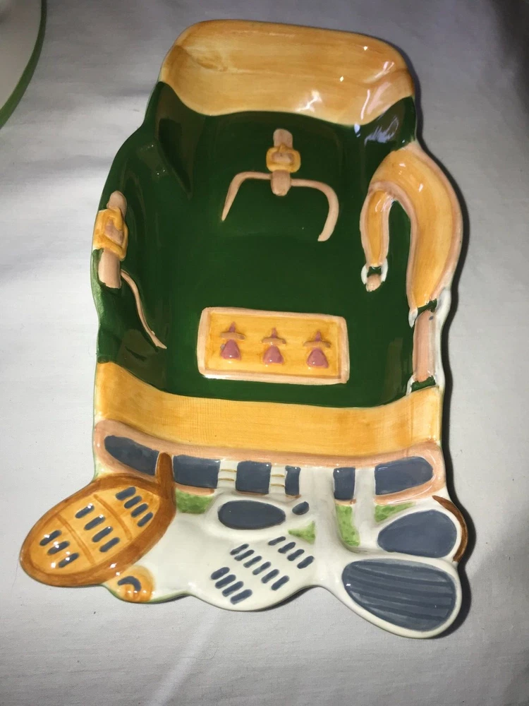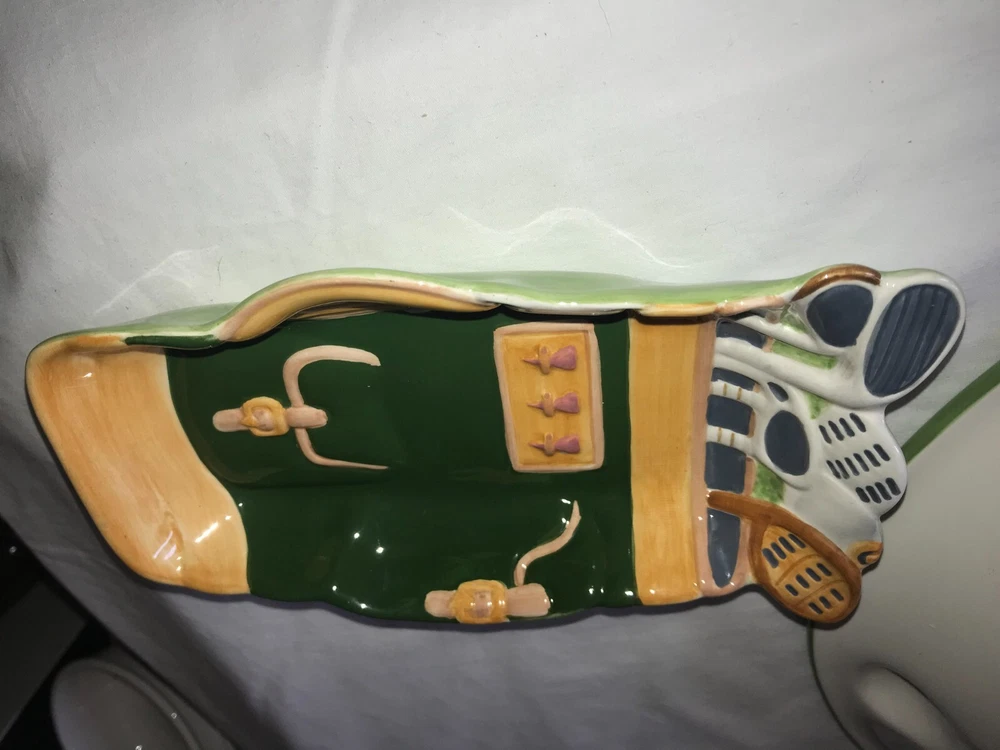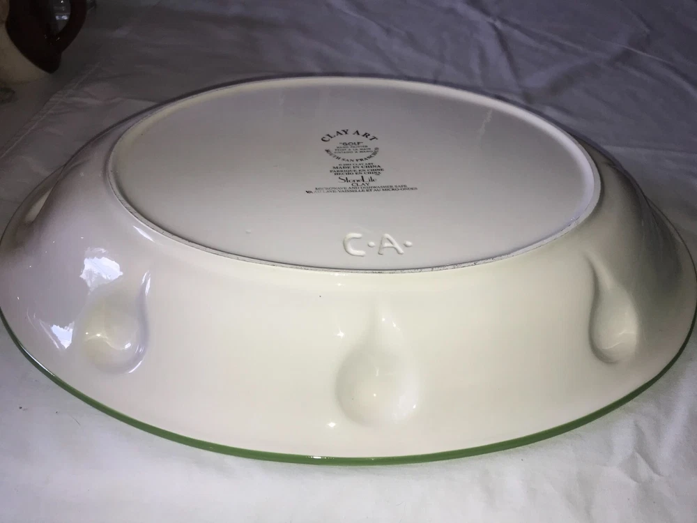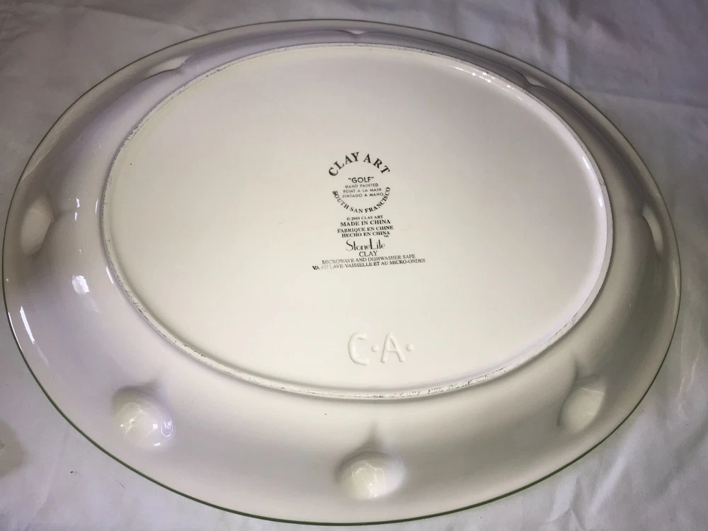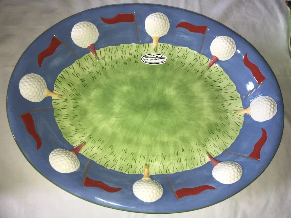 NOS 2pc CLAY ART 2001 Hand Painted GOLF Ball BAG Tee CHIP & DIP Serving PLATTER Set weighs nearly 5 pounds - No chips, cracks, damage, or wear - CLEAN - Comes from a smoke free home Oval Platter is 17½"x14"x2¼" Tall Golf Bag Bowl is 8¼"x4¾"x1½" Tall Ships via USPS Ground Advantage