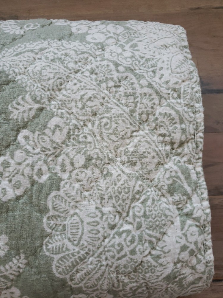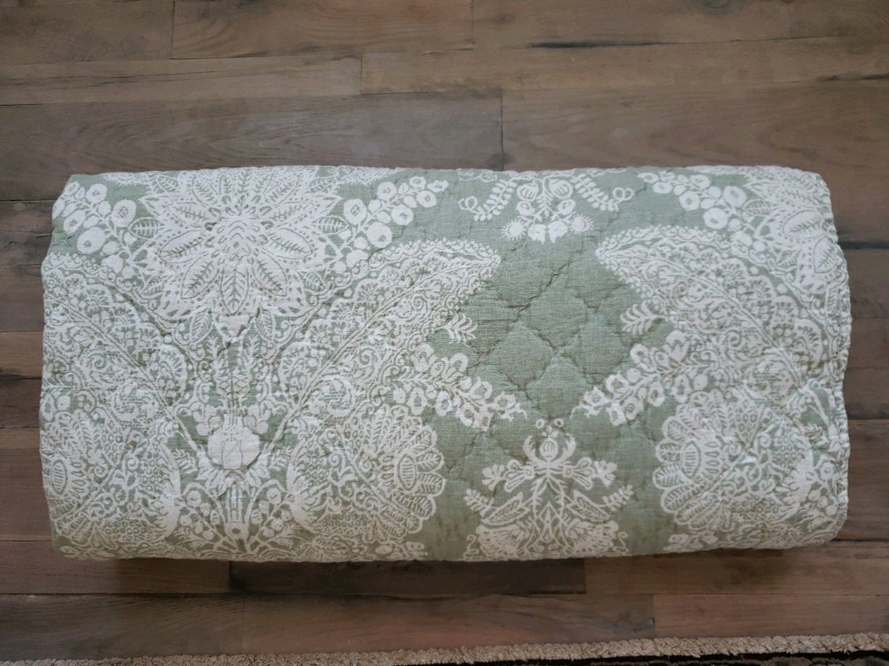 This is a Pottery Barn Kravet Heirloom Damask Reversible Quilt, King/Cal. King, MultiHeirloom The quilt is made of 100% cotton and features a Stella Damask pattern with an Under the Sea theme. It is a king size quilt that can also fit a California king bed. The quilted design adds an extra layer of comfort and style to any bedroom.