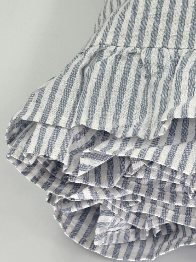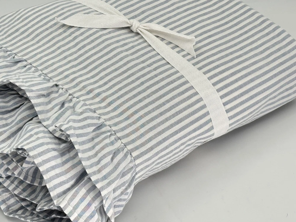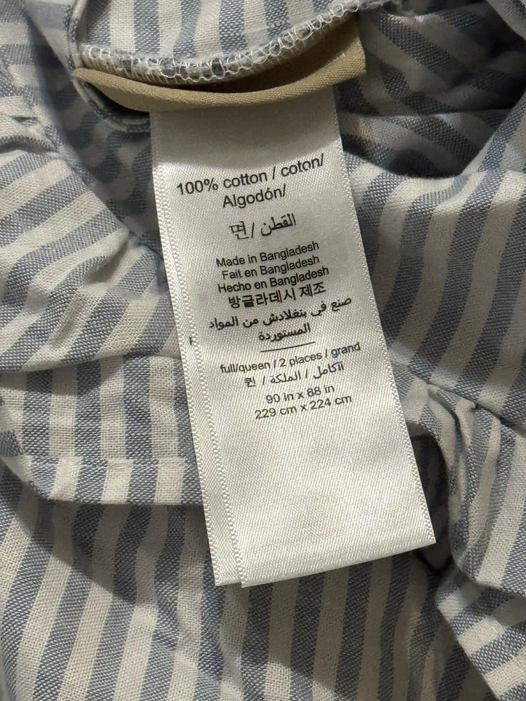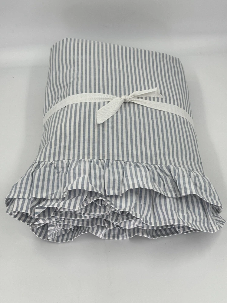 NWOT Pottery Barn Ruffle Stripe Queen Duvet Cover Light Blue/White This is an open box item. An Open Box item does not include any original packaging. Item is unused, but may arrive slightly more wrinkled than a packaged item and/or have stray hair or fibers. Made of 100% cotton. Yarn-dyed fiber has incredibly rich color that holds its vibrancy over time. Reverses to same. Duvet cover has interior ties and a button closure to keep the duvet in place. Full/Queen: 90" wide x 88" long