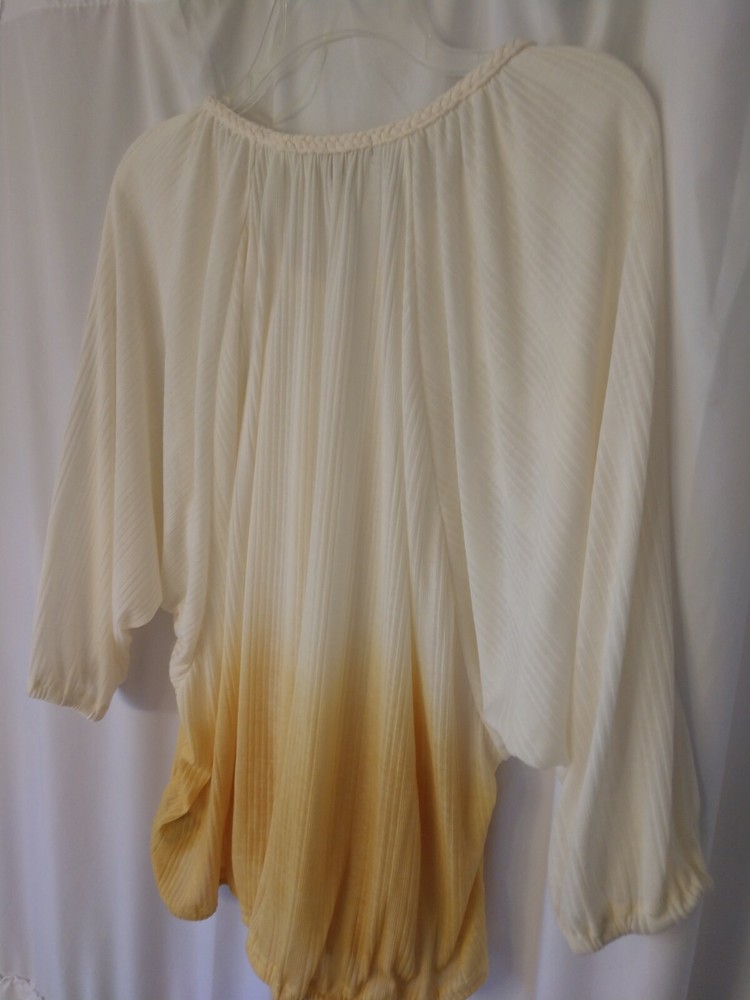 NWOT SEVEN BRAND PULL OVER YELLOW DIP DYE TOP. SCOOP NECK WITH BRAIDED ACCENT. 3/4 SLEEVE. PARTIAL ELASTIC WAIST WITH TASSEL TIE AT THE FRONT THAT YOU CAN MAKE TIGHT OR LOOSE. SIZE LARGE BUT HAS STRETCH. MACHINE WASH COLD. PURCHASED NEW BY ME BUT NEVER WORE. COMES FROM MY SMOKE-FREE HOME. PAYPAL ONLY. NO RETURNS.
