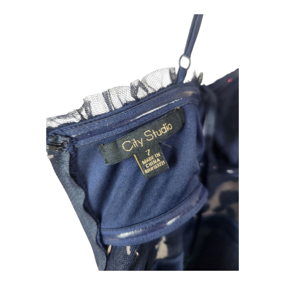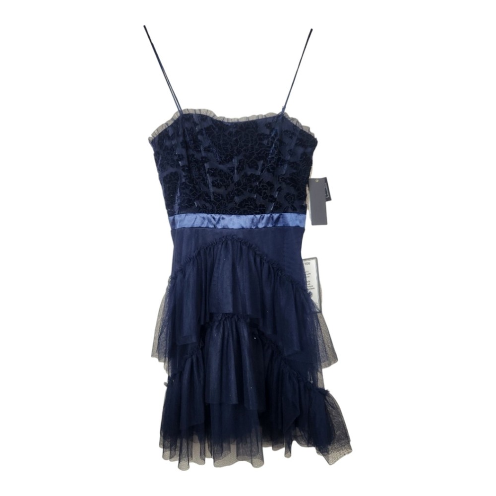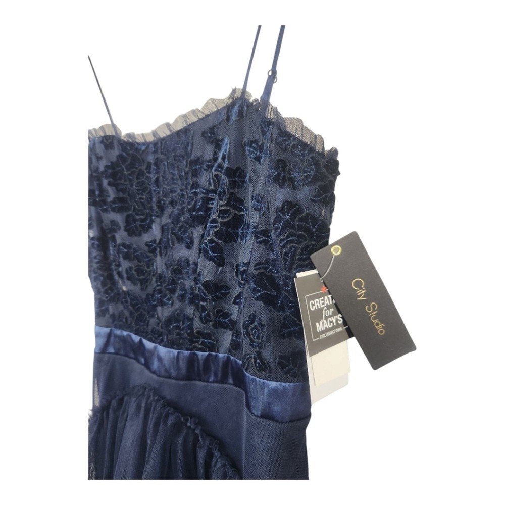 <![CDATA[<div>NWT City Studio Navy Blue Velvet Burnout Ruffle Mini Dress, Size 7 (juniors). Navy / midnight blue Velvet burnout floral bust with ruffle trim & sheer midrift Boning & rubber lined for support Satin band waist Tiered tulle ruffled skirt Mini length Polyester Lined Macy's brand, $89 MSRP In new with tags condition with no noted flaws. Beautiful!! Approximate measurements flat : Pit to pit : 14" Waist: 13" Hips: 16" Shoulder to hem : 35" Top of bust to hem: 27" tags: women ladies fashion trend design fit wear style cut size small size 6 women teen prom hoco special event formal fairy dark blue