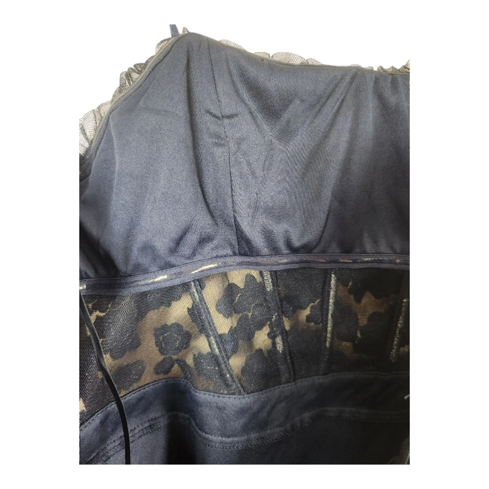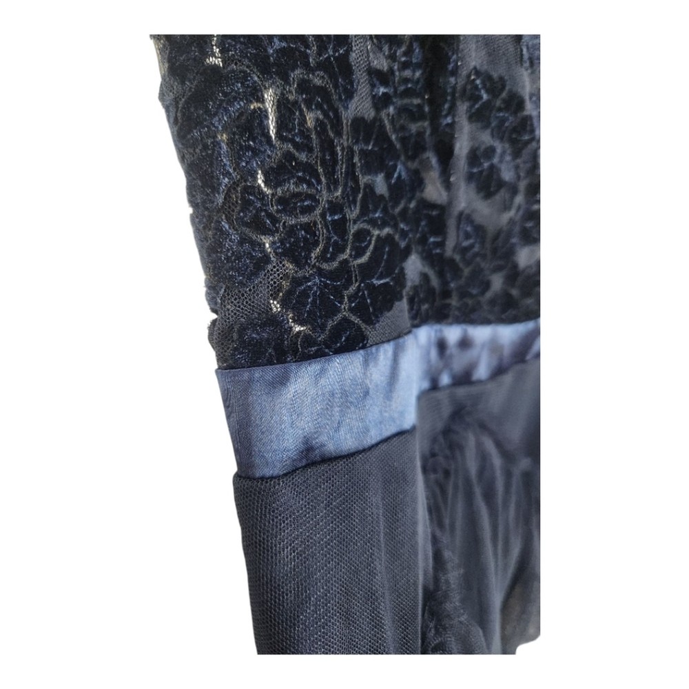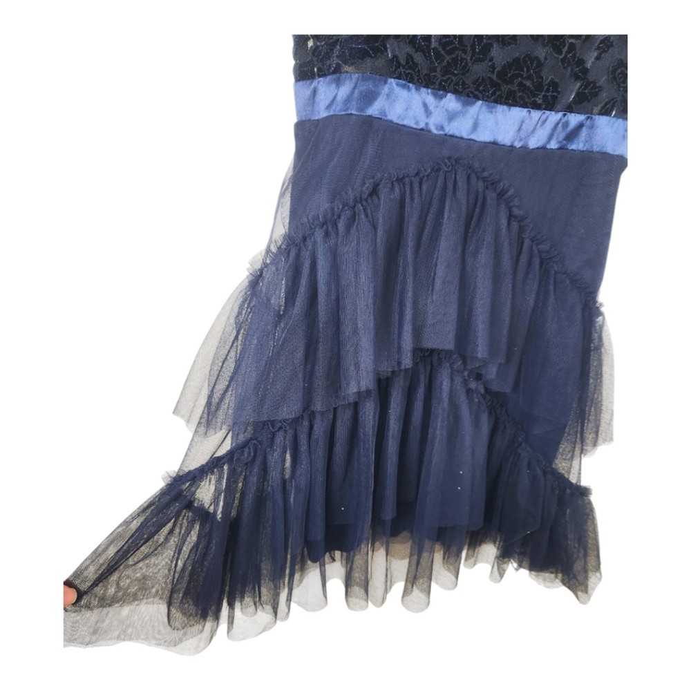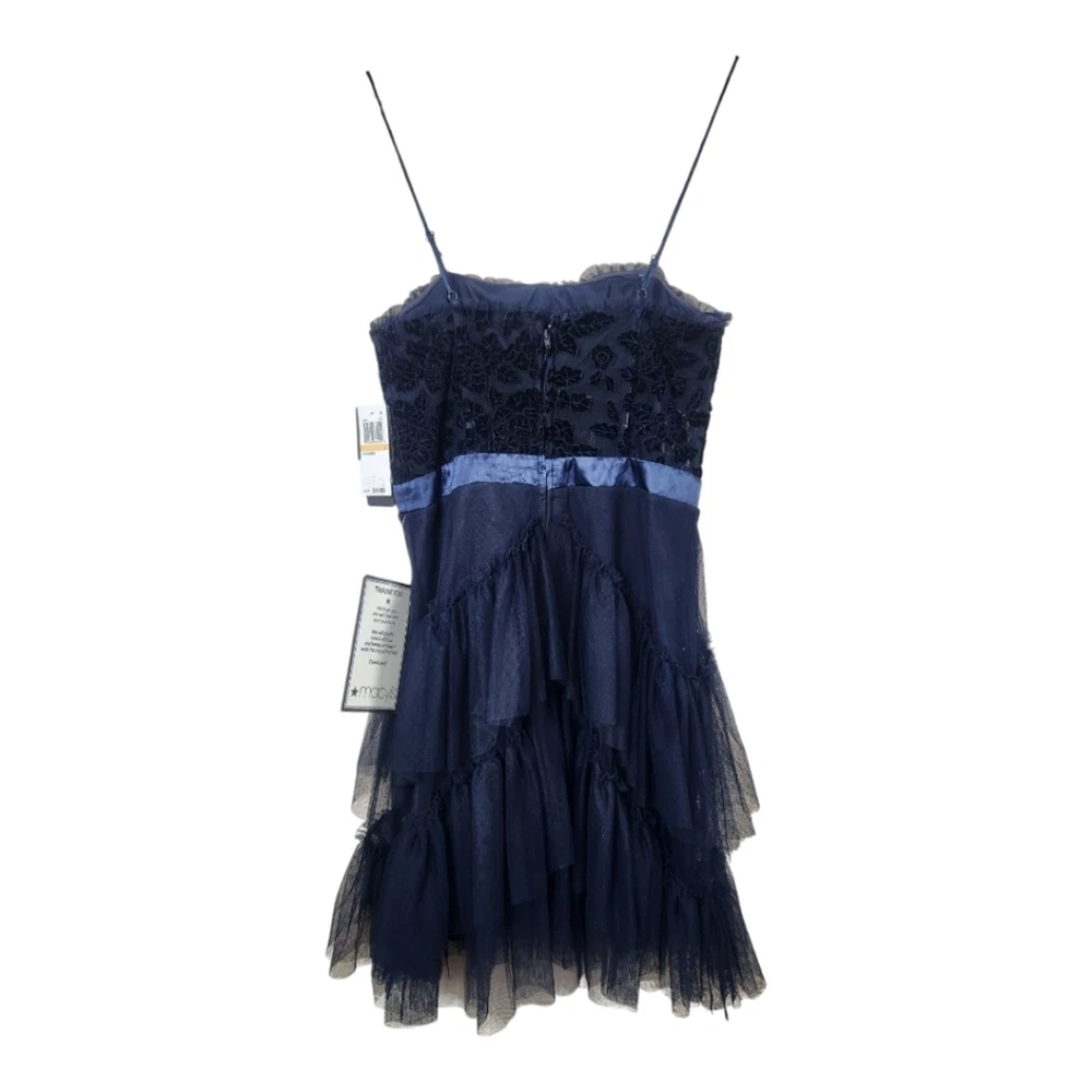 <![CDATA[<div>NWT City Studio Navy Blue Velvet Burnout Ruffle Mini Dress, Size 7 (juniors). Navy / midnight blue Velvet burnout floral bust with ruffle trim & sheer midrift Boning & rubber lined for support Satin band waist Tiered tulle ruffled skirt Mini length Polyester Lined Macy's brand, $89 MSRP In new with tags condition with no noted flaws. Beautiful!! Approximate measurements flat : Pit to pit : 14" Waist: 13" Hips: 16" Shoulder to hem : 35" Top of bust to hem: 27" tags: women ladies fashion trend design fit wear style cut size small size 6 women teen prom hoco special event formal fairy dark blue