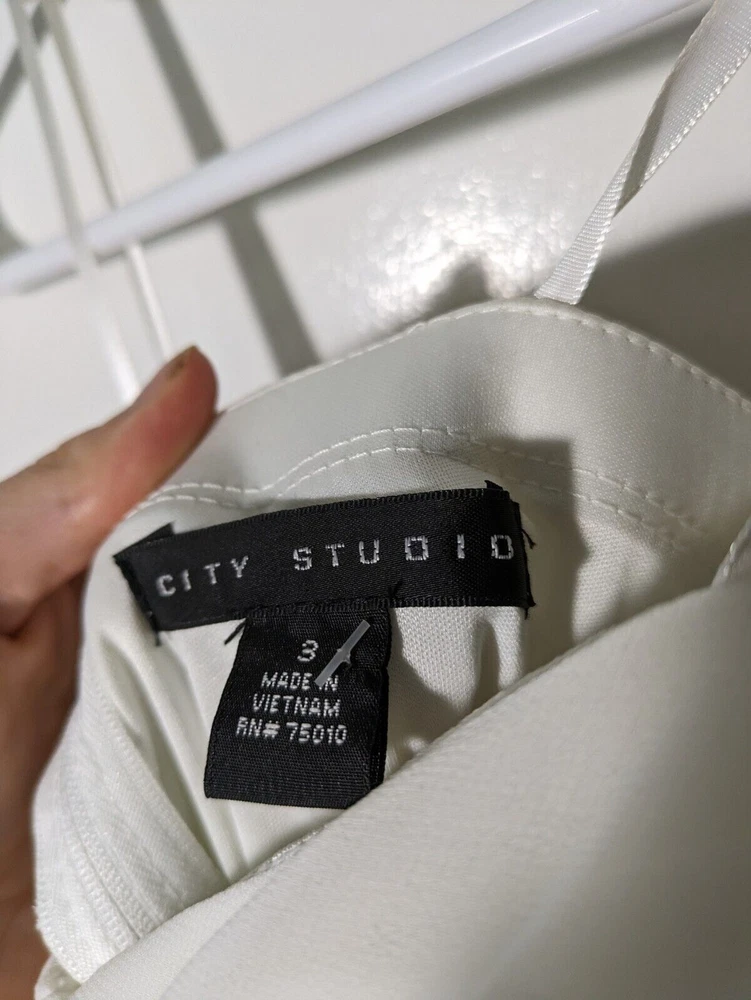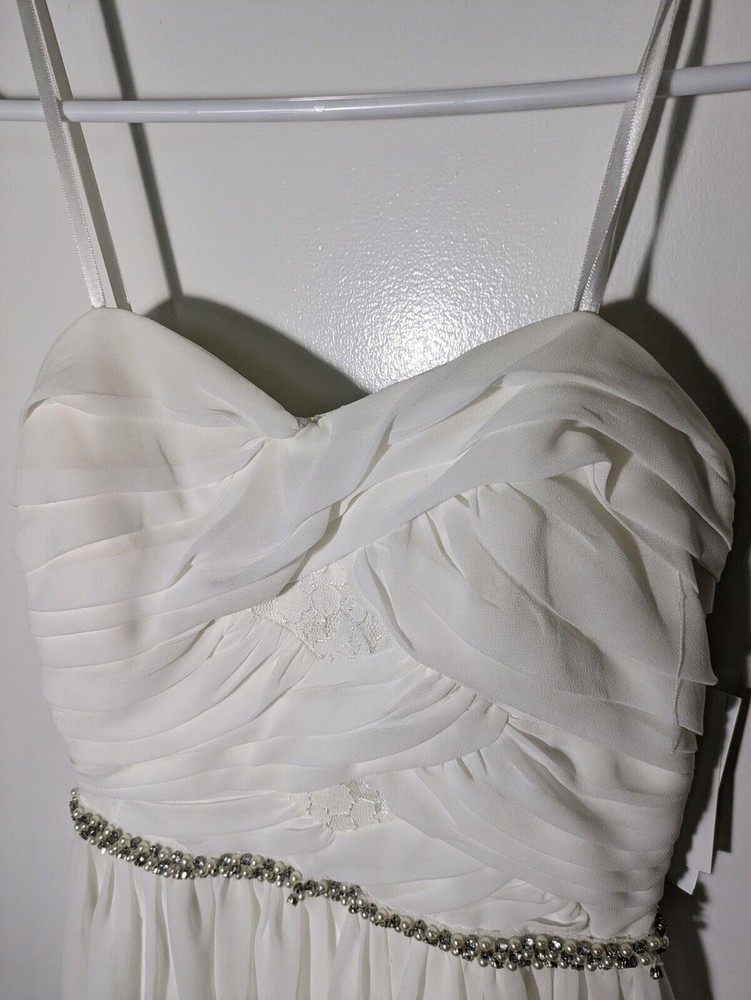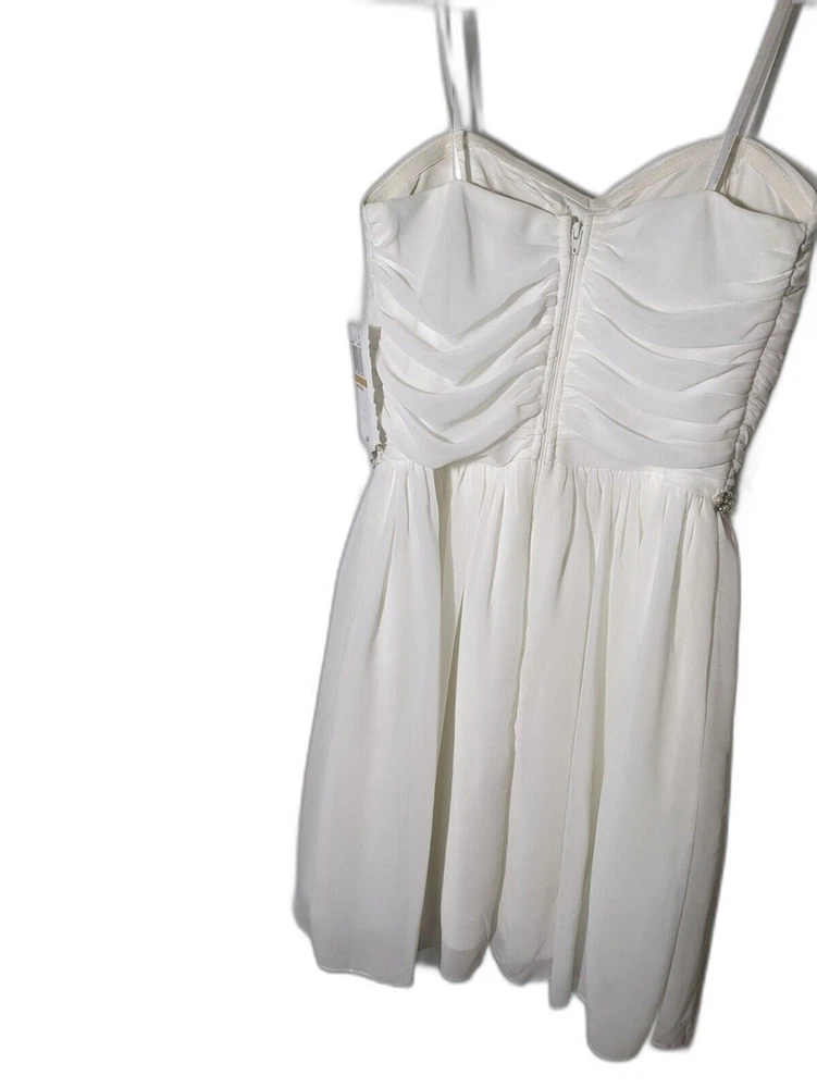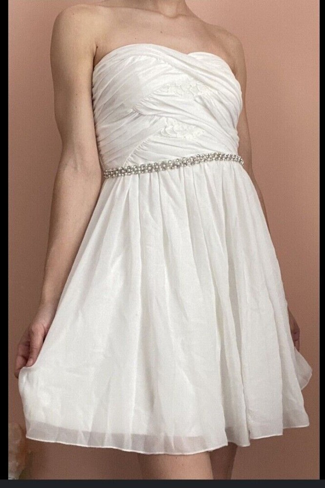 Turn heads in this captivating white mini dress from City Studio, a showstopper for any party or cocktail affair. This strapless beauty boasts a hidden back zipper for a smooth, flattering fit, while the intricate lace fabric adds a touch of delicate femininity. Crafted in juniors size 3, this dress falls above the knee, making it an ideal choice for springtime events. The dress is brand new with tags, ensuring you'll be the belle of the ball. Please note: there is some minor damage to the gem belt. See pictures for details. Don't miss out on this stunning addition to your wardrobe! Key Features: Strapless design for a sophisticated look Hidden back zipper for a seamless fit Lace fabric adds a touch of femininity Juniors size 3, falls above the knee Perfect for spring season events Brand new with tags Act now and make this exquisite dress yours!