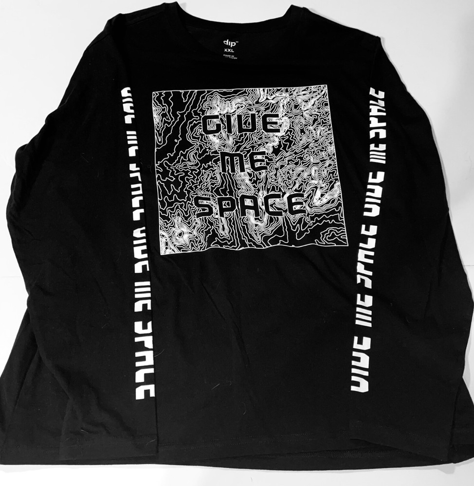 For sale a new Dip t-shirt with a graphic print saying "Give Me Space" on the front and the sleeves; the back is solid black. This t shirt is new with tags' The fabric is all cotton. The shirt is size XXL. Please look at the photos and read everything; also compare clothing to similar items known to fit. Width is measured flat and should be doubled. The t-shirt measures: 22" across the shoulders; 25" across the armpit; 27" sleeve length; 30" length in the back. Please be aware colors may appear different on other devices. Thanks for looking. Always happy to send additional pictures. Will combine shipping whenever possible. When you are satisfied with your transaction, leave feedback and I will reciprocate. Check out my other items ! Be sure to add me to your favorites list ! All items are shipped from a smoke free home.
