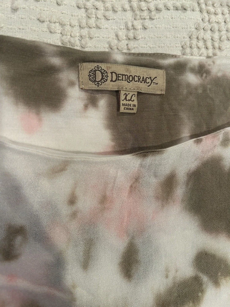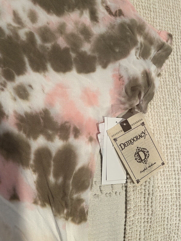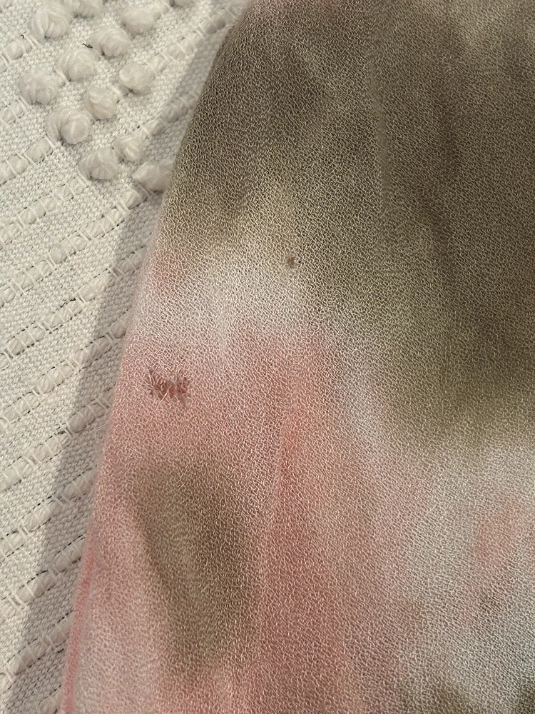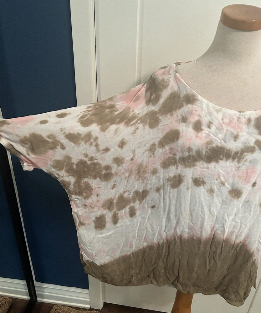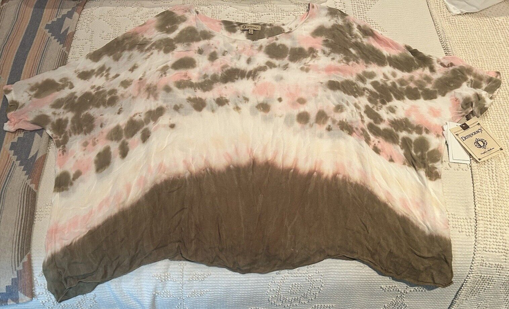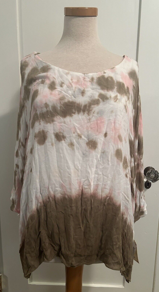 Here is a soft, beautifully dip dyed rayon blouse with an attached lining tank. The neckline connects to make it extra easy to wear! Enjoy the airy and comfortable batwing sleeve while still being covered underneath. Color is a pastel pink on an off-white background with olive green accents and border. I see one tiny hole and one pinprick at the right shoulder. Bust approximately 32" across Length 27"