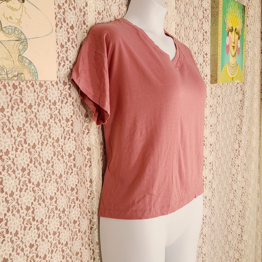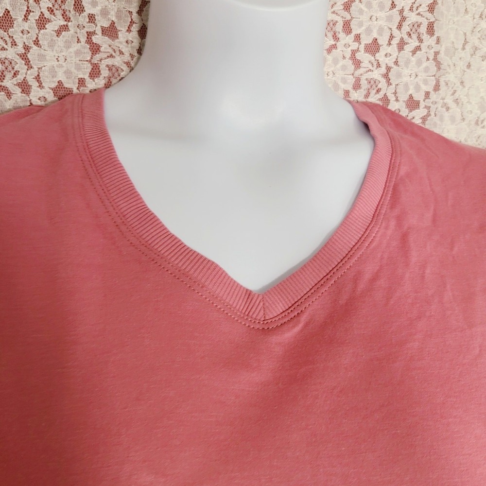This dusty rose pink v-neck tee is super soft and comfortable, thanks to the rayon-cotton blend. The fit is relaxed but flattering, perfect for everyday wear. Love that it’s new with tags and freshly laundered—great quality for the price! The color is versatile and goes with everything. A must-have for a casual yet stylish look.