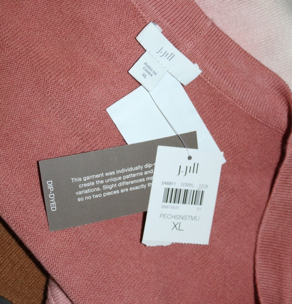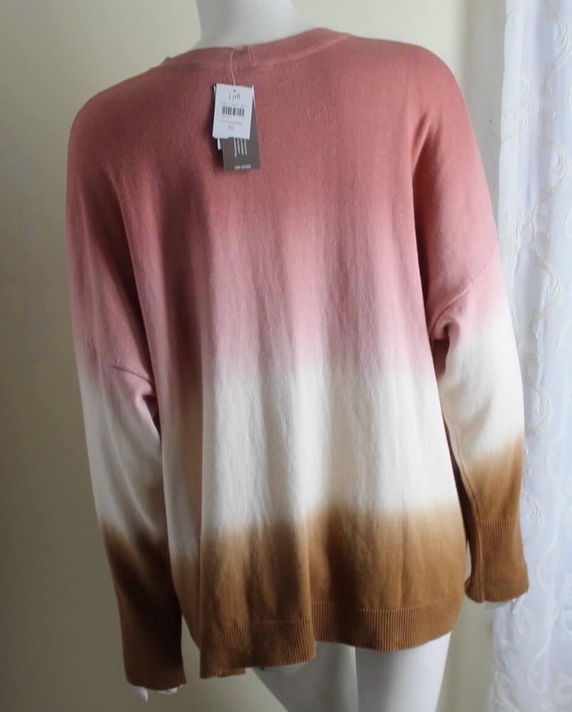 NWT great J.JIll sweater. V-neck, long sleeves, full bottom hem. Amazing dip-dye..such a cool piece! 100% Cotton, long sleeves, full bottom hem. Great colors & look. 55% Cotton, 25% Viscose Rayon, 20% Nylon, Machine wash New with tags. 53 inch bust, 28 inches across top shoulder, 30 inch length, 52 inches around bottom hem, 19.5 inch sleeve length INVENTORY CODE: MY1-12-BIN591 We aim to provide our customers with fine objects and first-class service. I am currently listing many fine, unusual and interesting garments - please see our other listings. Thank you for viewing. A giant thank you to our wonderful customers in the U.S. and Internationally. We've had over 15 wonderful years on eBay! Please let me know if you have any questions. If you like this item, you may like other unique and interesting items in my collection. Do enjoy! I offer combined shipping , please message me for more information and check out my other items. I also offer discounts to returning customers, message me if you're returning. International customers: EBAY GLOBAL SHIPPING.