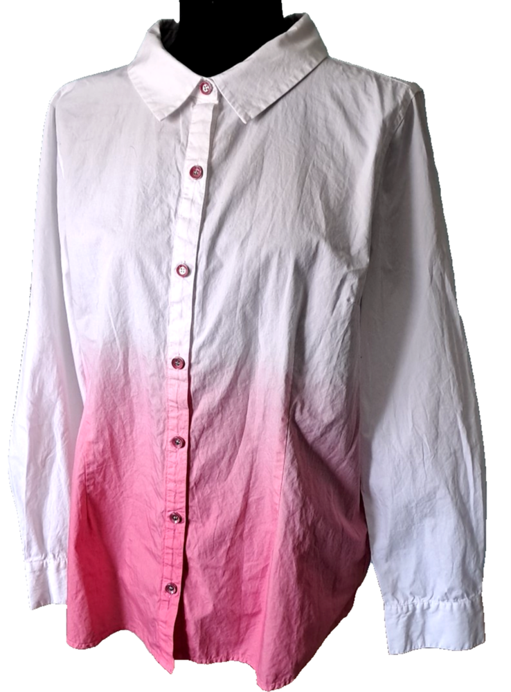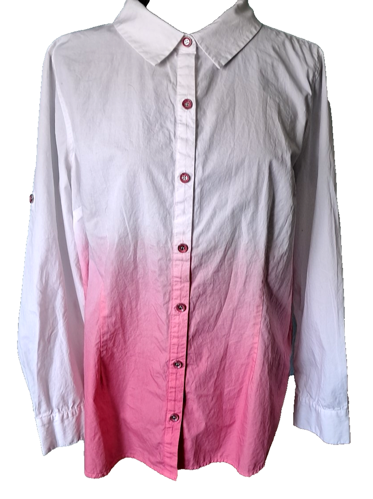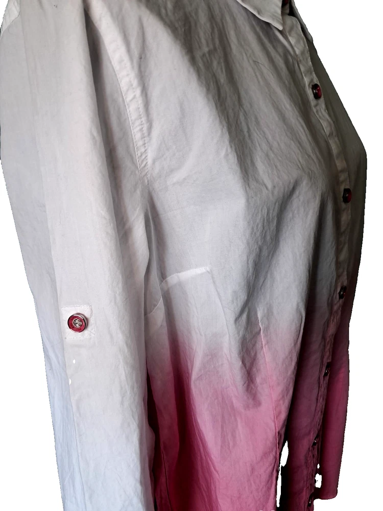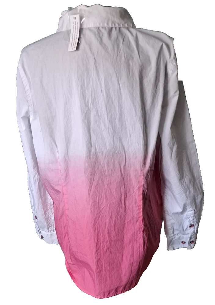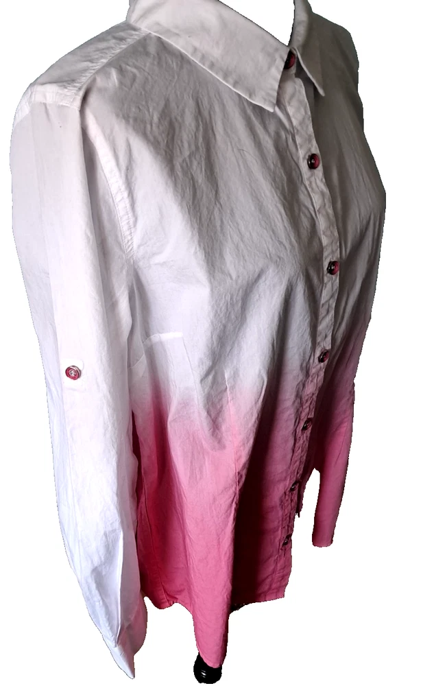 Fabrication: woven Features: dip-dye design with white sleeves and upper, collar, button-front closure, cuffed sleeves with roll tabs Fit: fitted; cut to follow the lines of the body Bust Darts 7 Button Closure with extra button Length: missy length 27-1/2" Content: 100% cotton Care: machine wash, tumble dry SMOKE FREE FAST SHIPPING Please check out our ebay store thank you