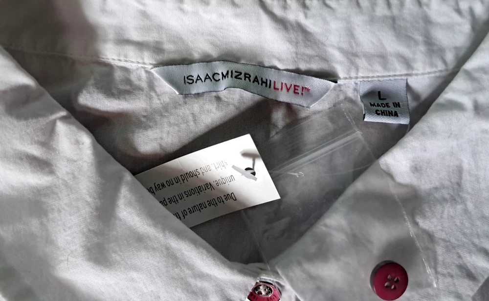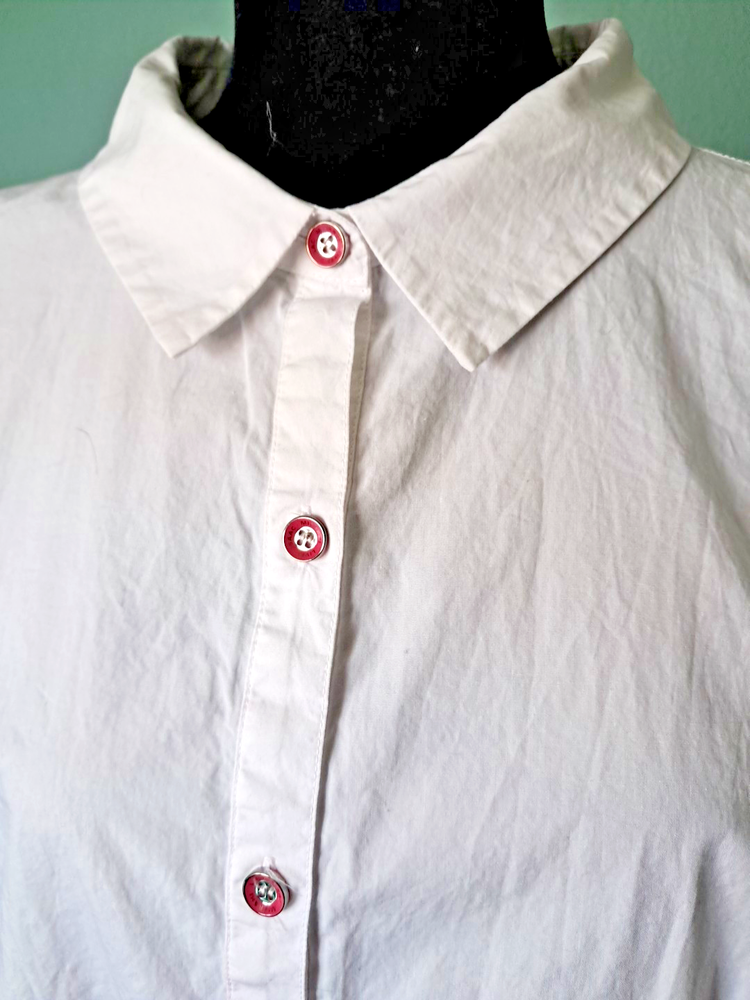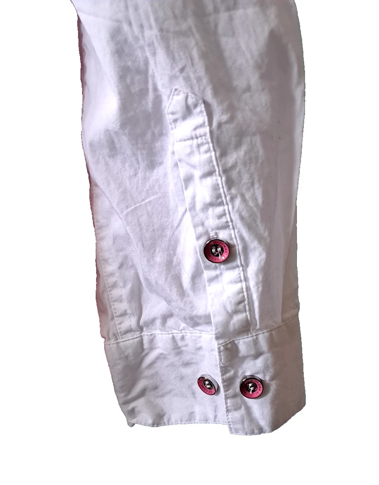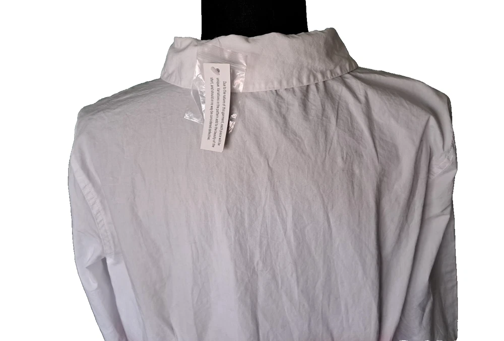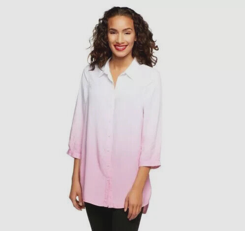 Fabrication: woven Features: dip-dye design with white sleeves and upper, collar, button-front closure, cuffed sleeves with roll tabs Fit: fitted; cut to follow the lines of the body Bust Darts 7 Button Closure with extra button Length: missy length 27-1/2" Content: 100% cotton Care: machine wash, tumble dry SMOKE FREE FAST SHIPPING Please check out our ebay store thank you