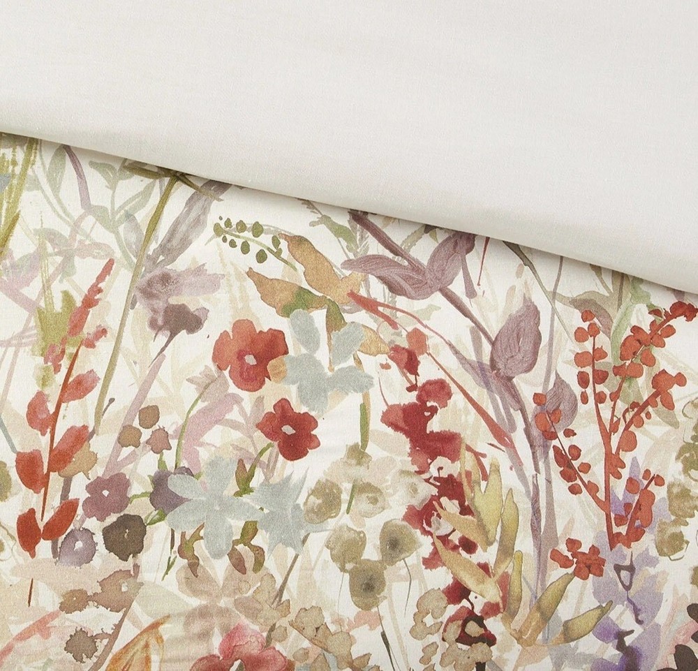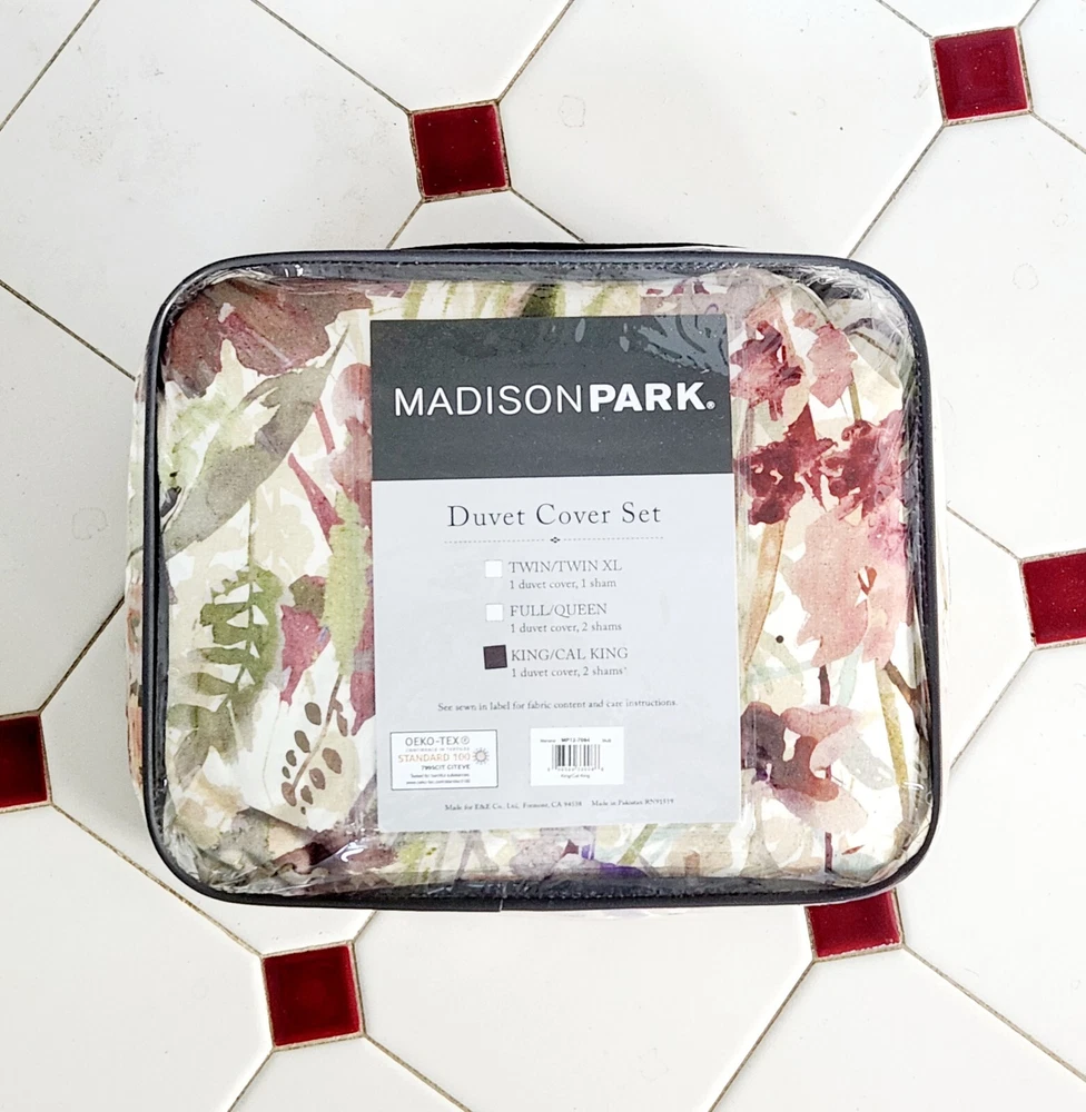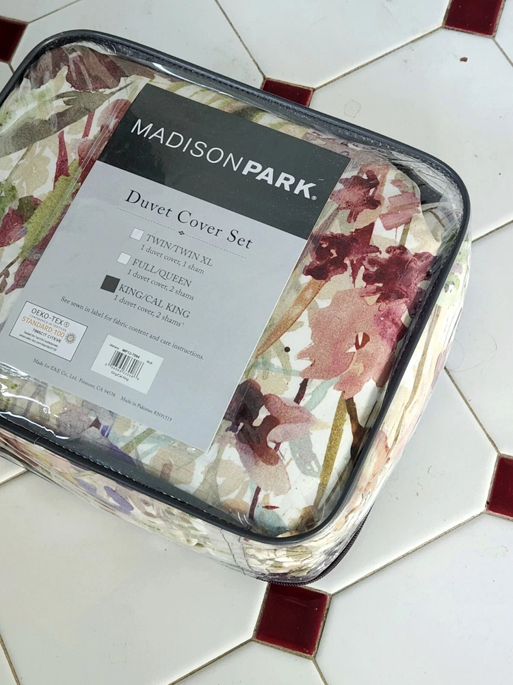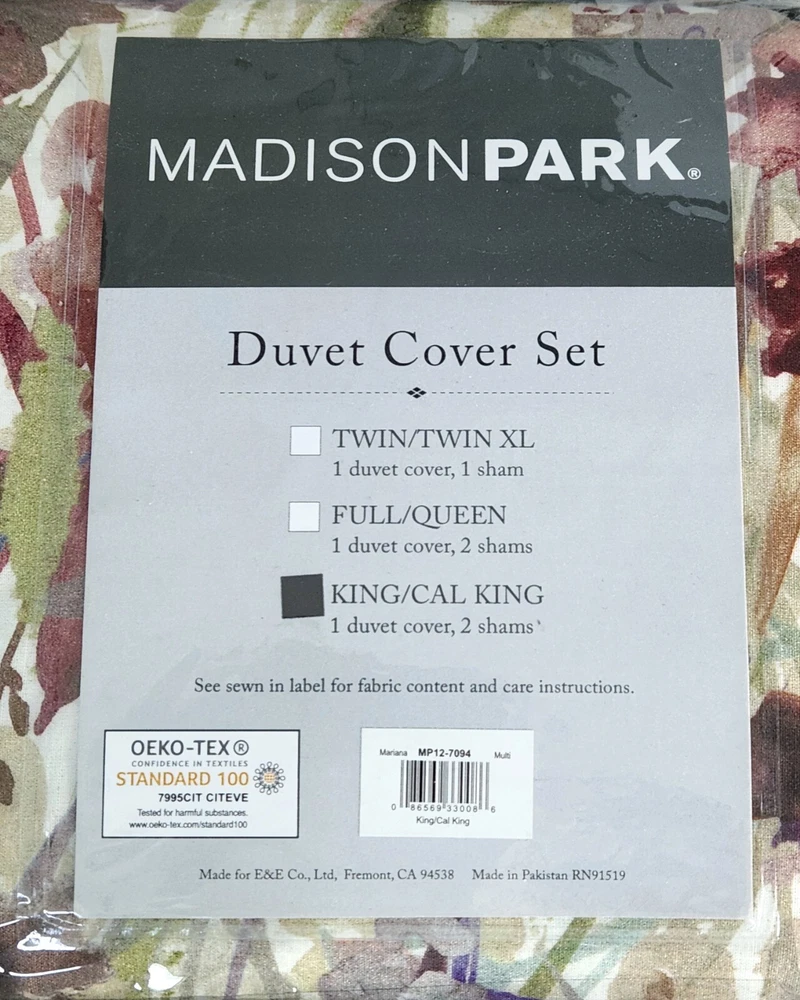 The Madison Park Mariana 3 Piece Cotton Printed Duvet Cover Set features a watercolor floral print that runs from the middle of the bed to the foot, for a beautiful casual look. Product Features King/California King duvet cover dimensions- 104" L x 92" W King shams dimensions- 20" L x 36" W Set includes 1 duvet cover, 2 shams Matching shams have 2" flange Button closure with inside corner ties to secure the insert (not included) Asian American & Pacific Islander Owned, Woman Owned Duvet and Sham- Cotton Percale, Cotton and Polyester Reverse Machine Washable Imported