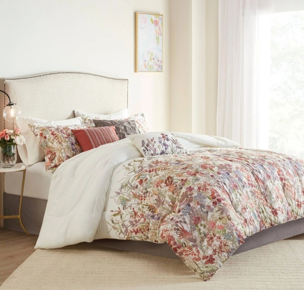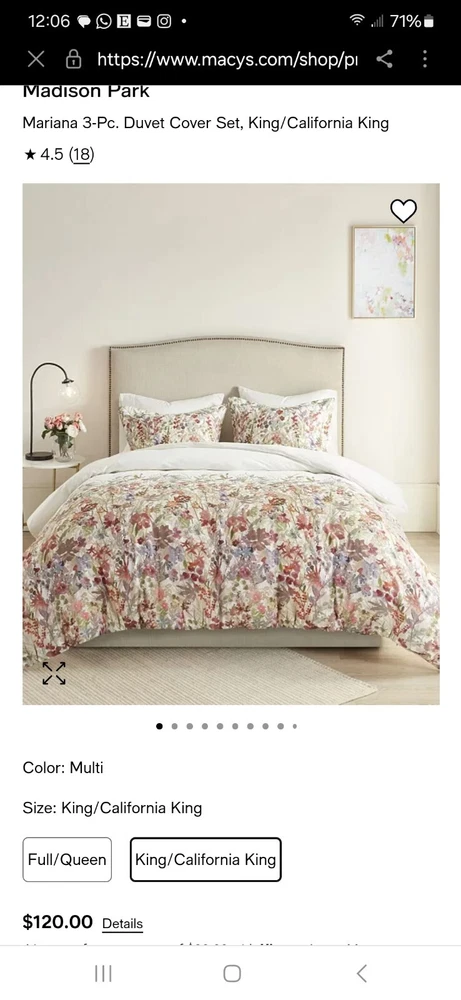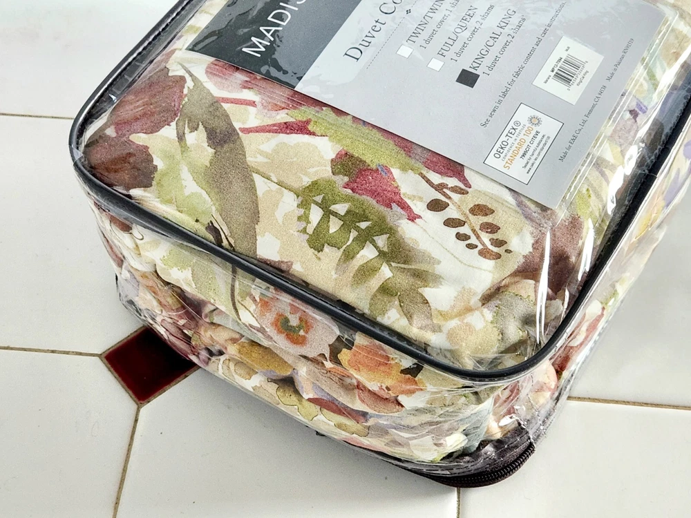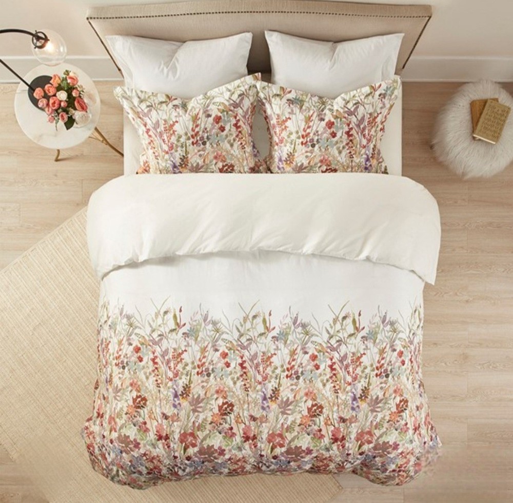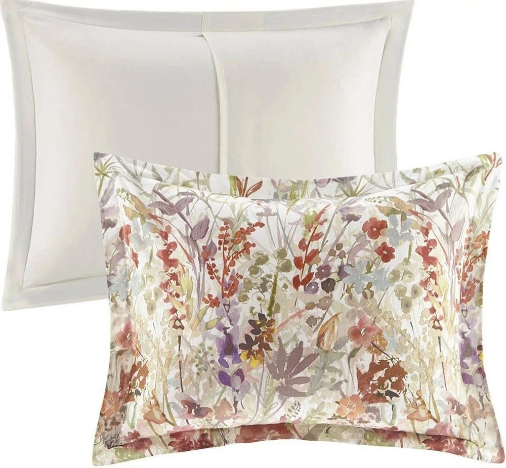 The Madison Park Mariana 3 Piece Cotton Printed Duvet Cover Set features a watercolor floral print that runs from the middle of the bed to the foot, for a beautiful casual look. Product Features King/California King duvet cover dimensions- 104" L x 92" W King shams dimensions- 20" L x 36" W Set includes 1 duvet cover, 2 shams Matching shams have 2" flange Button closure with inside corner ties to secure the insert (not included) Asian American & Pacific Islander Owned, Woman Owned Duvet and Sham- Cotton Percale, Cotton and Polyester Reverse Machine Washable Imported