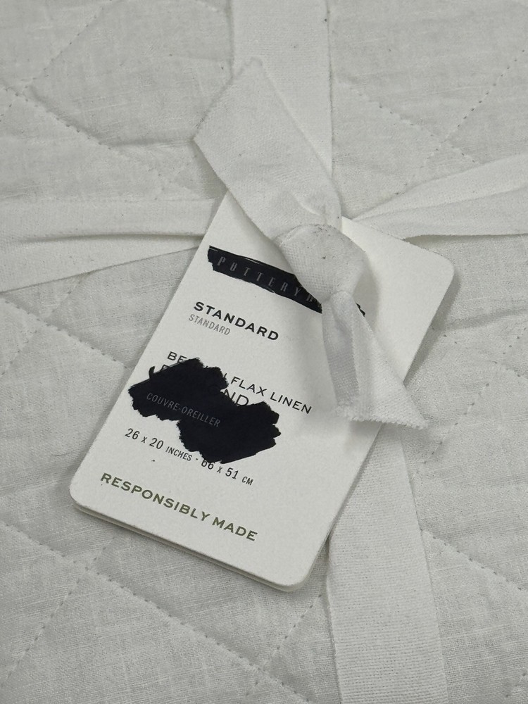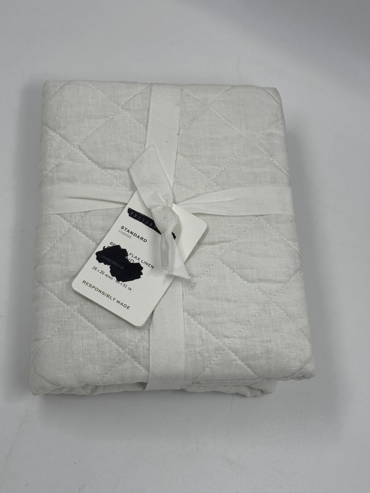 NWT POTTERY BARN BELGIAN FLAX LINEN DIAMOND QUILTED SHAM (1) STANDARD ~ WHITE Tag has markings Material: Linen woven from 100% Belgian flax linen. Reversible Design: Reverses to solid. Secure Design: Quilted sham features an overlap closure.