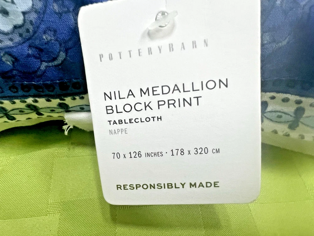 New with Tags Pottery Barn Nila Medallion Block Print 100% Cotton Table Throw 70" x 126" Made with 100% cotton. By choosing our cotton products, you’re supporting our investment in Better Cotton’s mission. This product is sourced via mass balance and therefore may not contain Better Cotton. Imported. Overall: 70" w x 126" THIS IS FOR BIG TABLE Care Machine wash warm; gentle cycle. Only use non-chlorine bleach, if needed. Tumble dry on low heat; remove promptly. Warm iron, as needed. Only includes what is pictured. Please review all the pictures closely. Please review all the pictures to determine the condition . The pictures you see are of the actual item you will receive.