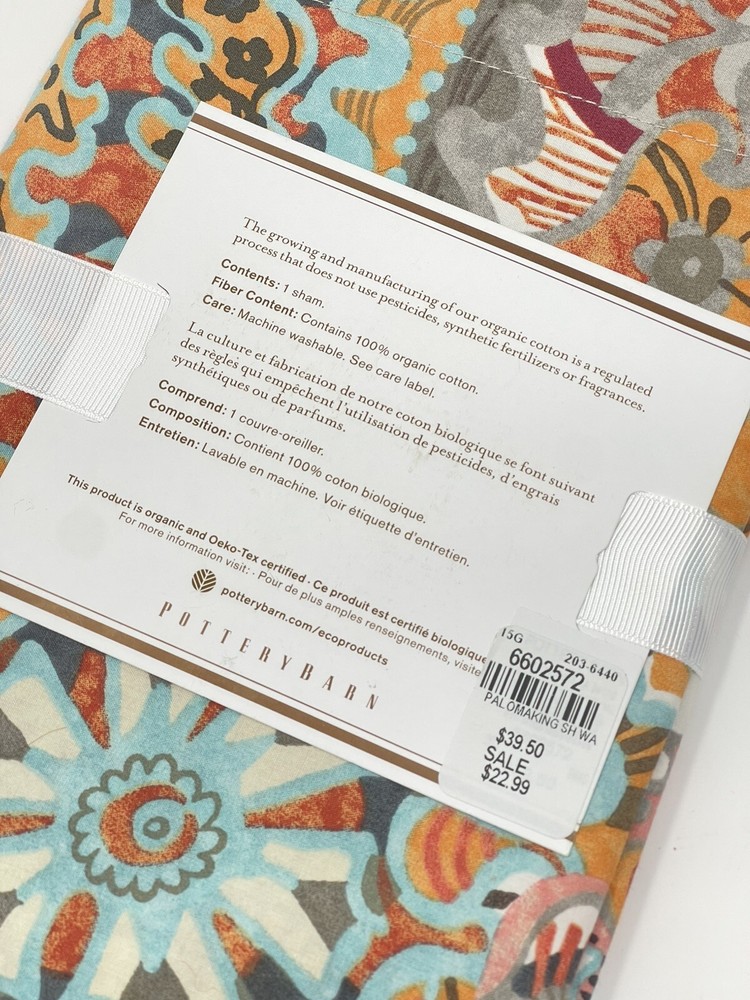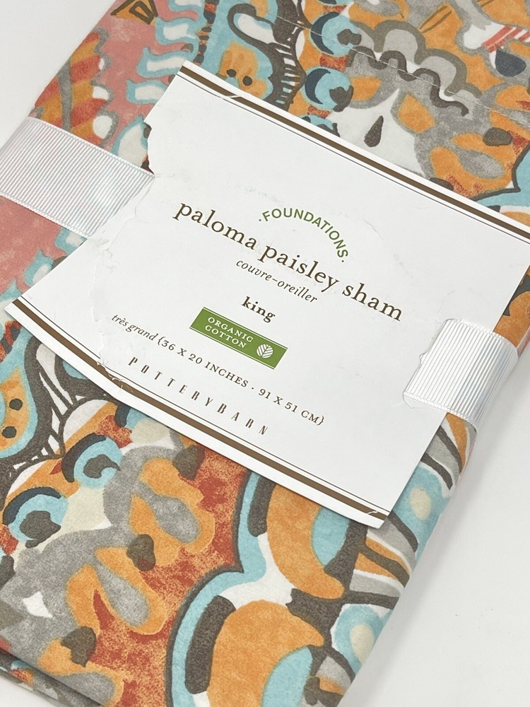 NWT POTTERY BARN Paloma Paisley 100% Organic Cotton KING SHAM Aqua Orange Multi Brand new in package. Please see pics.