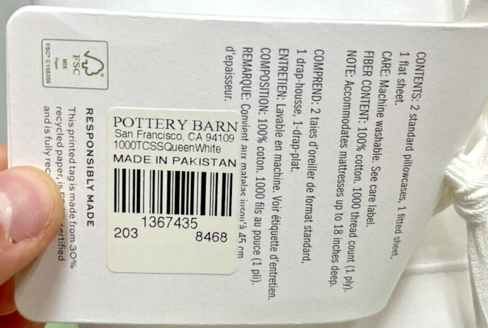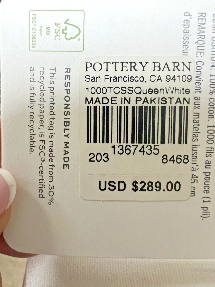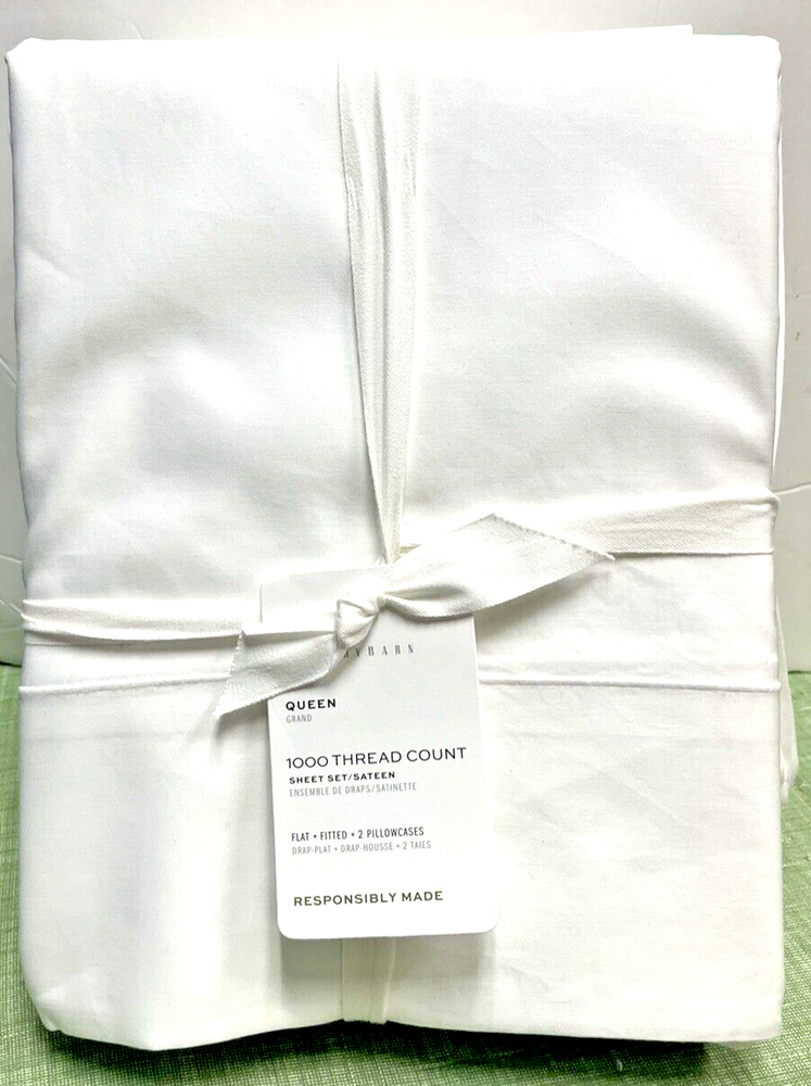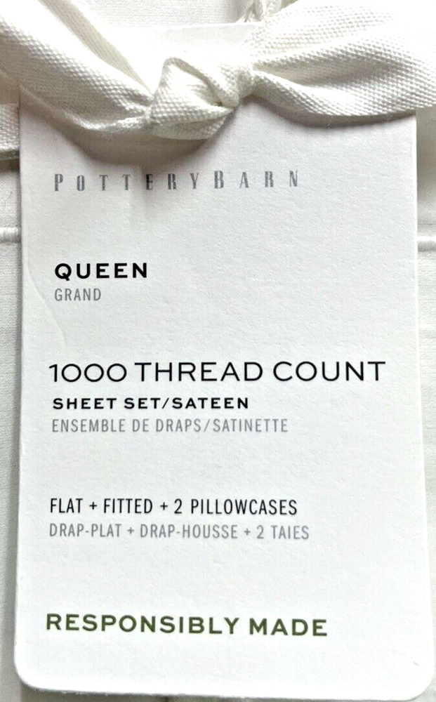 Pottery Barn 1000 Thread Count Sheet Set - Queen - White Brand New With Tags! Never Been Used! Ready For Immediate Use! Retails over $280! SAVE MONEY NOW! Product Description: CONSTRUCTION Woven of 100% cotton sateen. 1000-thread count. OEKO-TEX® STANDARD 100: tested for 1000+ harmful substances to keep you and your family safe. 14.HUS.42449 HOHENSTEIN HTTI. Set includes flat sheet, fitted sheet and 2 pillowcases (1 with twin set). Fitted sheet fits mattresses up to 16" deep. Imported. FITTED SHEET: 54" w x 75" l FLAT SHEET: 90" w x 105" l STANDARD PILLOWCASES (2): 32" w x 20" l Comes As Pictured! (Please Refer To Images!) Actual Pictures! Free Fast Shipping! Thank you! CARE Wash before first use. Machine wash warm; gentle cycle. Only non-chlorine bleach, if needed. Tumble dry medium; remove promptly. Warm iron, when needed.