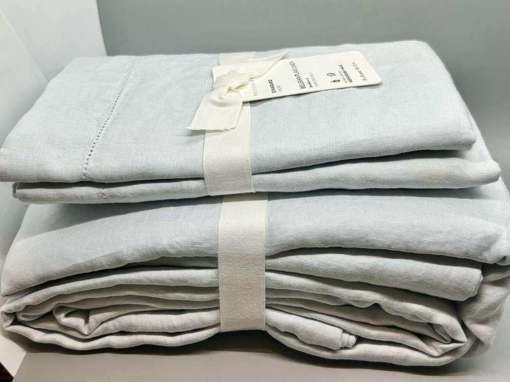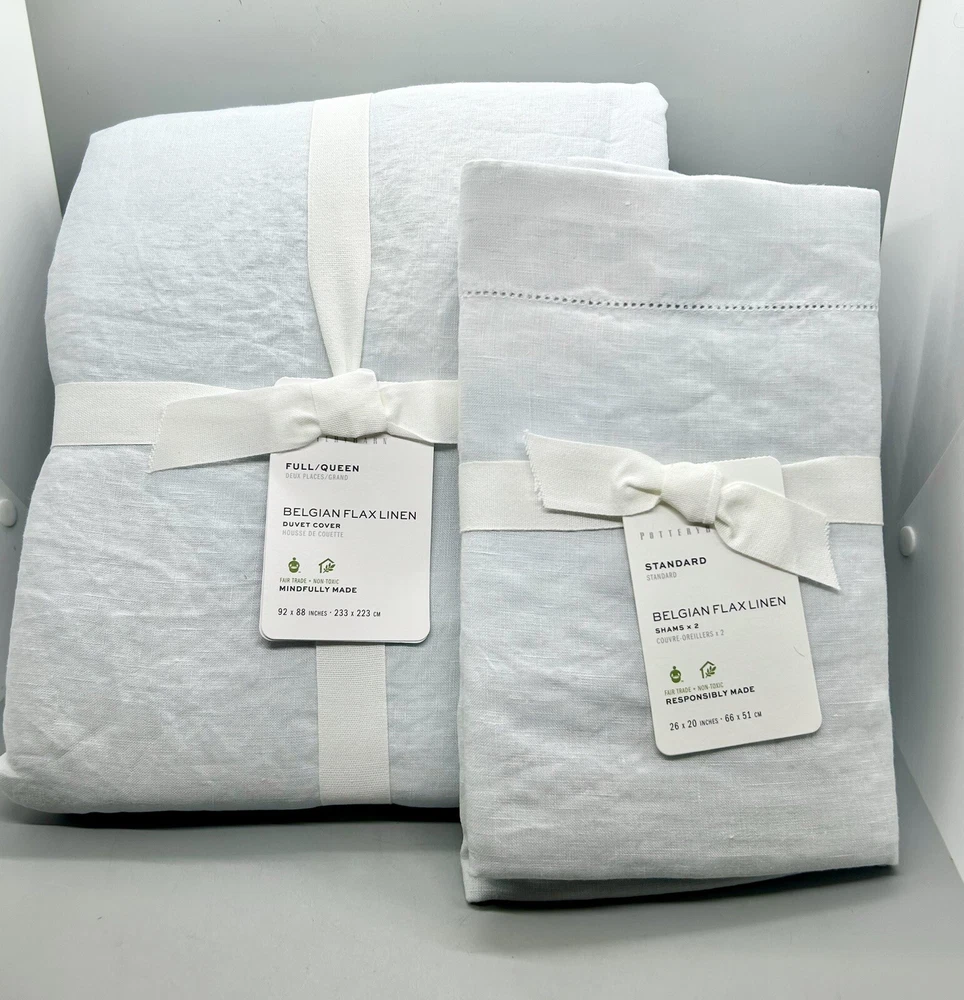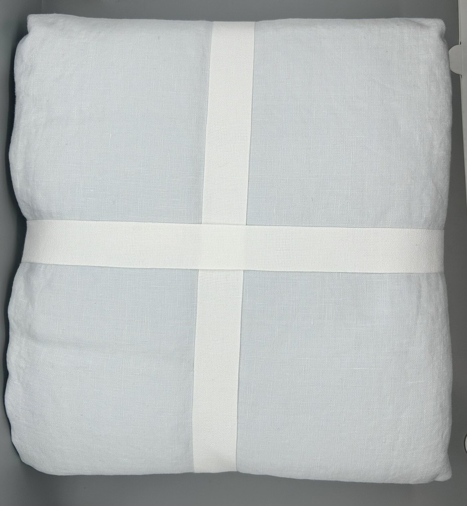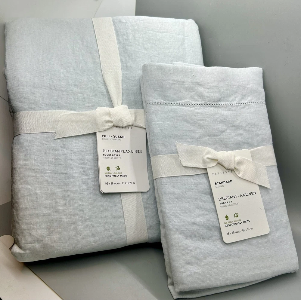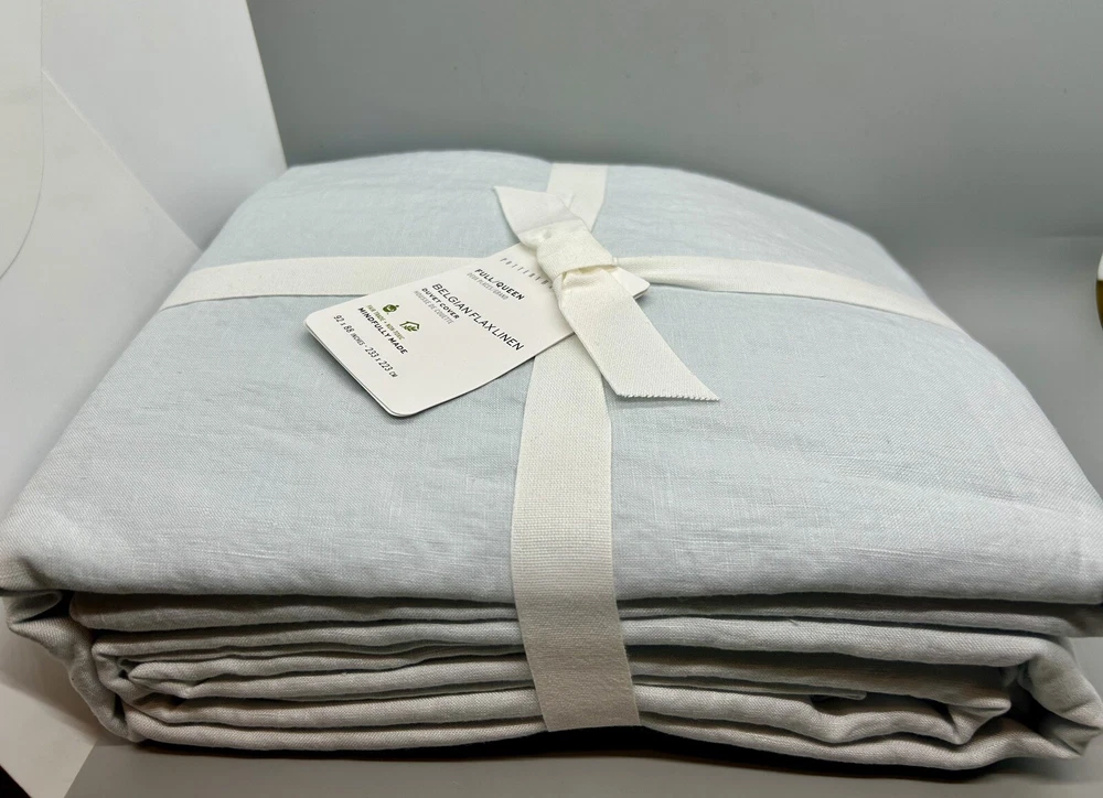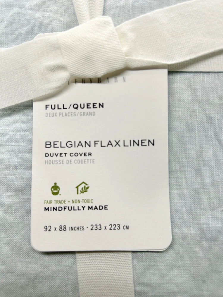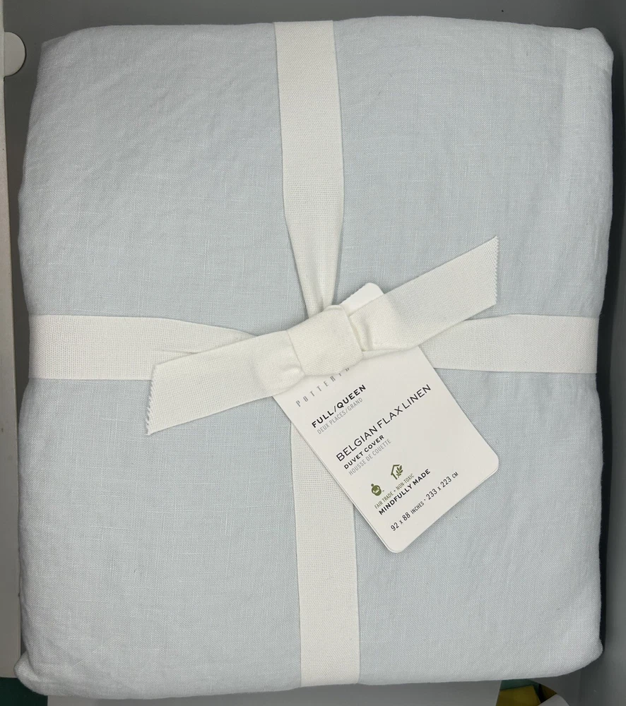Brand new with tags NWT Pottery Barn Belgian Flax Linen Duvet Cover 3-Piece Set ~ Full/Queen Duvet Cover, measuring 92” x 88,” and 2 Matching Standard-Size Pillow Shams, Blue Frost (a cool light pale blue color). The shams each measure 20” x 26.” 100% Belgian flax linen. Message me with any questions.