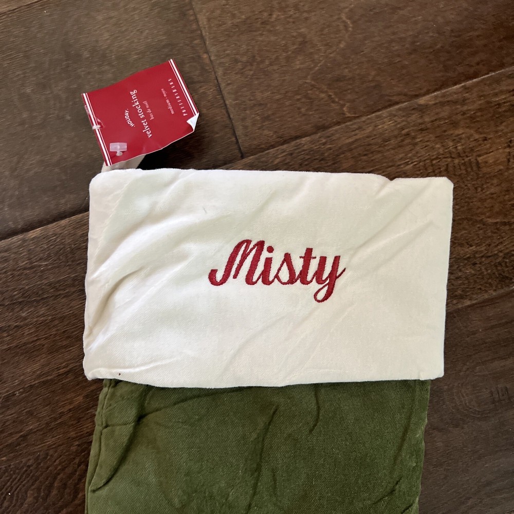 Pottery Barn Green Ivory Velvet Christmas Stocking Classic Med Mono Misty NWT