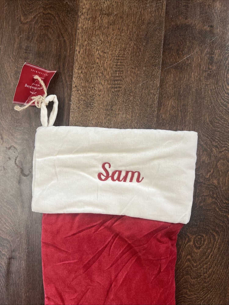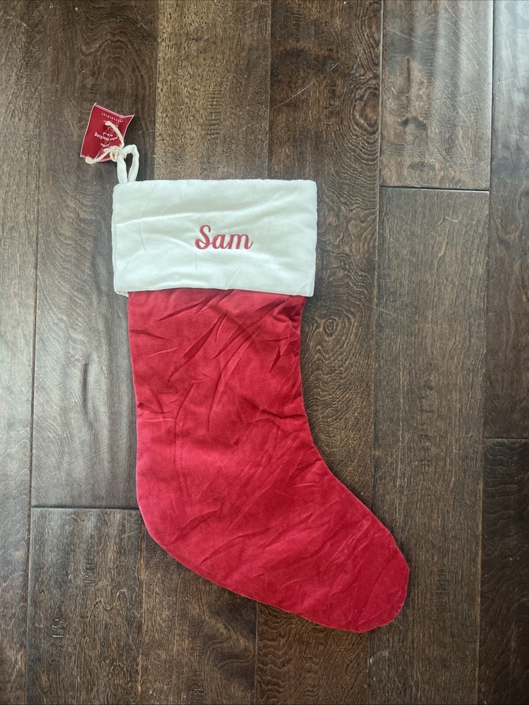 Pottery Barn Medium Red Ivory Velvet Christmas Stocking Sam Mono NWT