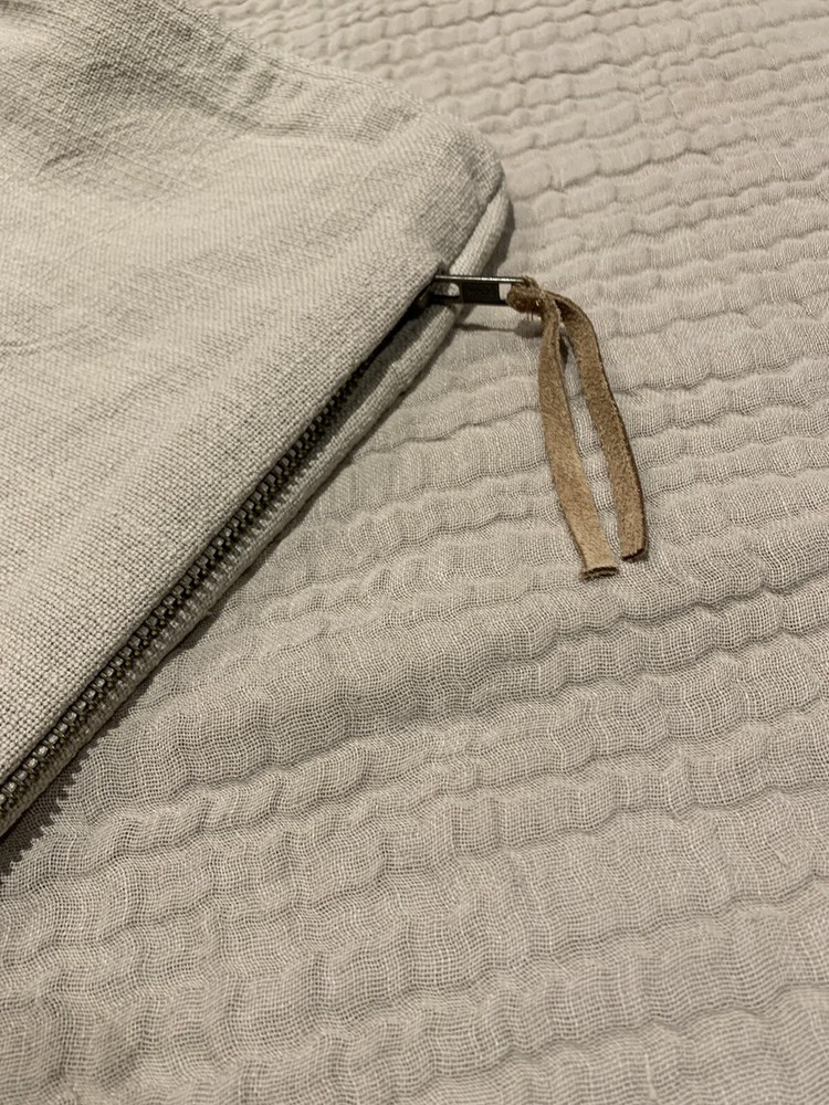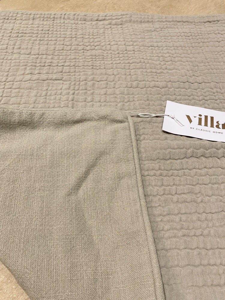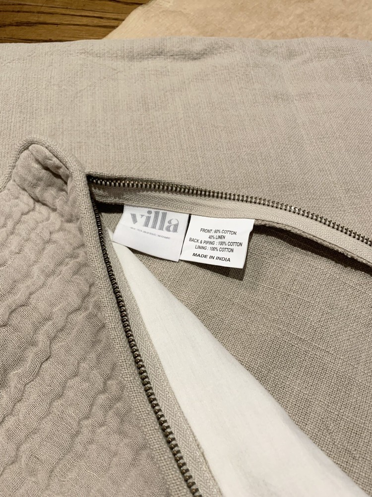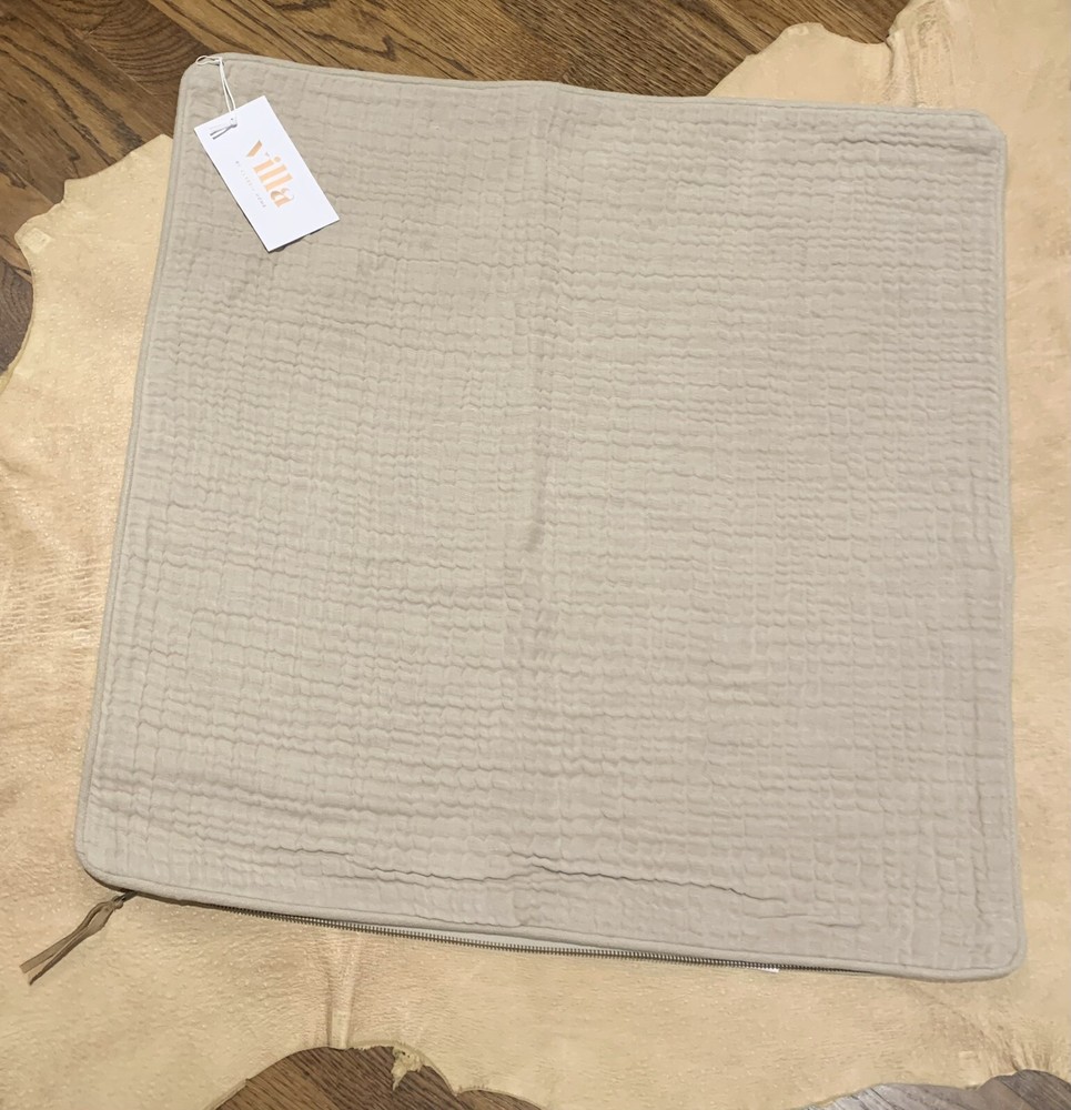 Pillow cover is new with tag, made by same company as Pottery Barn (marked Villa by Classic Home). Retails $99 Woven from three layers of cotton-linen fabric and lightly washed for softness. Muslin/gauze look gives subtle texture. Exposed accent zipper with leather suede pull. Reverse fabric is solid cotton slub. Overall: 24" w x 24" l Zipper: 22"