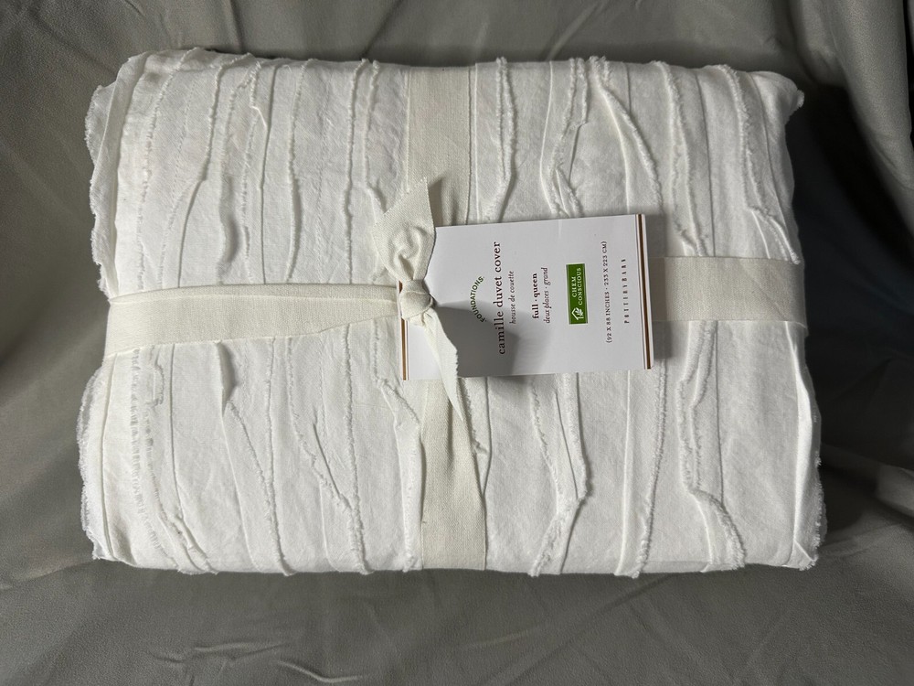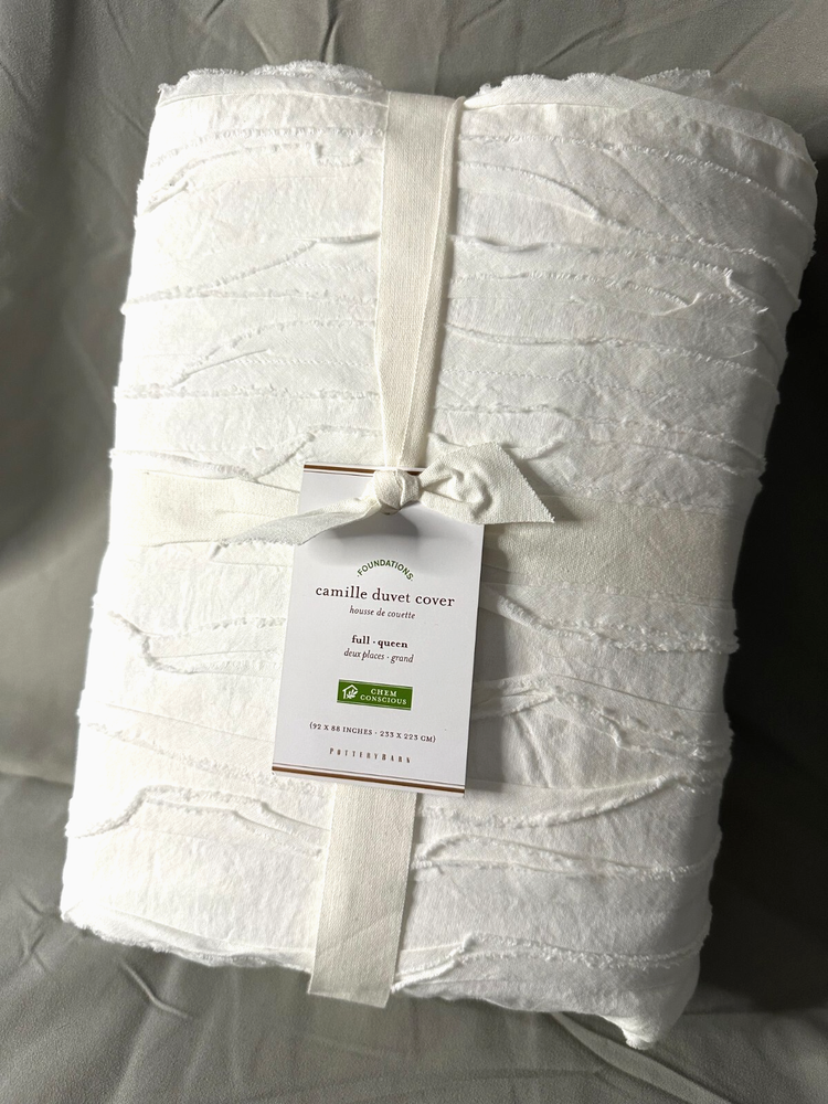 Elevate your bedroom with the Pottery Barn Camille Duvet Cover, a testament to classic elegance and comfort. This white, full/queen-sized duvet cover is the perfect blank canvas to coordinate with your existing decor, offering a clean and serene aesthetic that enhances the coziness of your bed. Crafted with quality in mind, the Camille Duvet Cover is designed to complement a myriad of bedroom styles, from the modern to the traditional. The renowned Pottery Barn brand ensures that you're getting an item that is both stylish and durable, making it a wise investment for your personal sanctuary. Size: Full/Queen: 88" l x 92" w Details Material: Made of 100% cotton voile. Secure Design: Duvet cover has a hidden button closure; sham has an envelope closure. CARE AND MAINTENANCE Machine wash in cold water; gentle cycle. Use only non-chlorine bleach when needed. Tumble dry on low heat; remove promptly. Warm iron as needed.