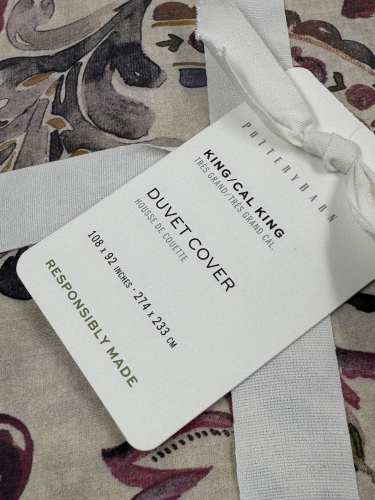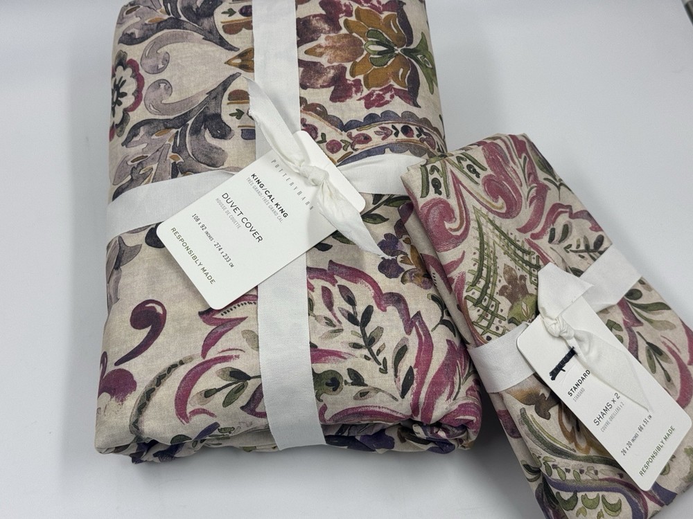 NWT Pottery Barn Ivana Percale King/Cal King Duvet Cover & 2 Standard Shams Sham tags have markings. Material: Woven of 100% cotton; reverses to the same. Secure Design: Duvet features a hidden button closure with inner ties that keep the insert in place; sham features an envelope closure. Reversible Design: Reverses to solid. Duvet Cover: 108x92 Shams 20x26