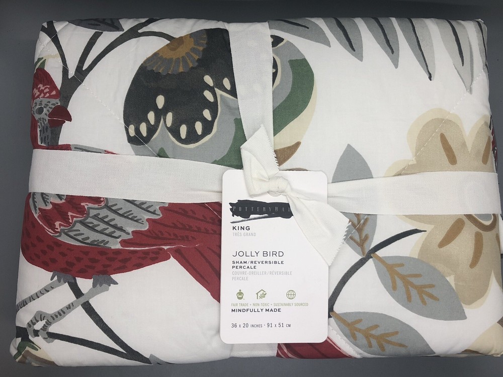 NEW Pottery Barn JOLLY BIRD Pillowcase Sham KING Quilted Tropical Red Bird. Measures 20” x 36”. Brand new and includes tags but tags have been marked to prevent returning the item. See photos, and mes...