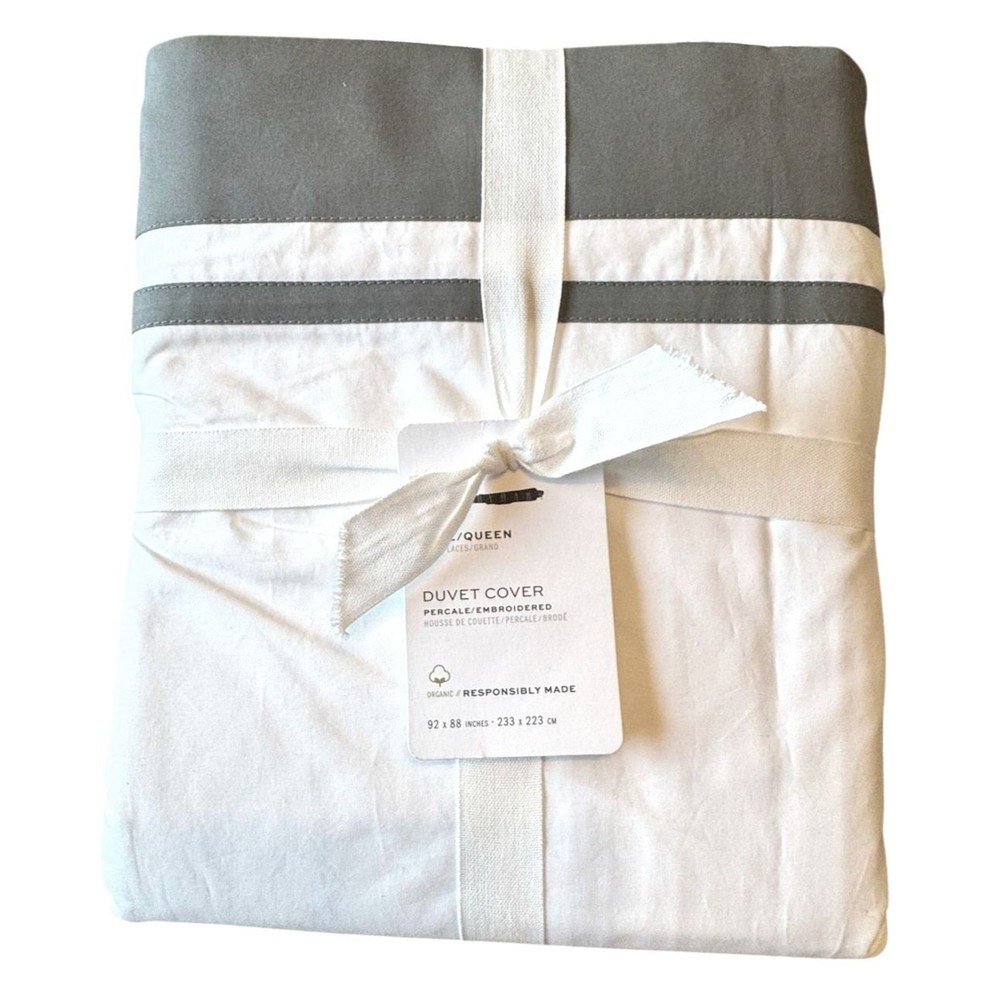 NWT Pottery Barn Parker Organic Percale Duvet Cover Color Contrast White Flagstone Gray F/Q Brand new with original tags. The Parker Organic Percale Duvet Cover is made from 100% organic cotton percale. It's contrasting color gives it a crisp, tailored look. In White/Flagstone. In size full/queen. Other features include: Secure Design: Duvet features a hidden button closure with inner ties that keep the insert in place. Thread Count: 400-thread count constructed of 2-ply yarns. Reversible Design: Reverses to the same. Seller Policies: Fast, reasonable shipping. I ship within 48 hours of payment. Returns accepted within 30 days in original condition. Buyer pays return shipping. Please ask questions prior to bidding. I want to make sure you are thrilled with your purchase!