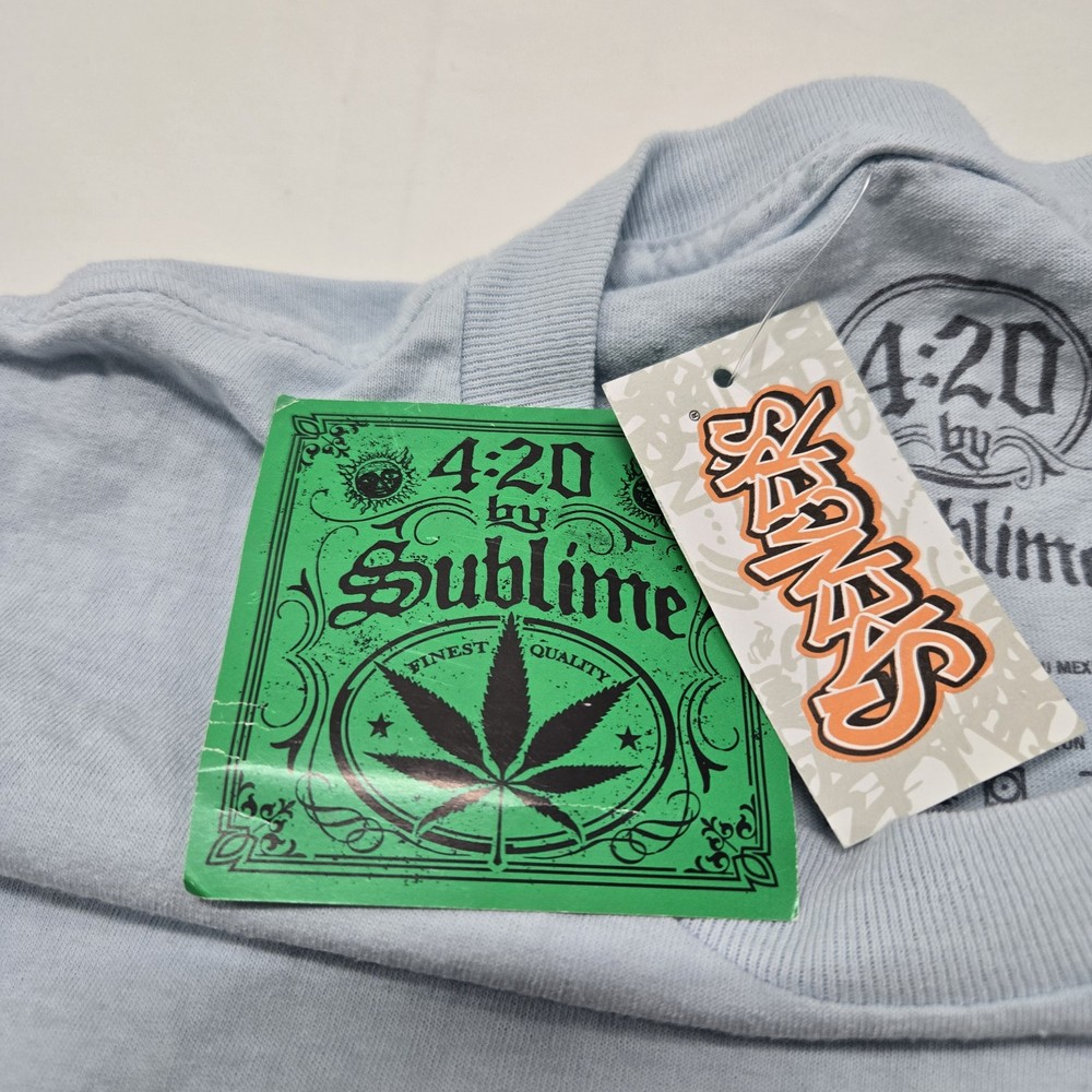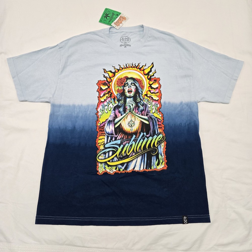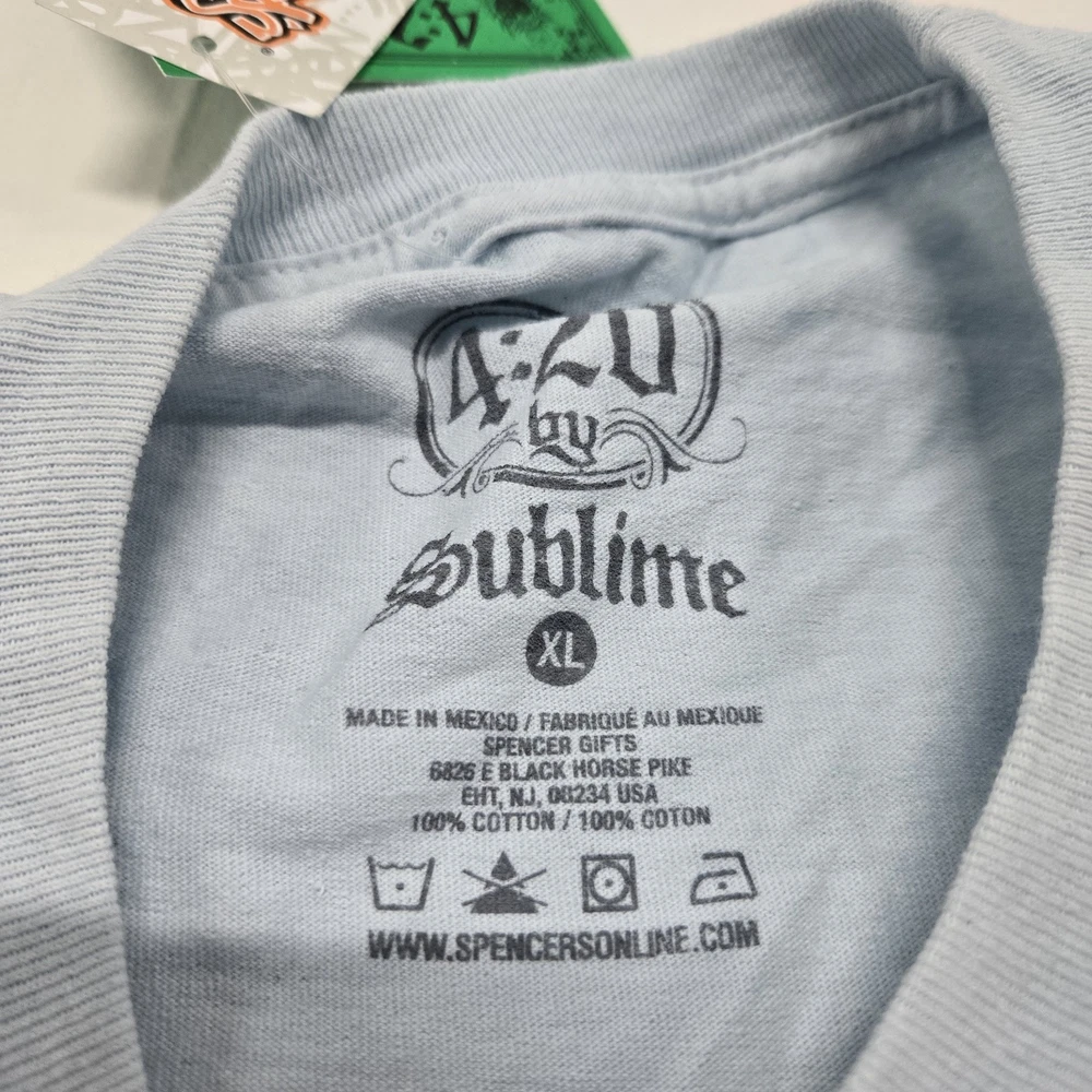 This vibrant men's t-shirt by 4:20 By Sublime is perfect for those who love a touch of color and fun to their wardrobe. The dip dye design in multicolor is eye-catching and trendy, making it a great addition to any casual outfit. The sugar skull graphic tee is ideal for those who love music, beach, rock, colorful, and skull themed designs. The short-sleeved t-shirt is available in size XL and is suitable for regular size types. It is new with tags and has a Y2K Spencers design. Get your hands on this unique t-shirt that is sure to make a statement.