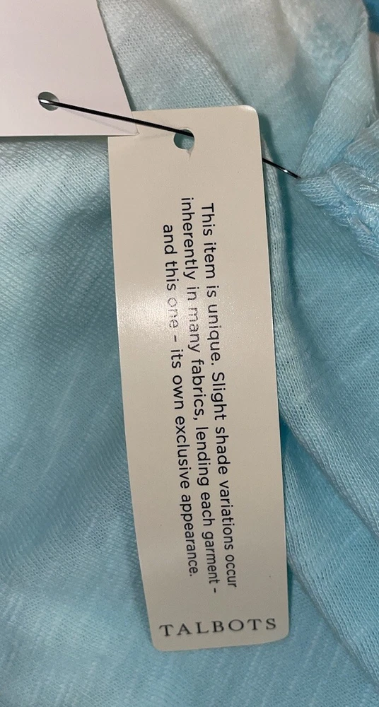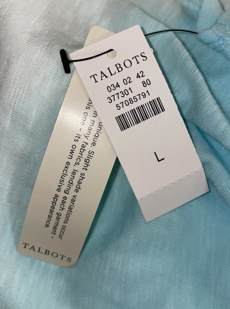 DETAILS Part of T by Talbots, our most comfortable collection ever! Our lightweight t-shirt with just-right cap sleeves. Designed with an of-the-moment dip dye finish and side slits at the hem. Pairs perfectly with any of our T by Talbots bottoms. EXCELLENT CONDITION Measurements (in inches): Pit to pit - 19 Width at bottom - 22 Back collar to bottom - 24.5 Measurements may not be exact as I am not a seamstress, just a woman with a tape measure. As shown in photos. Photos are of the actual sweater you will receive, not stock photos, with the exception of photo 2. Note that there may be color shade and hue variances due to different monitors and device settings. I do my best to state colors accurately, but different shades of the same color family can be pretty subjective. Smoke free home and fast shipping. Sales are final. Please message me for any additional measurements you'd like before purchasing. A sale may be cancelled if payment is not received within 48 hours. Although I have handling set to three days, your item will most likely be shipped the day after purchase. If my handling time is currently more than three days, then I am away from my store spending time with family for a few days. I will message you after purchase with the date I will be mailing your item. If you need your item by a specific date please message me before purchase to make sure I can accommodate you. Thank you for looking.