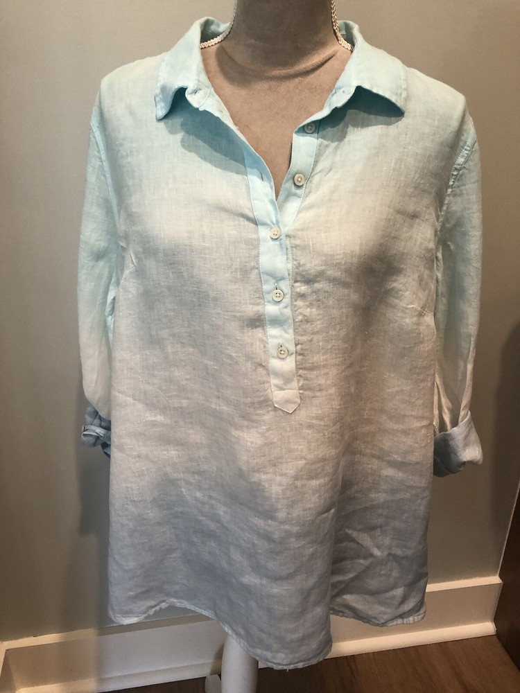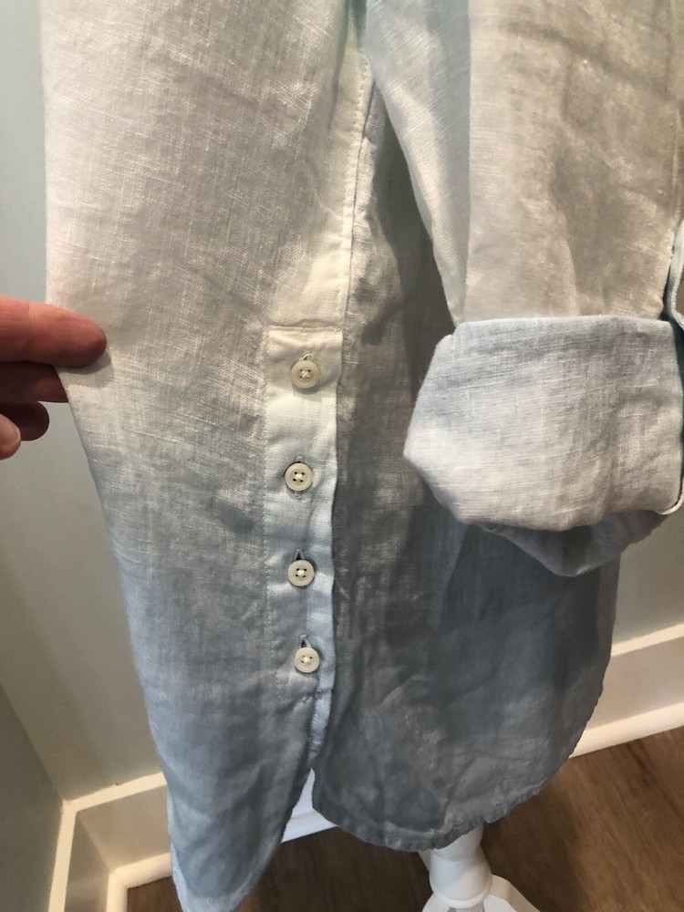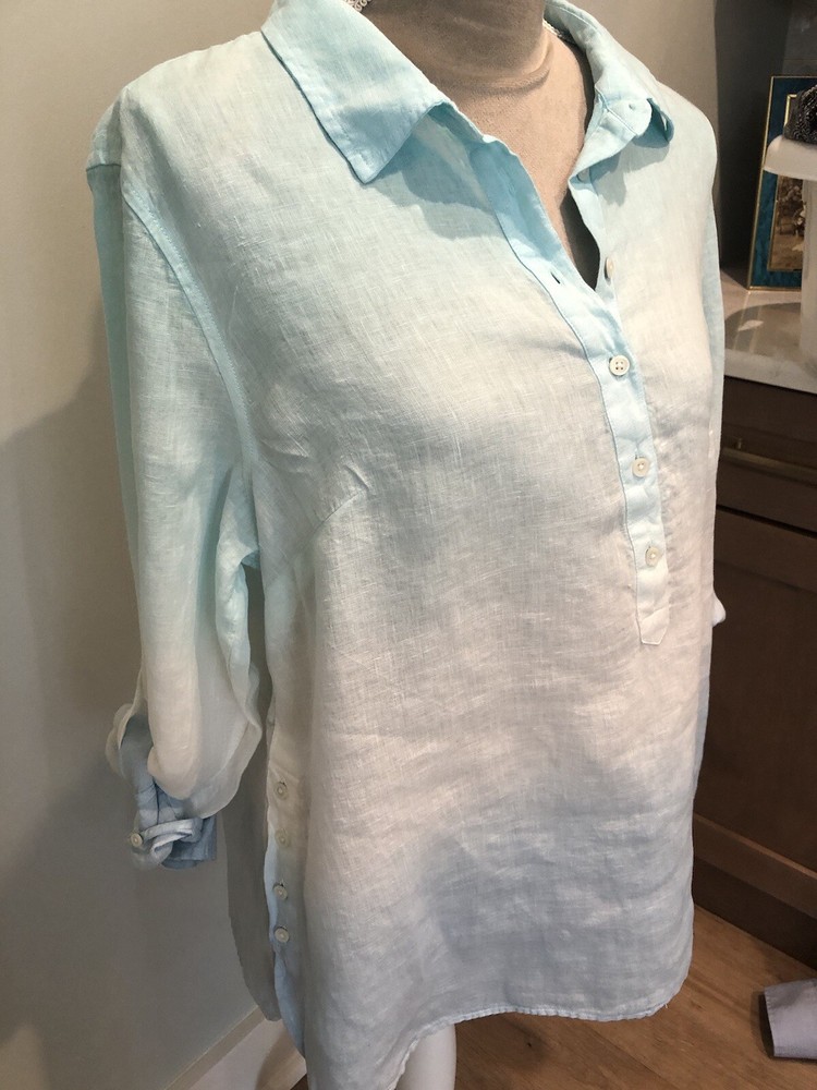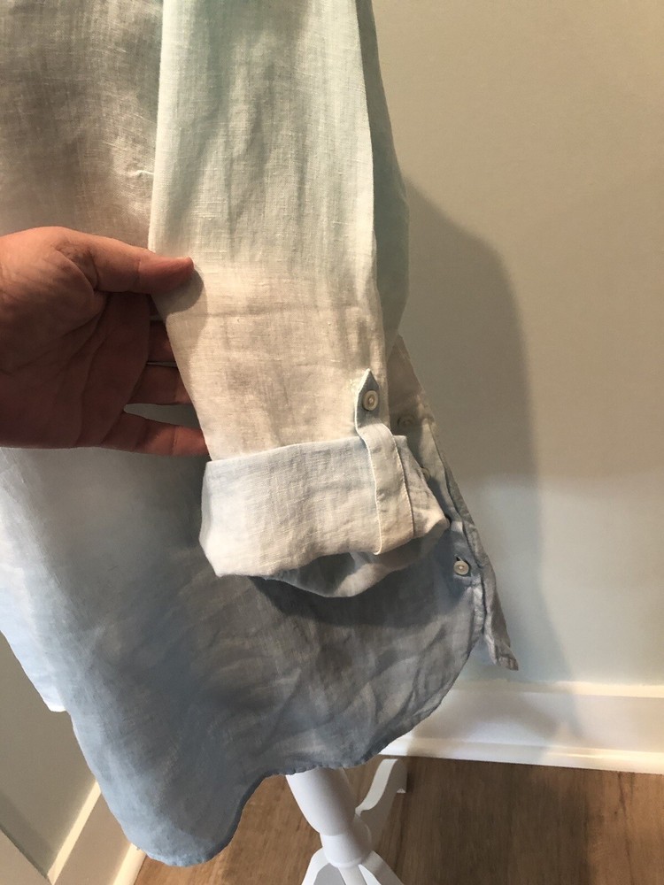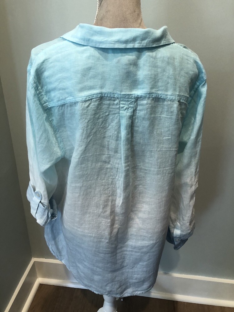 This beautiful Talbots shirt is perfect for any occasion. The blue ombre dip dye linen material gives it a beachy and bohemian feel, while the roll tab sleeves add a classic touch. With its XL size and petite fit, it's a great addition to any woman's wardrobe. The shirt's button-up style, versatile color, and comfortable material make it a must-have for any fashion-forward individual. New with tags attached. Size XL petite. Very nice shirt. Could be a swim coverup too. Smoke free home. Bundles & offers welcomed