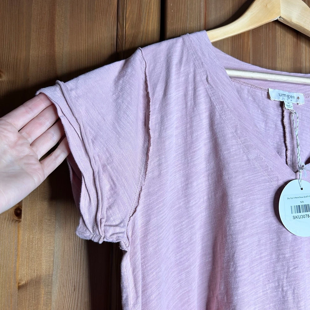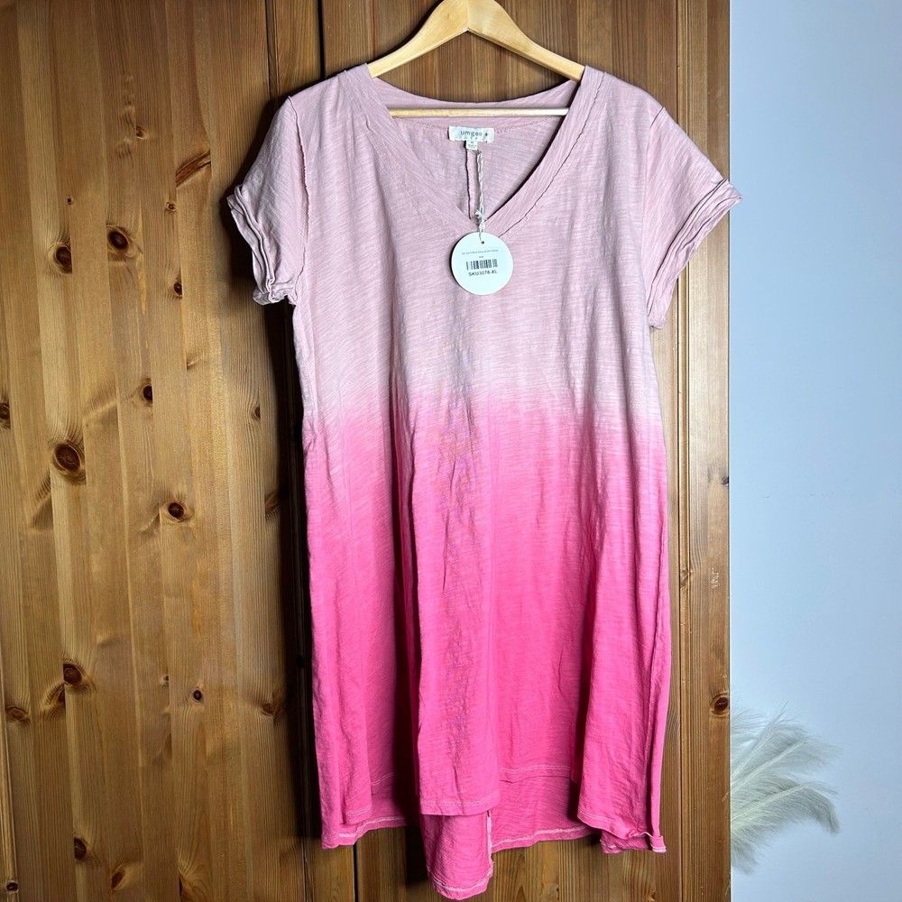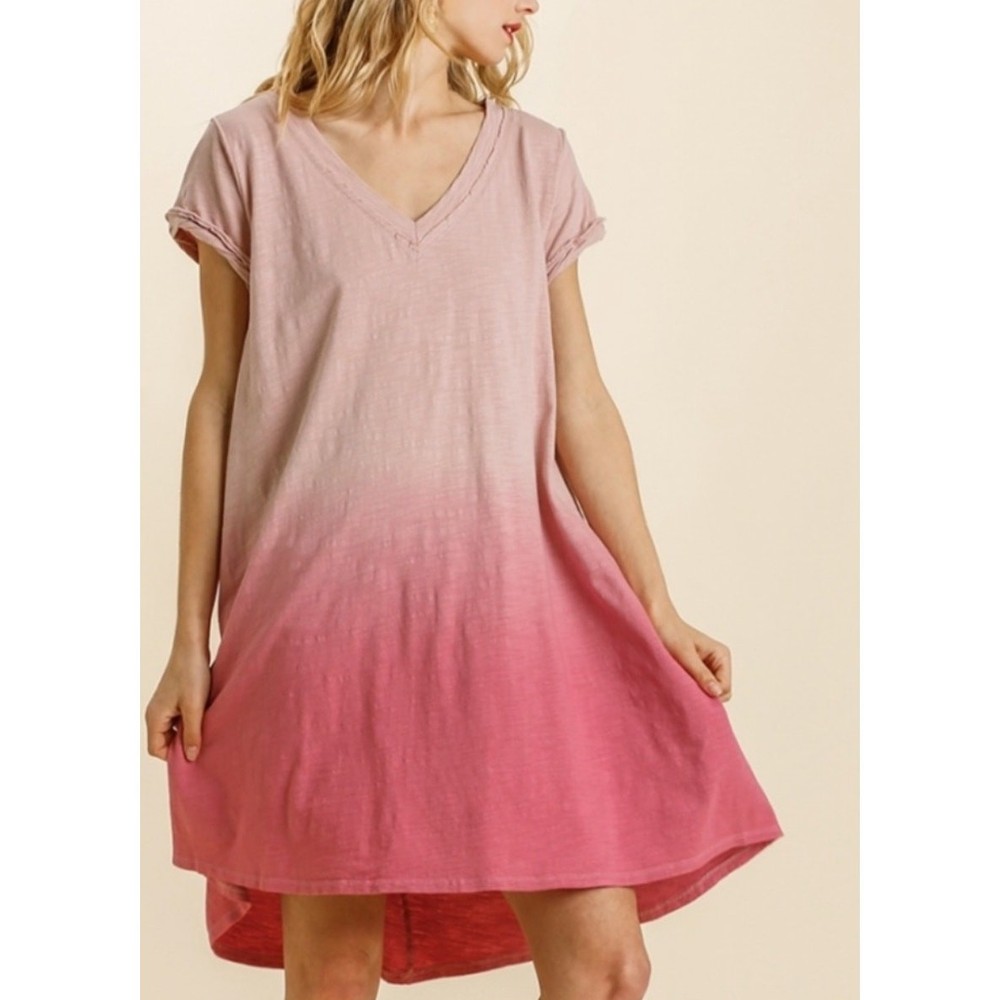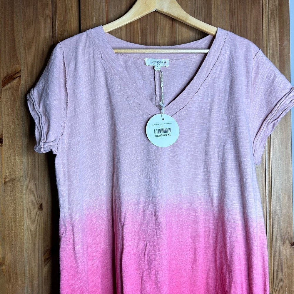 <![CDATA[<div>Super Fast Shipping: All orders ship next business day! Umgee Dip Dye V-Neck Dress Mini length Pink Ombré Short sleeve Exposed hem Style profile: Boho Chic Beachy Hippie Lagenlook Spring Summer Barbie New with tags/ Excellent condition, no visible flaws Color: Dusty rose (pink) Size: Women’s X-large Materials: Cotton
