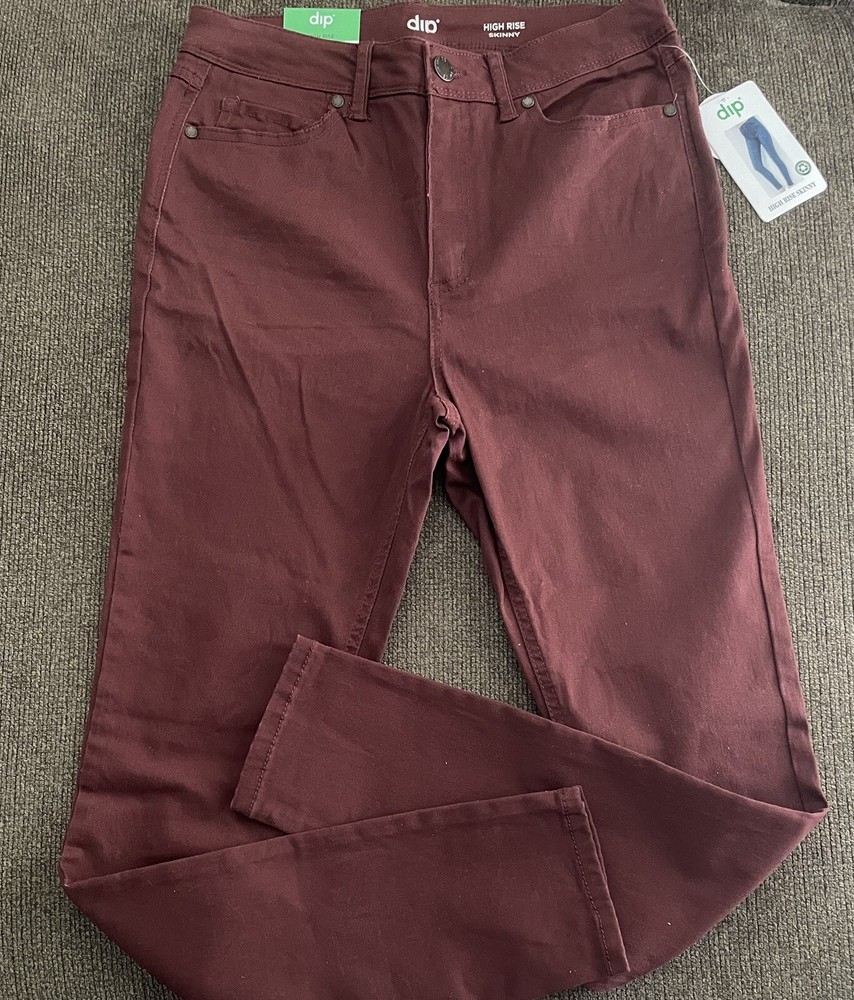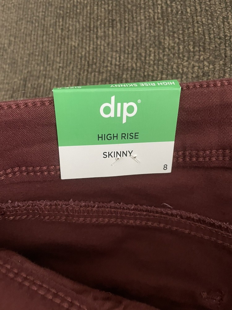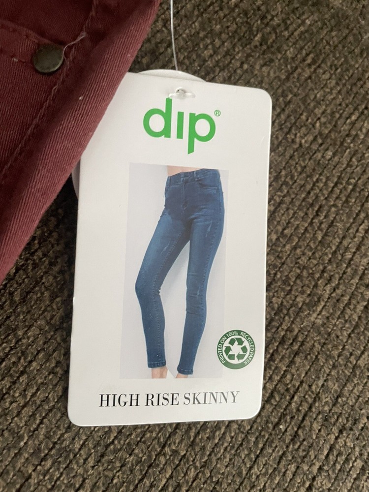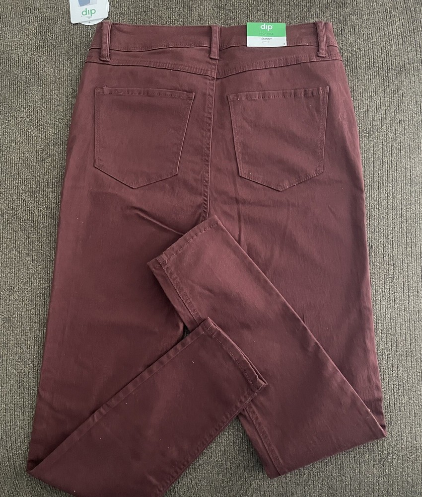 Elevate your wardrobe with these fashionable DIP high rise skinny jeans in a beautiful burgundy color. The jeans are designed with a solid pattern, zip/button closure with pockets for added comfort. The spandex and cotton materials ensure a slim fit and easy machine wash care. These jeans are perfect for any season and occasion, whether it's for a casual day out or a night out on the town. With a waist size of 28 inches and a high rise of 11 inches, these jeans provide a flattering look for any body type. Upgrade your style with these versatile jeans from DIP.