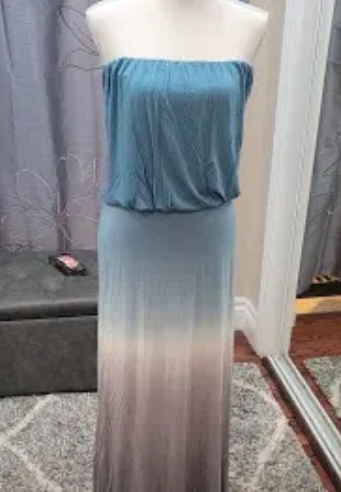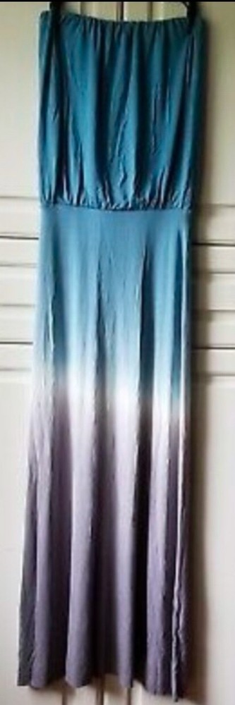 This NWT Young Fabulous & Broke strapless maxi dress in size L features a beautiful blue-gray dip dye design that is perfect for summer and spring occasions such as weddings, parties, or casual outings. The dress is sleeveless with a maxi length, making it a stylish and comfortable choice for warmer weather. The multicolor pattern adds a trendy touch to the dress, making it a versatile option for various events.