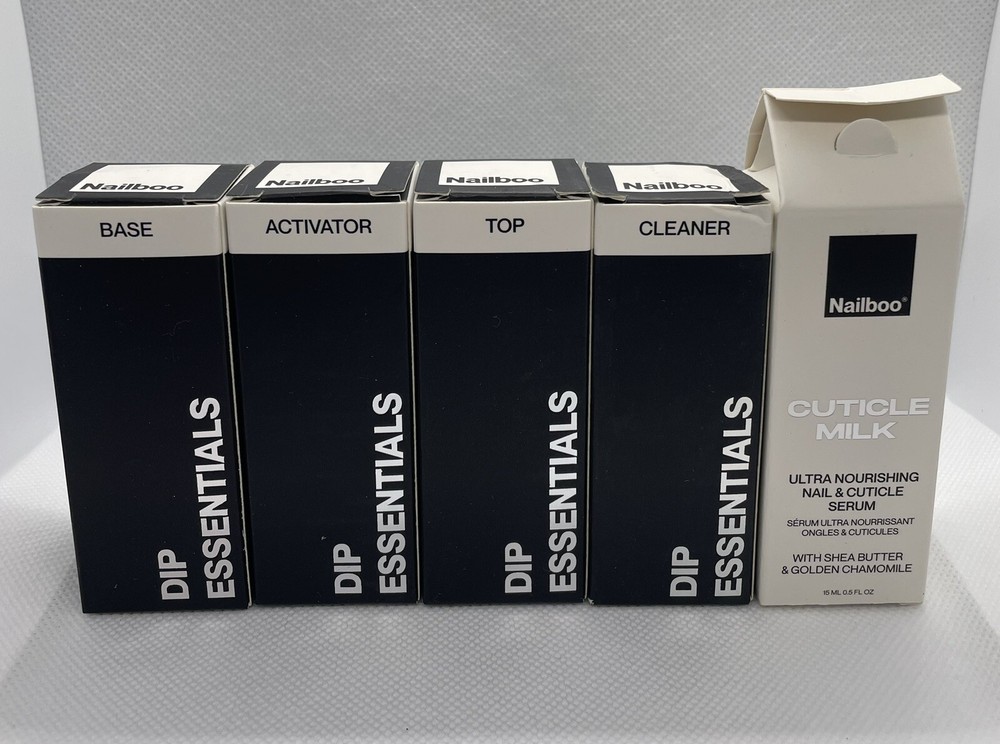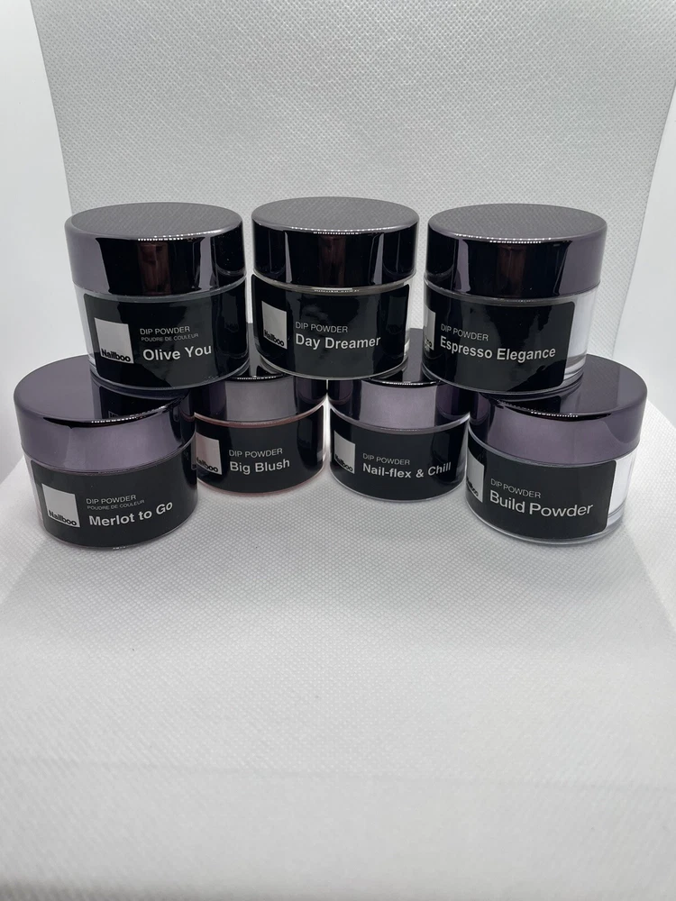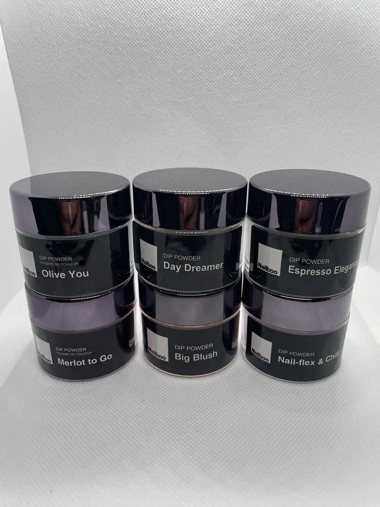 Here is a large Nailboo Dip Powder nails kit. Only used this kit once! You will get 6 different powder dip colors along with all the items listed below! **Package was opened and used only once** All items in the kit are band new and majority of them are sealed. Since I used this kit once, the build powder and Olive you powder dip are unsealed. Nailboo Kit includes: 0.5 oz Cuticle milk, ultra nourishing nail & cuticle serum 0.5 oz Dip Essentials x 3: Base, Top and Activator. 10 finger clamps 2 extra nail paint brushes Nail buffer/file with 4 surfaces Powder brush Cuticle tool Brush Saver Cleaner Simple instruction guidebook 1 jar Build Powder (BP) 1 jar Dip Powder color in Big blush (pink blush) 1 jar Dip Powder color in Merlot to go (burgundy) 1 jar Dip Powder color in Daydreamer (gray) 1 jar Dip Powder color in Olive you (forest green) 1 jar Dip Powder color in Nail-flex & chill (light pink) 1 jar Dip Powder color in Espresso Elegance (cocoa) 15% off coupon for a friend included in the kit!