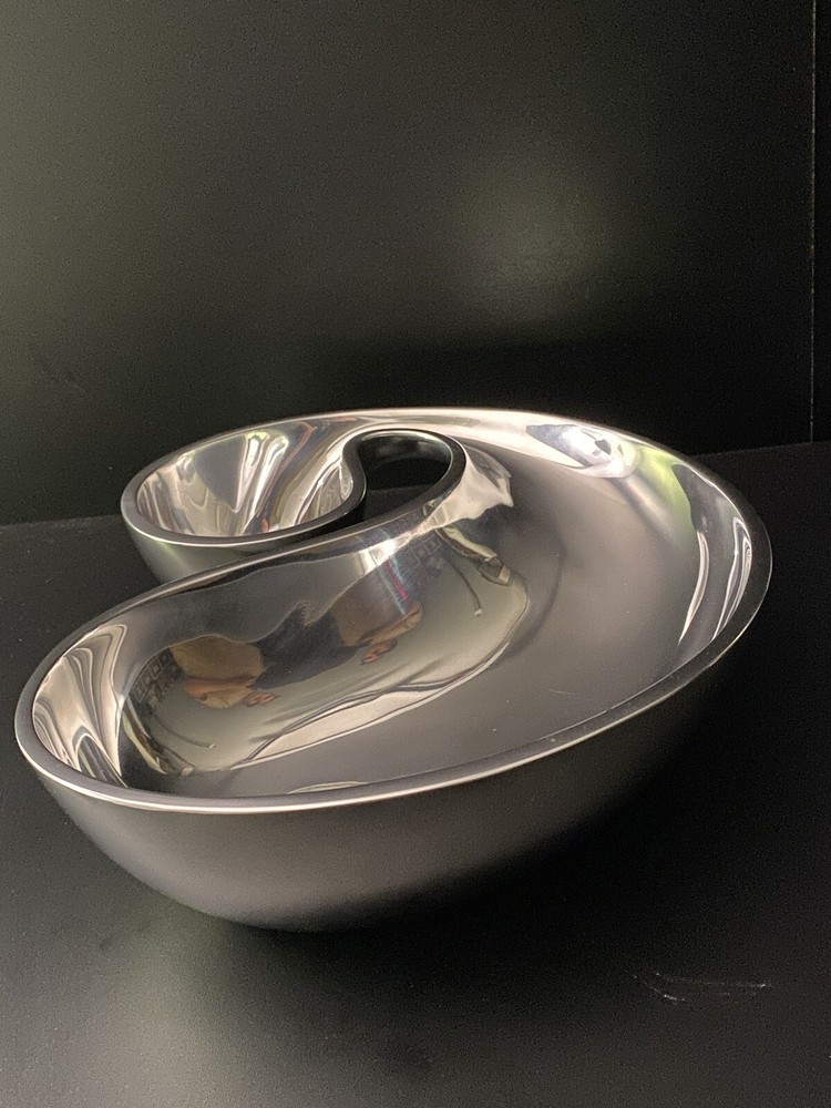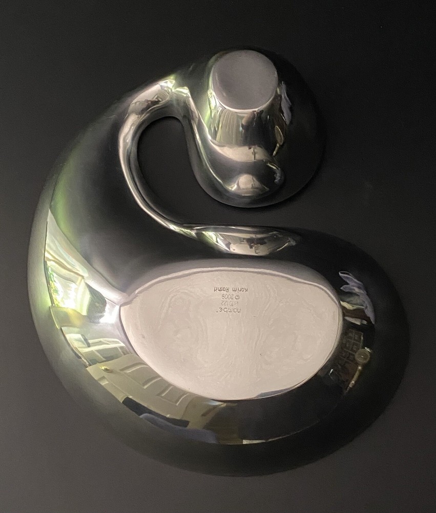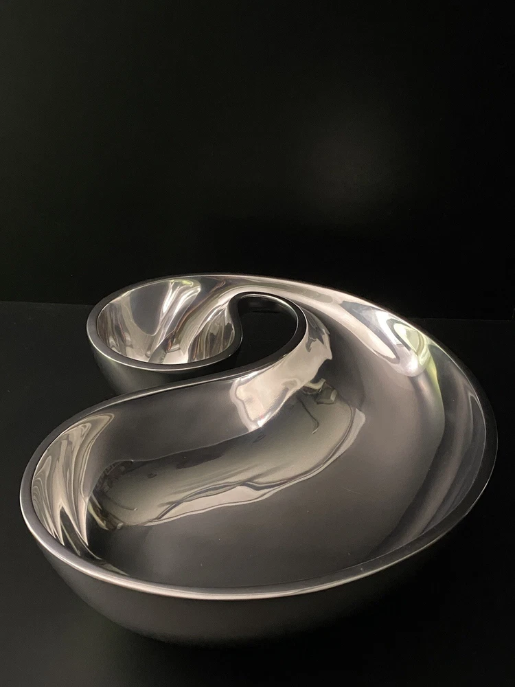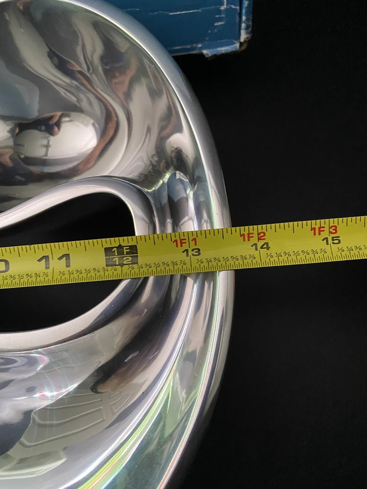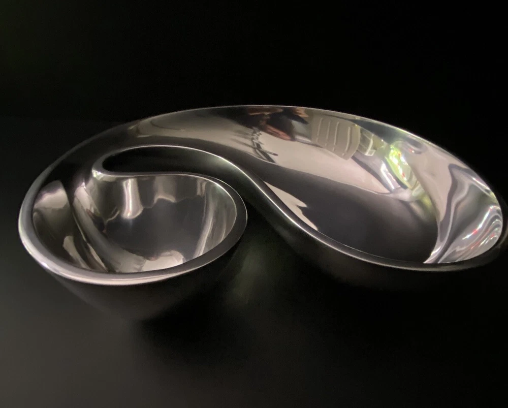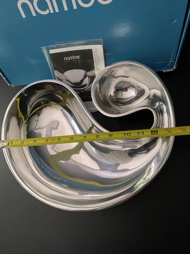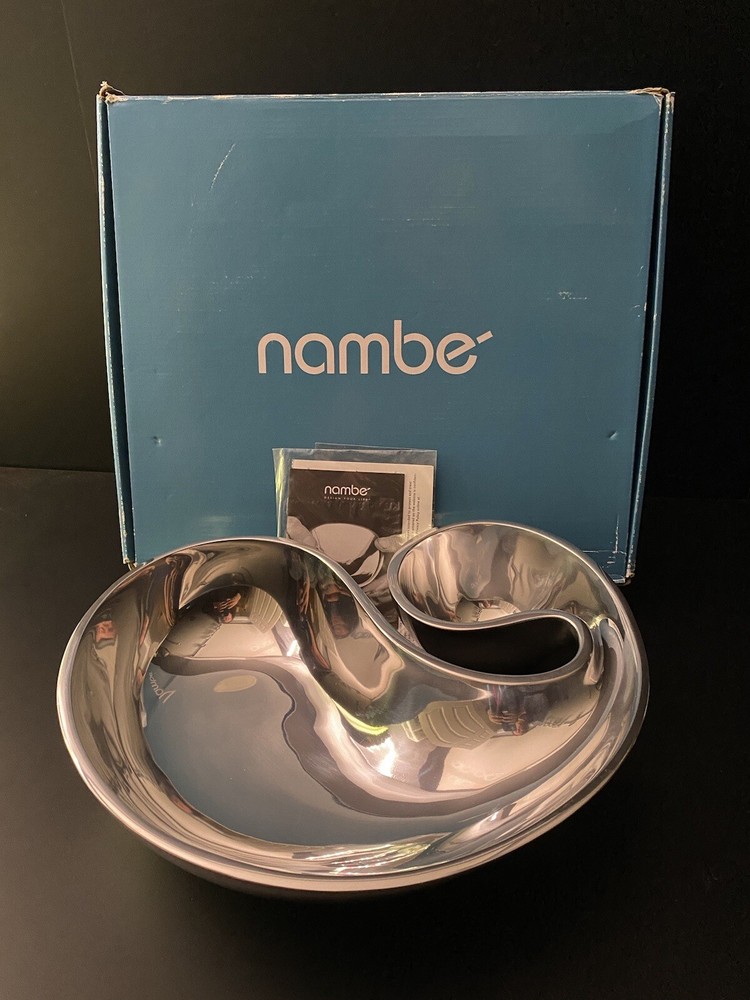 Add some modern art to your tableware collection with this Nambe 2009 Morphia (Morphik) Chip & Dip Tray Bowl. The abstract shape designed by Karin Rashid and shiny silver color make it a perfect addition for all festive, classy and fun occasions like weddings, retirements, anniversaries, Christmas, Diwali, and Thanksgiving. This large tray, measures approximately 14 inches in length x 9.75 inches in width x 3 inch deep is perfect for serving chips and dip or tapas. It is made of durable aluminum alloy and has a chrome finish that adds to its modern style. This Nambé tray is a great choice for bridal showers, weddings, holidays or any party. This elegant and unique tray / platter / bowl is brand new in box and comes with original paperwork. Impress your guests with this stylish and functional tray. Or give it to someone special as a great gift. Condition: This truly cool and gorgeous piece is in true new condition with no scratches or scarring of any kind. It comes with the original paperwork still in plastic and with the original box. Please note that there is some storage wear on the box and some fraying where the tab goes into the box to close as seen in pictures.
