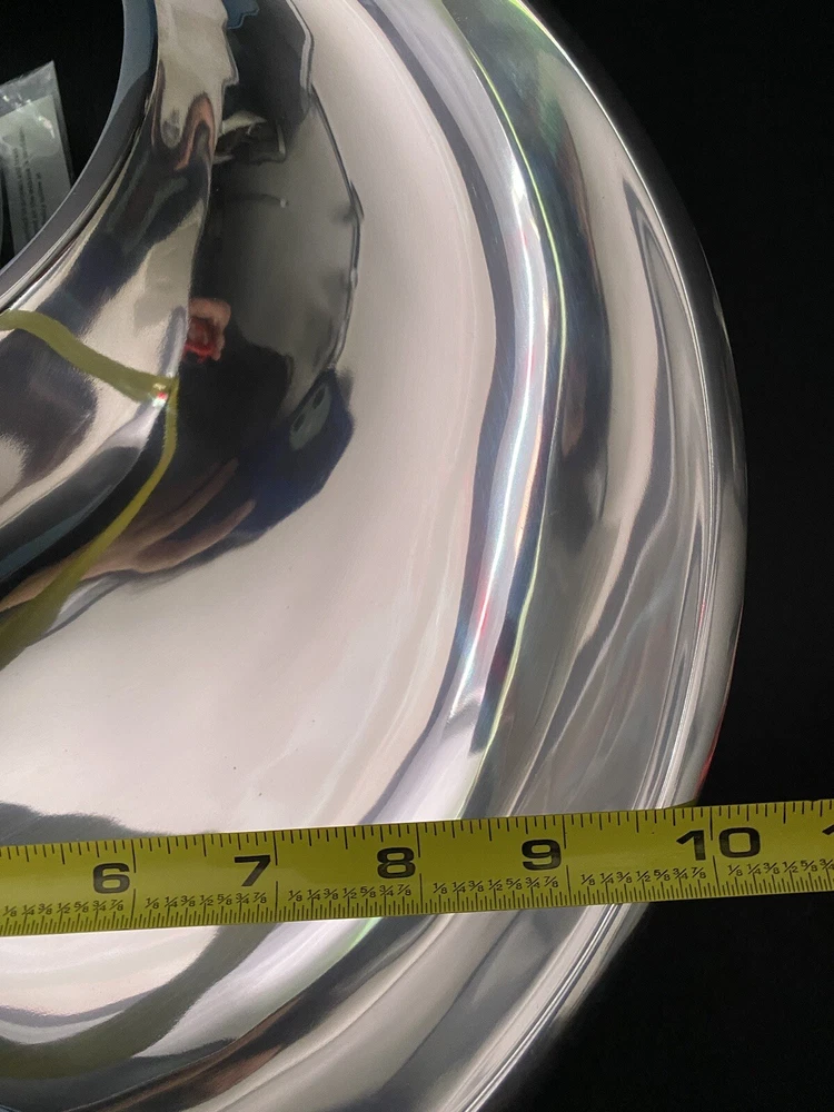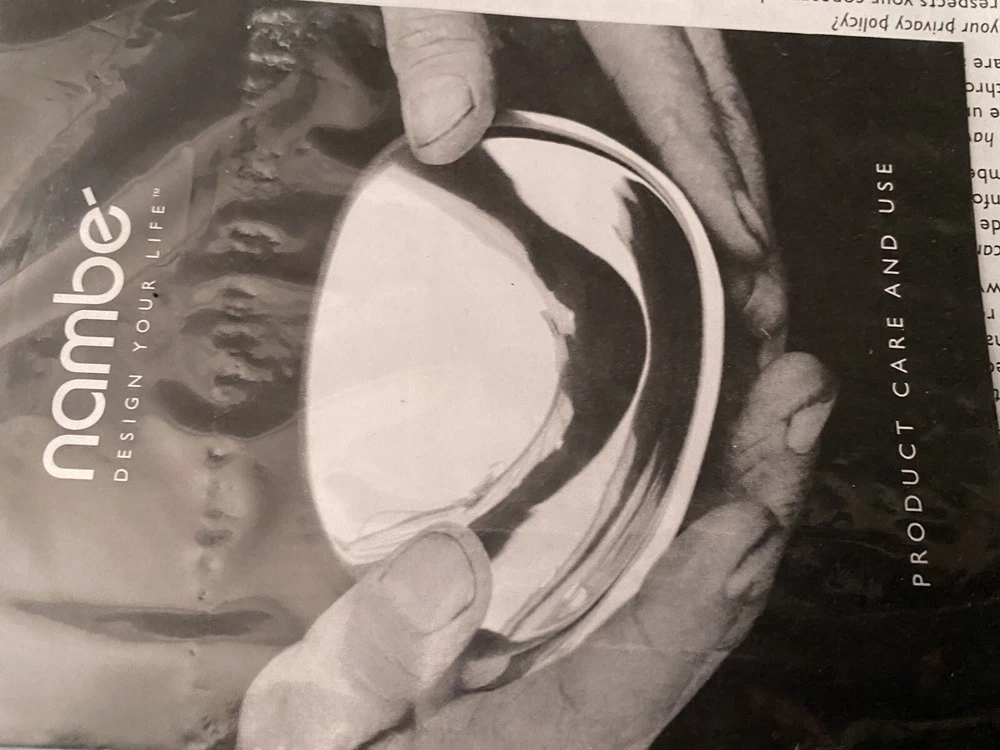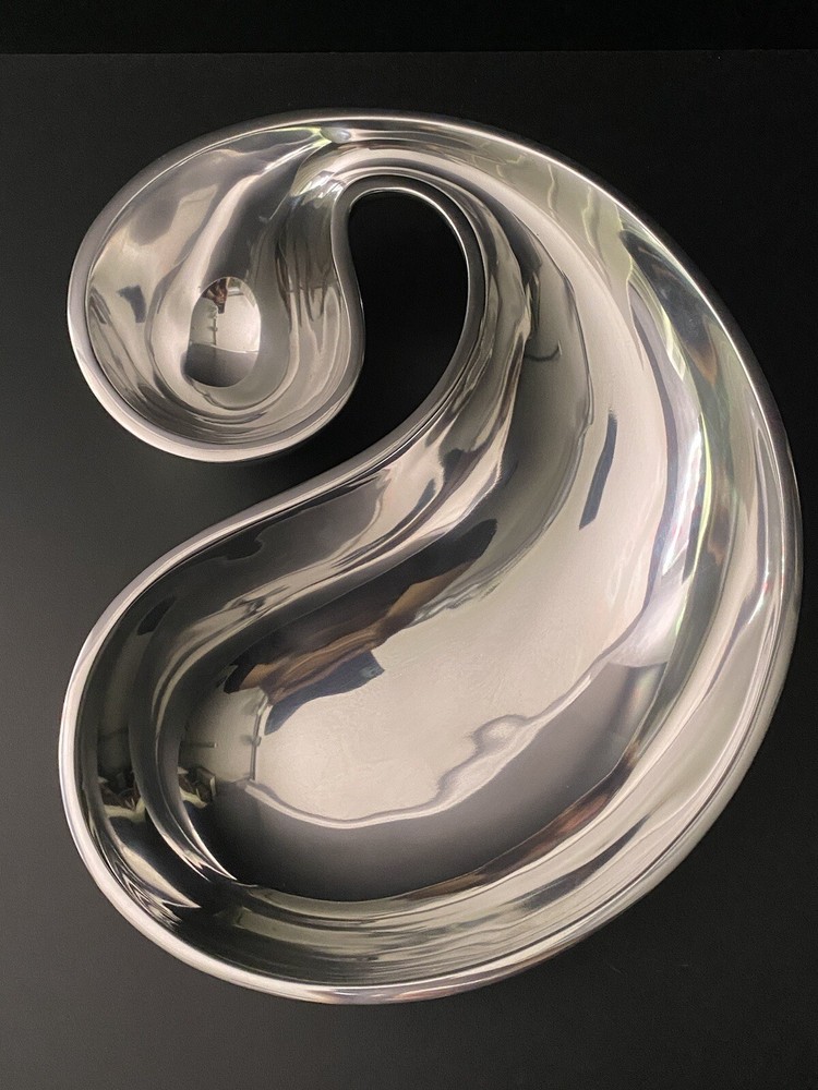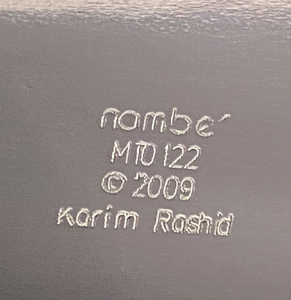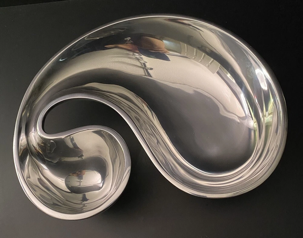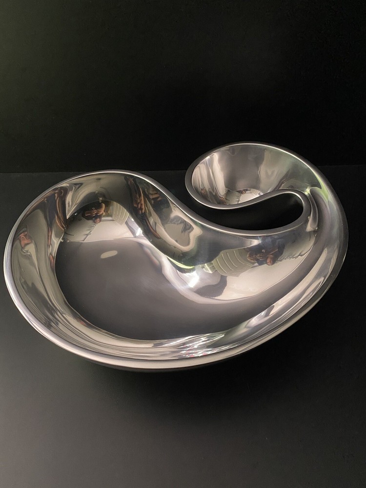 Add some modern art to your tableware collection with this Nambe 2009 Morphia (Morphik) Chip & Dip Tray Bowl. The abstract shape designed by Karin Rashid and shiny silver color make it a perfect addition for all festive, classy and fun occasions like weddings, retirements, anniversaries, Christmas, Diwali, and Thanksgiving. This large tray, measures approximately 14 inches in length x 9.75 inches in width x 3 inch deep is perfect for serving chips and dip or tapas. It is made of durable aluminum alloy and has a chrome finish that adds to its modern style. This Nambé tray is a great choice for bridal showers, weddings, holidays or any party. This elegant and unique tray / platter / bowl is brand new in box and comes with original paperwork. Impress your guests with this stylish and functional tray. Or give it to someone special as a great gift. Condition: This truly cool and gorgeous piece is in true new condition with no scratches or scarring of any kind. It comes with the original paperwork still in plastic and with the original box. Please note that there is some storage wear on the box and some fraying where the tab goes into the box to close as seen in pictures.