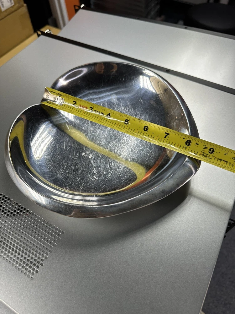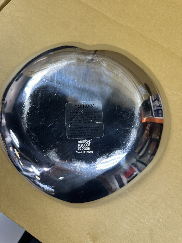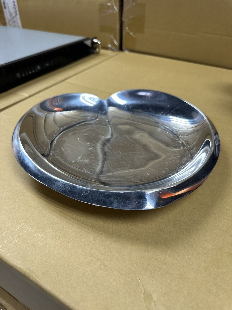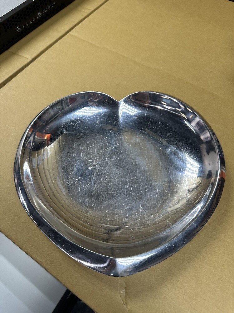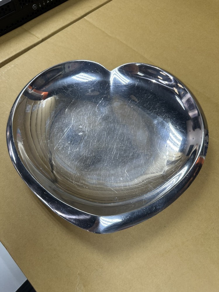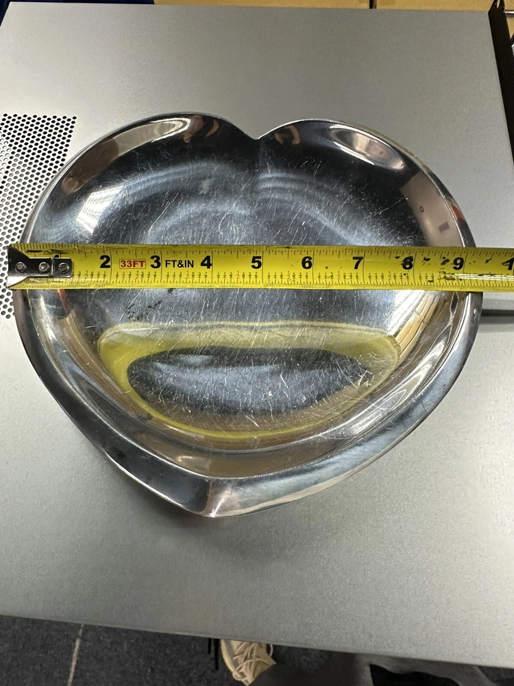 You are previewing a 100% authentic Nambe Heart Plate from the 2009 Sean O’Hara collection. This piece has been used and has visible scratching throughout. It was used as a tray for keys so please note that is where the scratches derive from. The finish is a bit scuffed/tarnished in some spots as well. Most likely it just requires a good cleaning or polishing. The original nambe sticker is still attached to the bottom of this piece as can be seen in the listing photos.